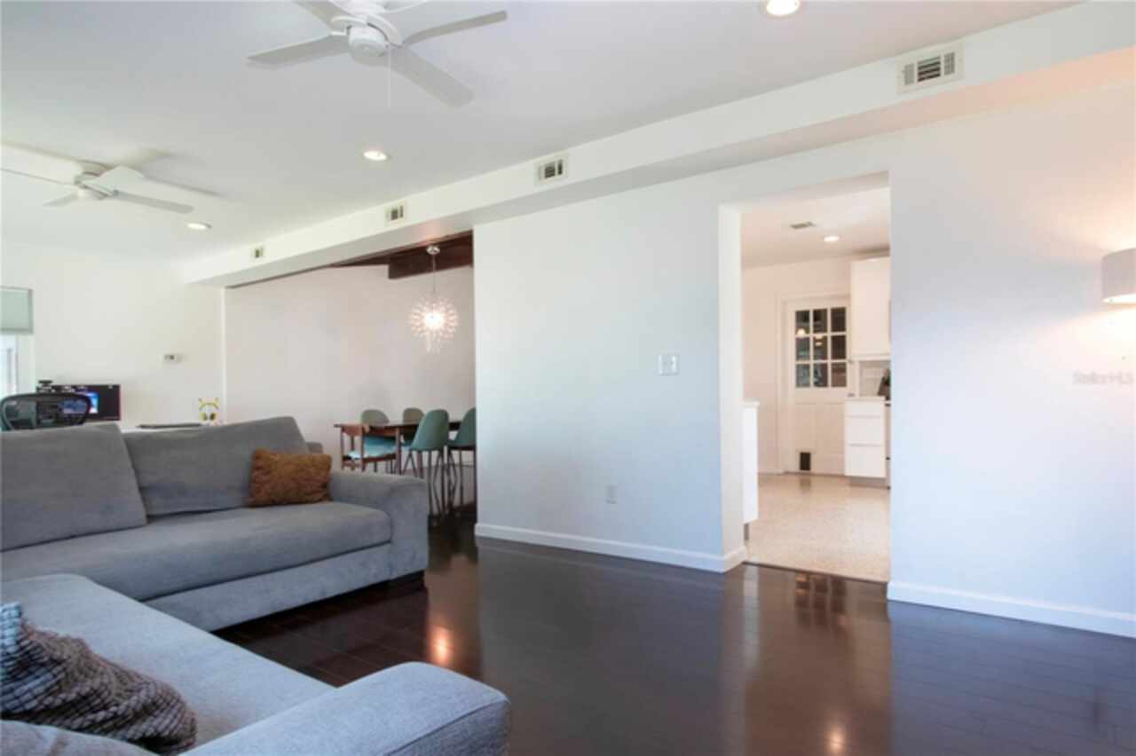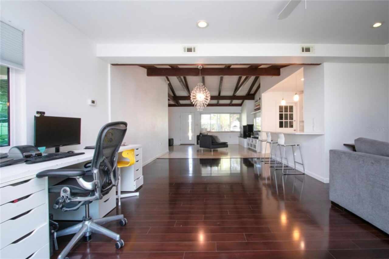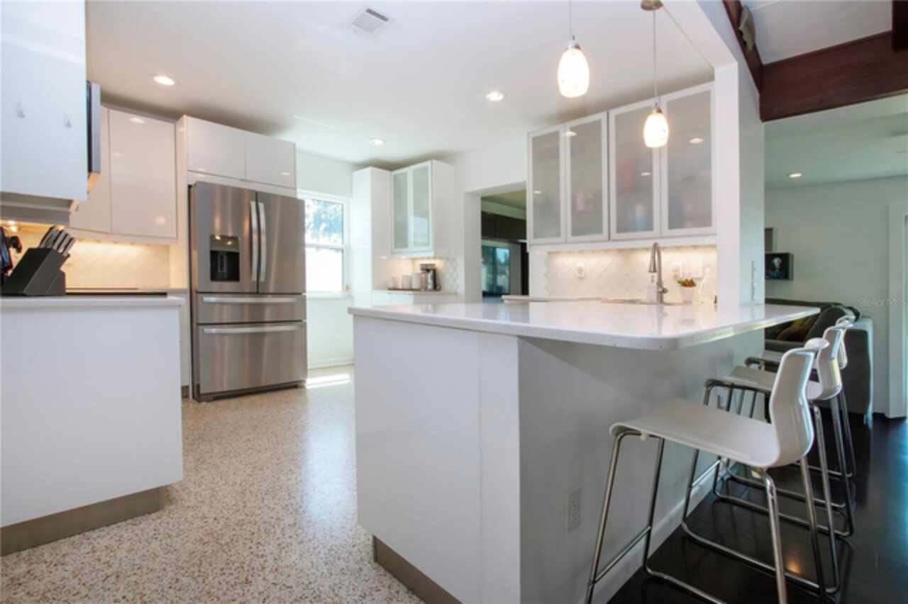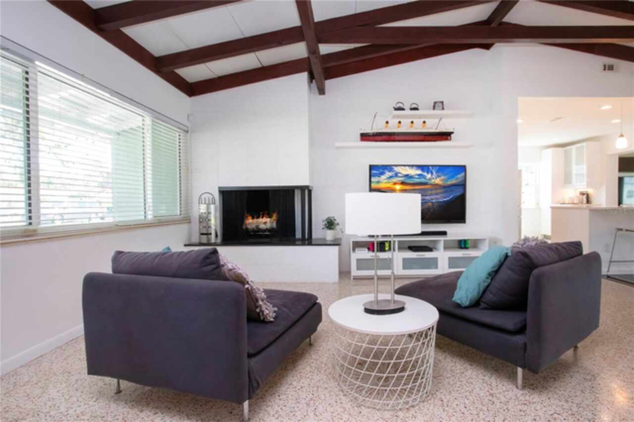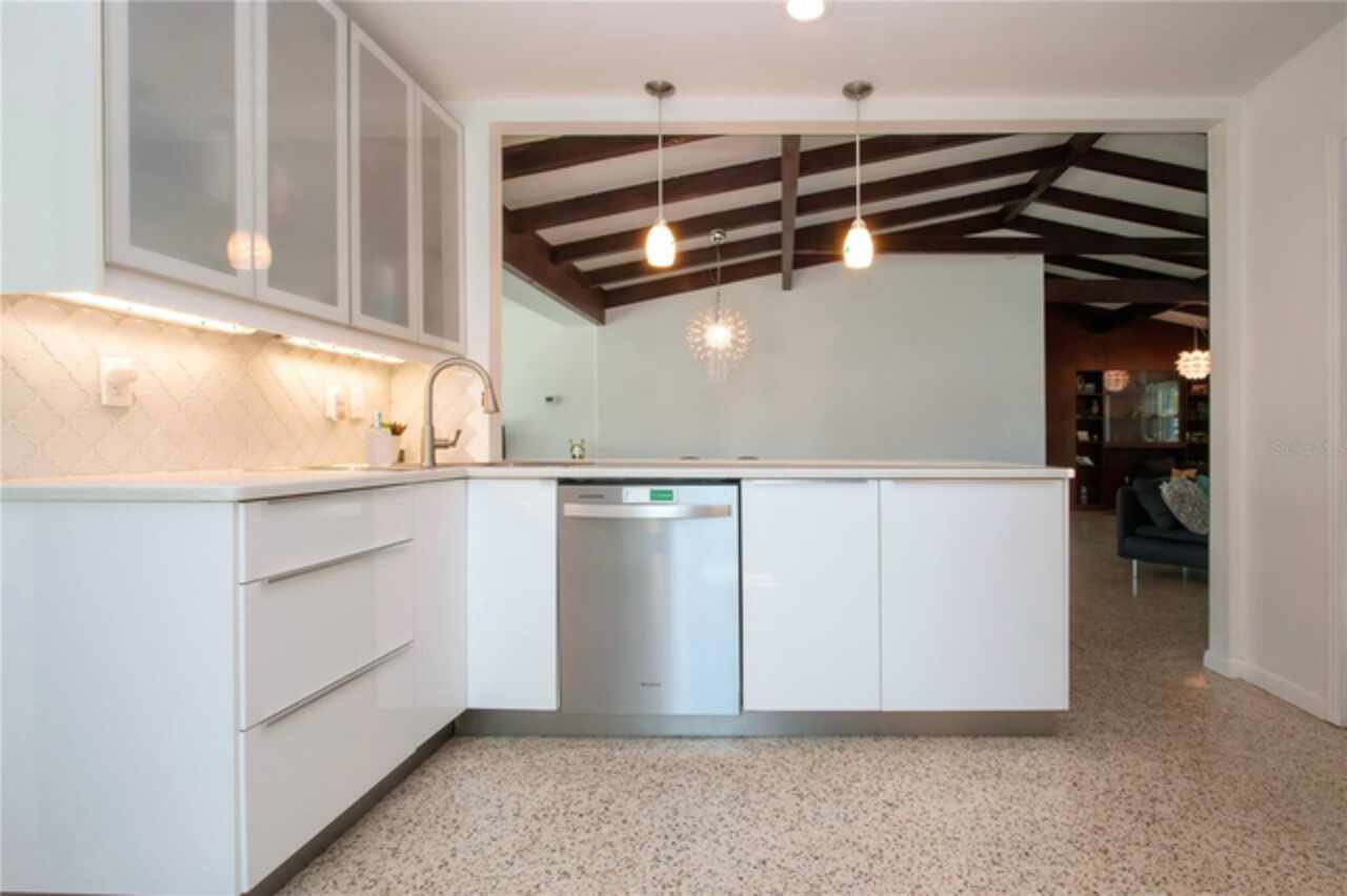 One or more photo(s) has been virtually staged. BACK ON THE MARKET WITH A SIGNIFICANT PRICE REDUCTION!!! Don't let the modest exterior fool you...the drama is inside!! This mid-century home has been completely updated both inside and out! As you enter the home, you are met with soaring cathedral ceilings with exposed beams. The spacious kitchen has been completely updated with sleek modern cabinets, backsplash and quartz counters. The large bar is the perfect spot for the family to gather. The mid century architecture continues with gleaming terrazzo floors, a cool wood-burning fireplace and built-ins in one of the two living areas. A family room addition provides plenty of casual living space as well as easy access to the large private back yard (room for a pool). This home has been made hurricane ready with NEW ROOF WITH EXTRA HURRICANE STRAPS, NEW IMPACT RESISTANCE WINDOWS AND DOORS, TWO NEW AC SYSTEMS, EXTRA ATTIC INSULATION and a SECURITY SYSTEM. Plumbing and electric upgraded in 2014... Walk to Southside School and Brookside Middle School, bike to the beach while enjoying easy access to downtown restaurants and shops.