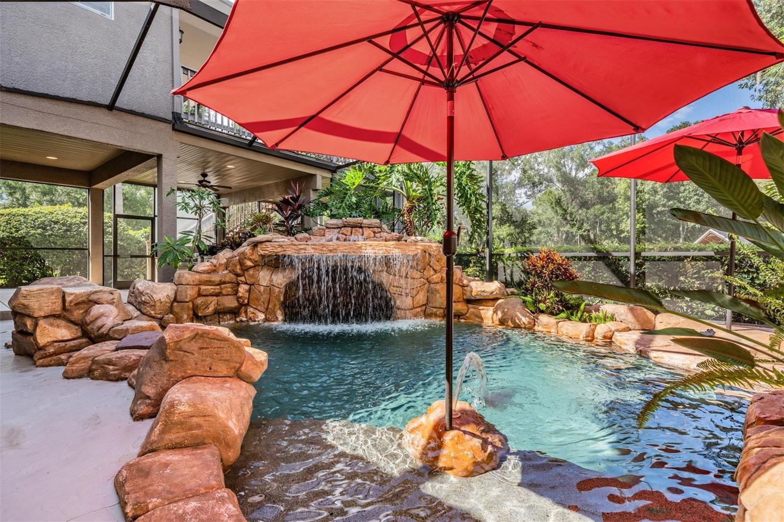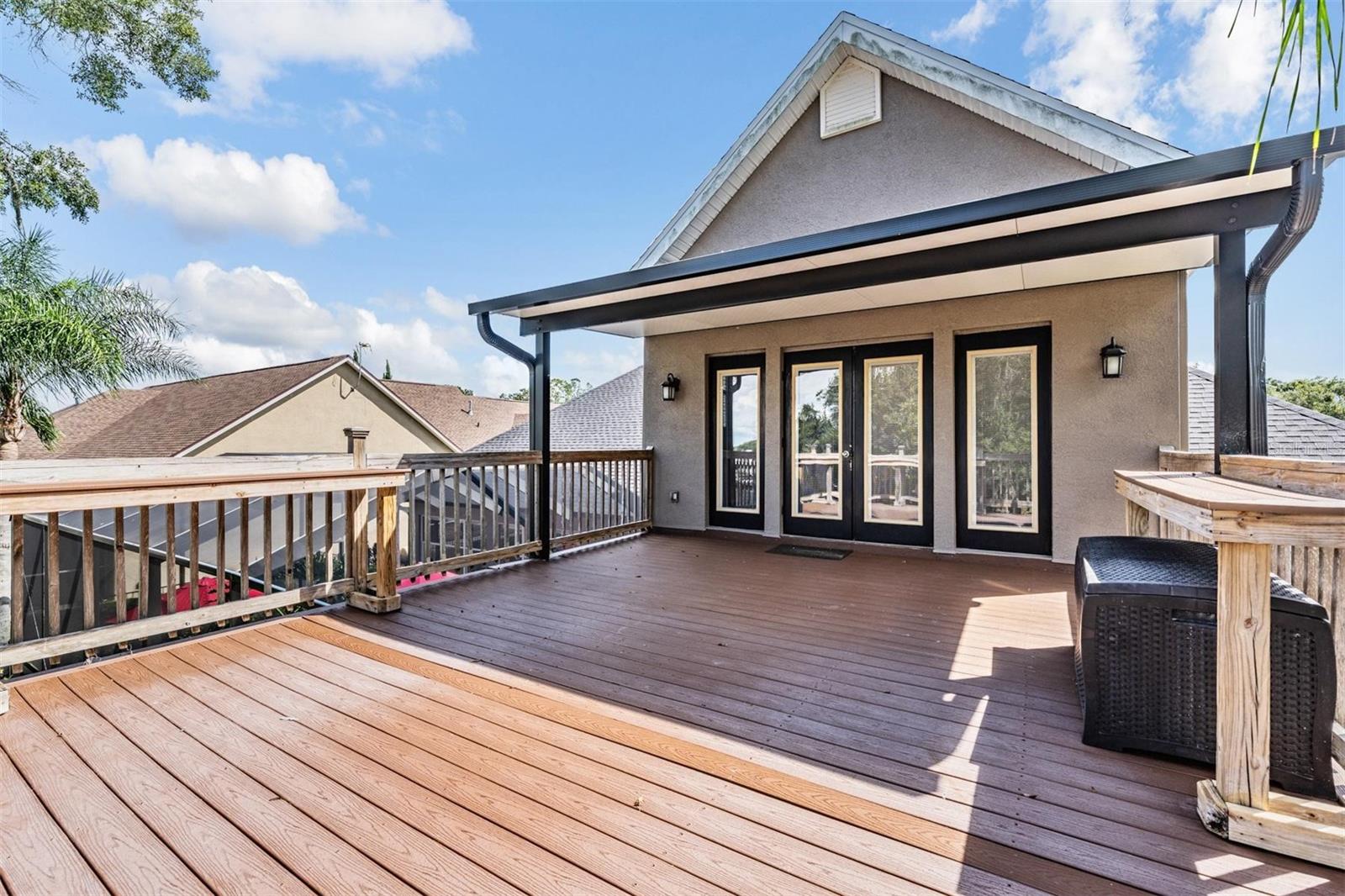 Welcome to this one-of-a-kind waterfront estate in the highly sought-after Lake Padgett community, offering deeded water rights on two parcels that extend directly into the lake, a rare ownership opportunity for both land and water rights. The home has been updated for peace of mind with a new roof, newly screened enclosure, and a rebuilt dock with upgraded decking and roof. Parking and storage are a dream with an attached two car garage, a detached one car garage with a soaring 9 foot door, plus an additional golf cart garage tucked behind the detached bay. Step through the front door into more than 3, 200 square feet of heated living space, where tall ceilings and expansive windows create a bright and welcoming atmosphere. The main home features four bedrooms and three bathrooms, including a private upstairs bedroom with its own bath, perfect for guests or multi-generational living. The kitchen is the centerpiece of the home, offering rich wood cabinetry, granite countertops, a central island, stainless steel appliances, a built in wine rack, and plenty of counter space. From here, the floorplan flows easily to both casual and formal living spaces, all oriented toward the water. The primary suite is spacious and serene, with crown molding, a spa like bath, and a custom built walk in closet. Secondary bedrooms provide flexibility for family and guests. Plus a sperate office space downstairs. Outdoor living is where this estate truly shines. The screened lanai opens to a resort-style pool and spa with rock waterfall and lush landscaping. The outdoor kitchen is fully equipped for gatherings, featuring a built in grill, a large Green Egg smoker, fireplace, mini fridge, and a mini sink with running water. Above the lanai, accessible only by a private exterior stairway, is an additional 500+ square foot bonus room, complemented by a second story deck for elevated entertaining. This is a versatile space ideal for a game room, poker lounge, theater, or cigar room with its own mini-split AC. Life here means direct access to Lake Padgett’s three lakes, well-known for boating, skiing, and fishing, along with the privacy and space of a rare waterfront estate. This home blends thoughtful updates, rare land and water rights, flexible living spaces, and true resort-style outdoor amenities, making it an incomparable offering in Land O’ Lakes.