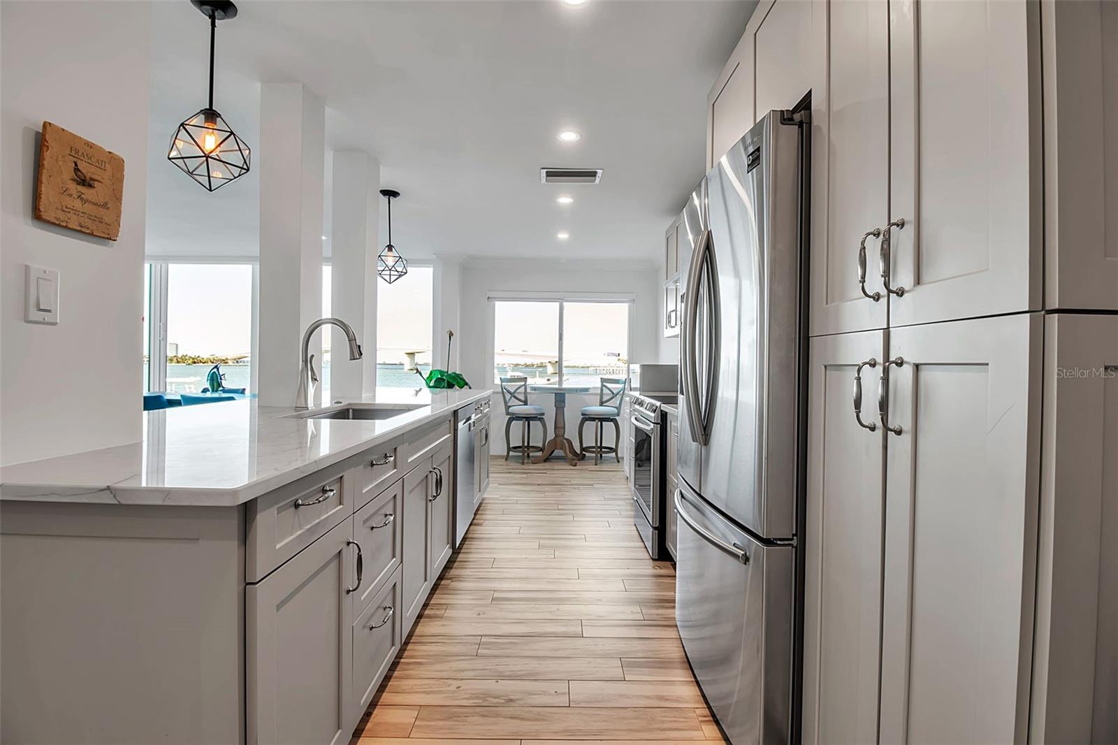 With panoramic water views and a refined coastal aesthetic, this Sarasota Bay–facing condominium on Golden Gate Point offers an exceptional balance of style, comfort, and location. The residence comes furnished and boasts an open floor plan designed to maximize natural light and stunning vistas through impact windows. Remote-controlled blinds, soft neutral tones, and crown molding establish an elegant coastal palette, while porcelain tile flooring flows seamlessly throughout. The kitchen serves as the home’s centerpiece, showcasing marble countertops, a stylish tile backsplash, and an expansive island with seating, perfect for entertaining or casual dining. Soft-close cabinetry pairs beautifully with Samsung stainless steel appliances, including a refrigerator, electric range, dishwasher, and counter-depth microwave. The adjacent living and dining spaces open to dramatic bay views that set the mood for colorful sunsets reflecting off the John Ringling Bridge. The primary suite is a serene retreat with plantation-shuttered windows, a custom California Closet system, and a spa-inspired ensuite bath featuring a marble-topped vanity, walk-in shower, and Wendell bidet toilet. The guest bedroom includes a California Closet system and frosted-glass barn doors, while the nearby full bath continues the modern design with a walk-in shower, marble vanity, natural light, and a matching Wendell bidet toilet. Additional highlights include an LG stackable washer and dryer, tankless water heater and assigned covered parking. Harbor House West also provides a day dock, ample guest parking, and a pet-friendly environment within a secure, well-managed community. Set within walking distance to the marina, Bayfront Park, and downtown Sarasota’s acclaimed restaurants, galleries, and theaters, this residence offers the ultimate blend of coastal serenity and urban sophistication, a front-row seat to the city’s most breathtaking sunsets and skyline views.
