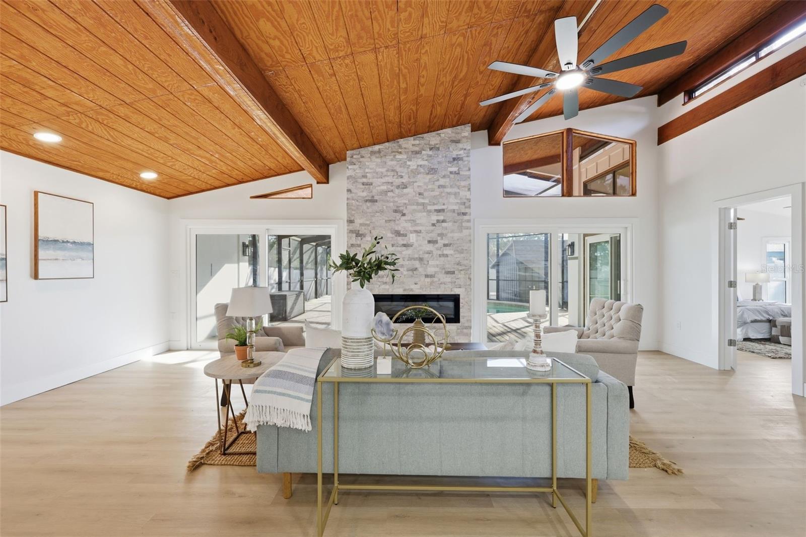Stunningly renovated 3-bedroom, 2-bath, 1, 738 sq ft Mid-Century–inspired home with a screened-in pool, located in one of St. Petersburg’s most desirable neighborhoods! This property at 228 87th Ave NE has been fully rebuilt post-flood with ALL new drywall, brand-new electrical and plumbing, updated HVAC, premium vinyl flooring, new modern appliances, and every upgrade brought up to current code—giving you the confidence and comfort of essentially new construction. Step inside to soaring ceilings with exposed beams, a showpiece stone fireplace, and an open-concept living space filled with natural light. The gourmet kitchen and bathrooms are completely updated with contemporary finishes, sleek fixtures, and high-design details. The oversized primary suite features vaulted ceilings, large windows, and direct access to the pool area. Outdoors, enjoy a fully screened-in pool with paver decking, perfect for year-round Florida living. Large sliders create seamless indoor–outdoor flow, and the fenced yard offers privacy and space for entertaining. The modern façade, fresh landscaping, and clean architectural lines create beautiful curb appeal. Located just minutes from downtown St. Pete, waterfront parks, boat ramps, schools, and top dining—this move-in-ready home offers turnkey, worry-free living in a prime location. A rare opportunity with a full-scale renovation and luxury upgrades throughout! Room measurements deemed approximate. To be checked by buyer