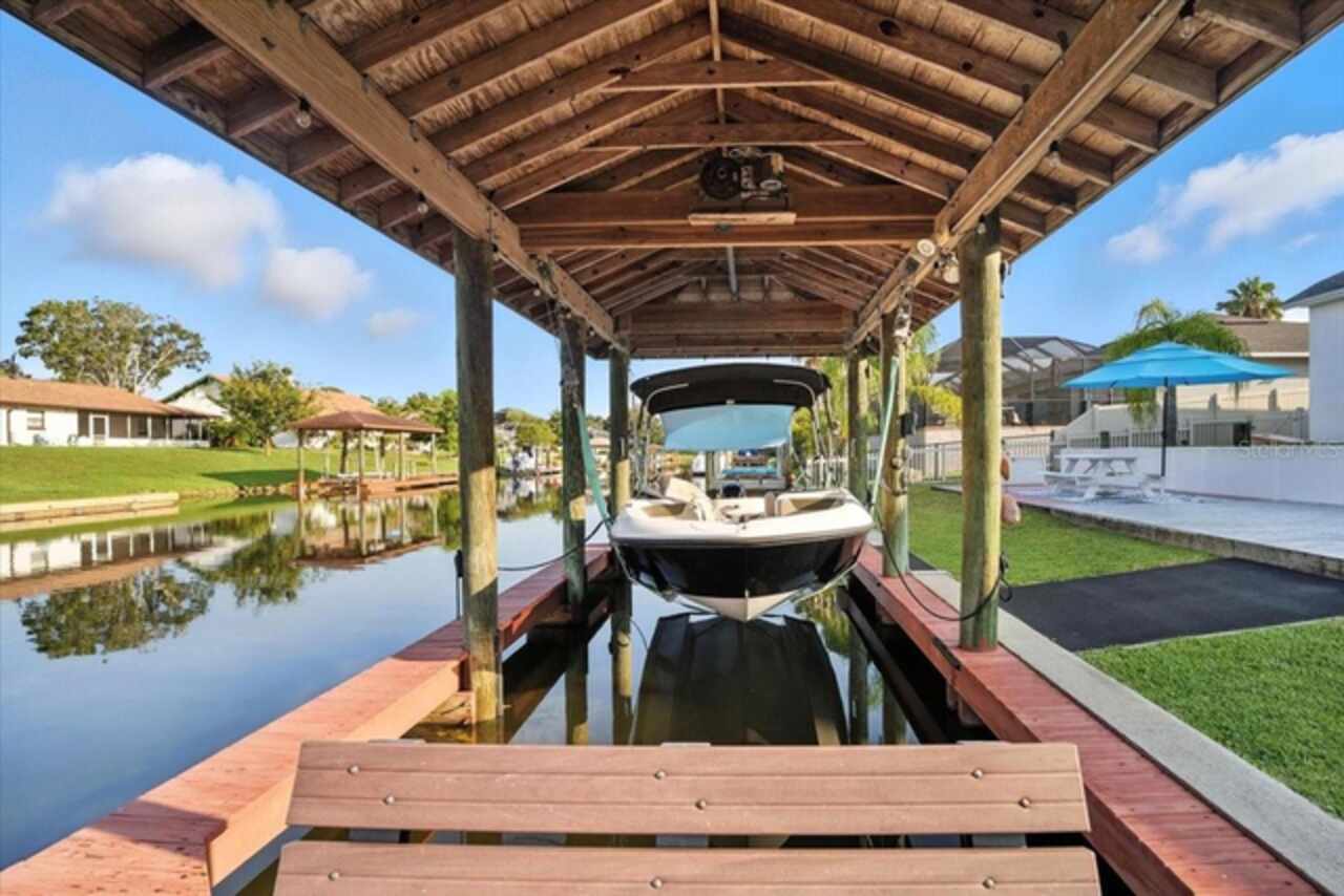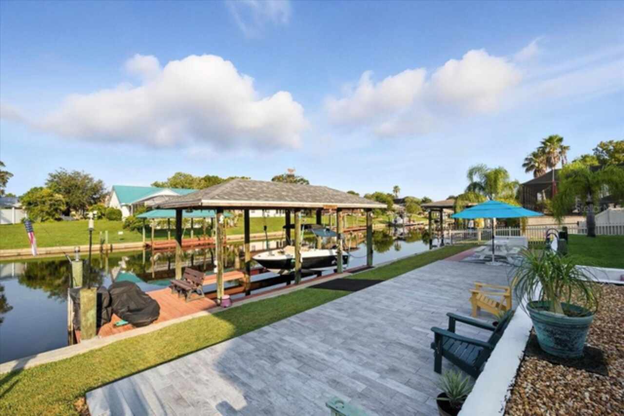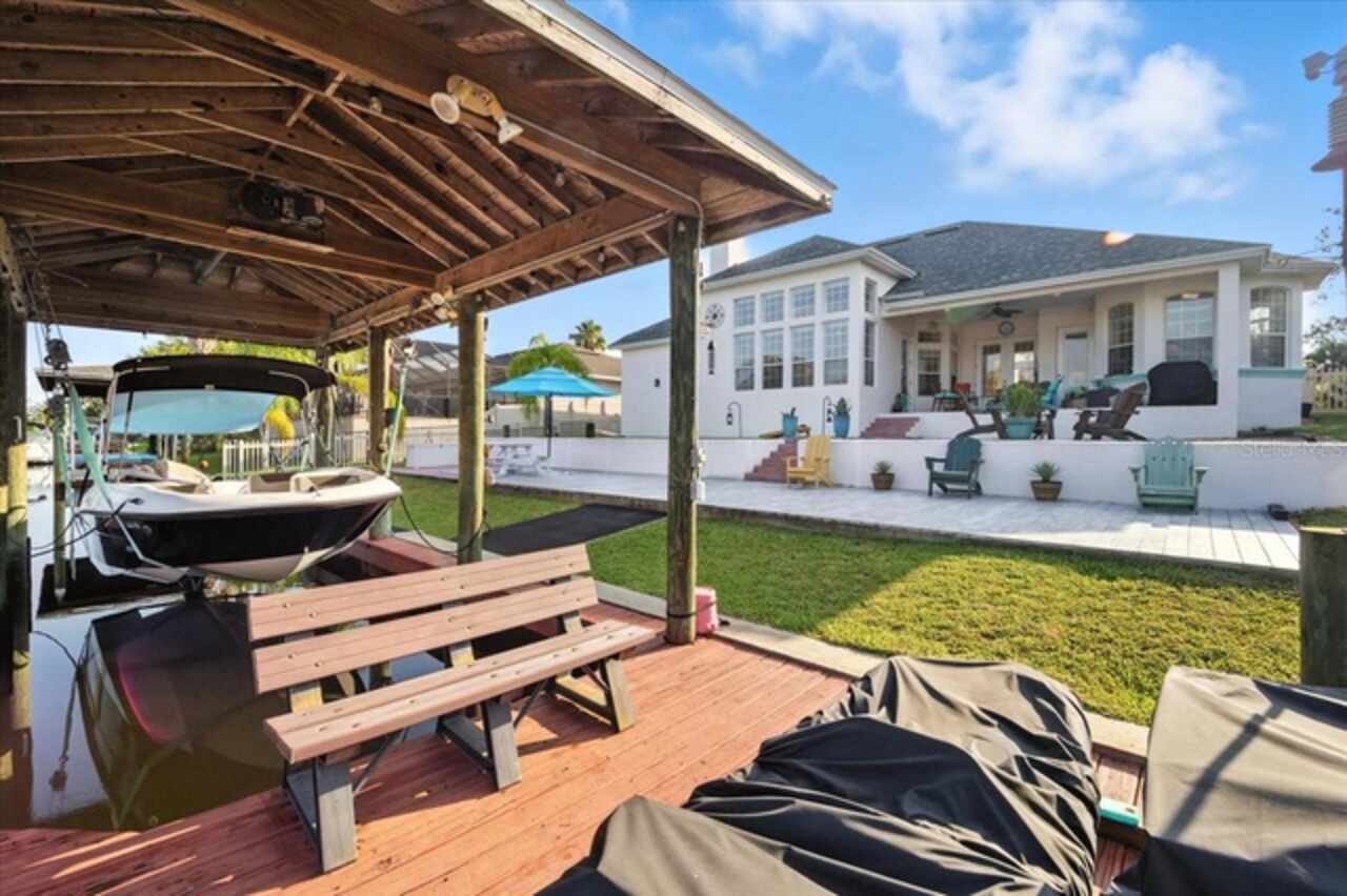 Stunning Saltwater Canal Front Home | 3 Bed |2 Bath | Office/Flex Space | Private Guest Suite | Boathouse with Lift. Welcome Home to your own slice of Florida paradise! This beautifully maintained 3-bedroom, 2-bath home offers the perfect blend of modern upgrades, natural light, and tranquil waterfront living. Step inside to an open split-bedroom floor plan featuring a cozy wood-burning fireplace, upgraded light fixtures throughout, and a flex space off the primary bedroom ideal for a home office, exercise room, or a quiet retreat with serene water views. The completely remodeled kitchen with brand-new appliances, quartz countertops (2023), and solar tubes in the ceiling that flood the space with natural daylight reducing energy costs and creating a warm inviting atmosphere. Additional highlights include: New roof (2022), New water heater (2025), Royal Epoxy driveway coating (2023) Spacious attic also known as the “Florida basement, ” perfect for storing anything and everything. Enjoy outdoor living at its finest with a large open patio, your own boathouse with lift, and breathtaking views of the saltwater canal. The private guest suite offers flexible options as an in-law suite or separate living quarters. This home truly has it all—comfort, space, upgrades, and waterfront charm. Don’t miss your chance to make it yours!
