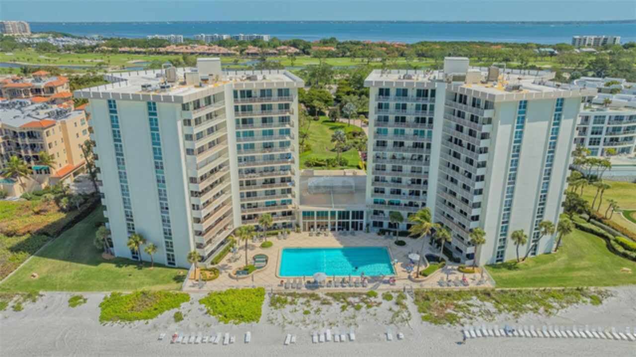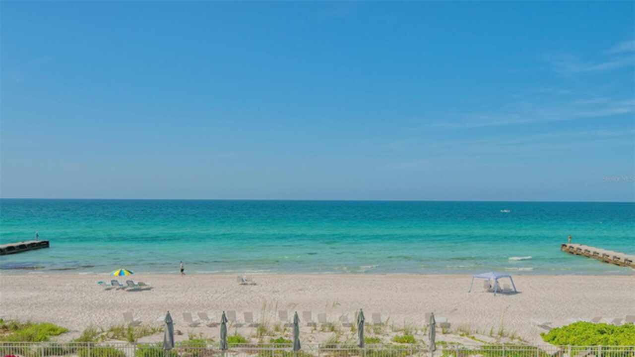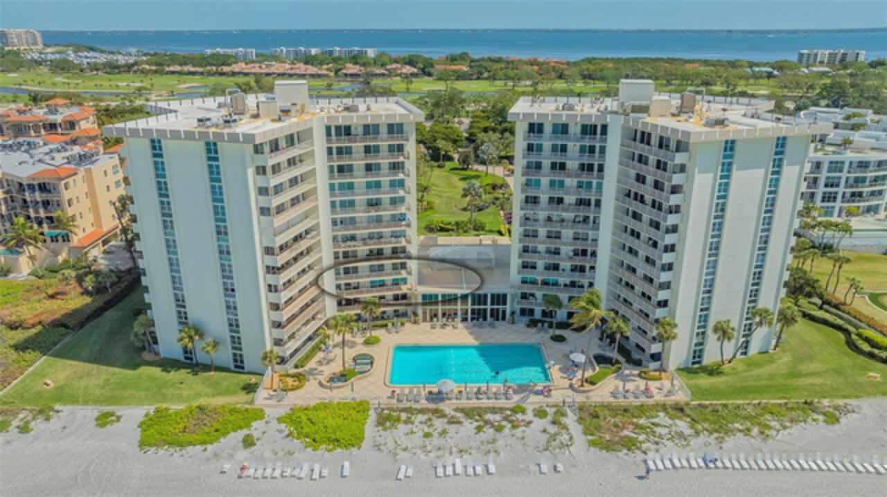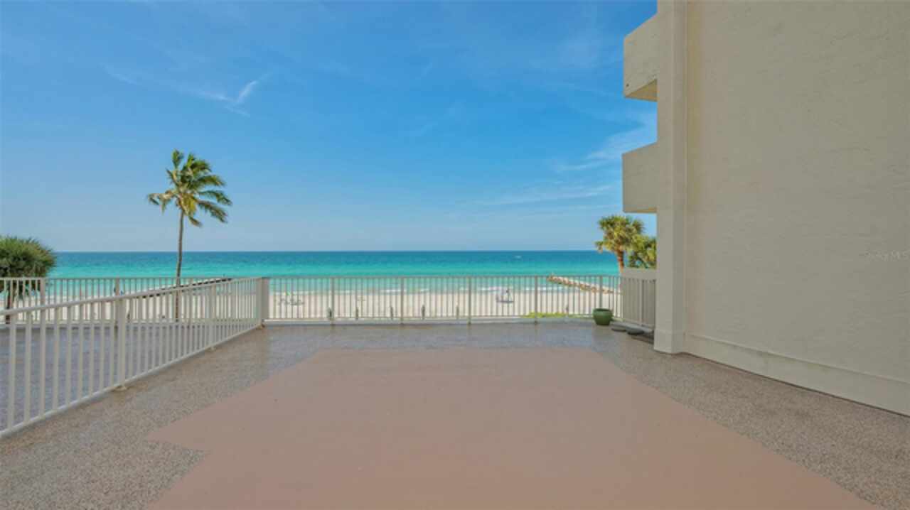 Embrace beachfront living with this two-bedroom, two-bath residence, offering mesmerizing direct views of the Gulf of Mexico. An exceptional feature is the oversized private terrace with breathtaking ocean views, a rarity in beachfront properties. Your private rooftop terrace seamlessly connects to your balcony, extending your outdoor oasis to over 60 feet. Imagine stepping outside and being greeted by the gentle sea breeze, with the vast expanse of the ocean stretching out before you in all its splendor. This generous space offers the ideal retreat for enjoying the coastal lifestyle to the fullest. Whether you're hosting lively gatherings with friends or simply unwinding, you'll have ample room to spread out and make the most of this idyllic setting without leaving the comfort of your home. Retreat to the spacious primary suite, where panoramic ocean views and an en-suite bath redefine serenity. The second bedroom serves as an inviting guest retreat or productive home office. The open-concept living and dining area are for entertaining or simply relaxing while taking in the incredible scenery. The kitchen is equipped with stainless steel appliances and abundant cabinet space for all your culinary needs. The Islander Club is a sought-after community with 400 feet of private beach frontage. Islander Club offers residents on-site management, a heated pool, renovated clubhouse, billiards and table tennis room, fitness center, saunas and two Har-Tru tennis courts. The shopping, dining and cultural attractions of St. Armands Circle and downtown Sarasota are just a short drive away.