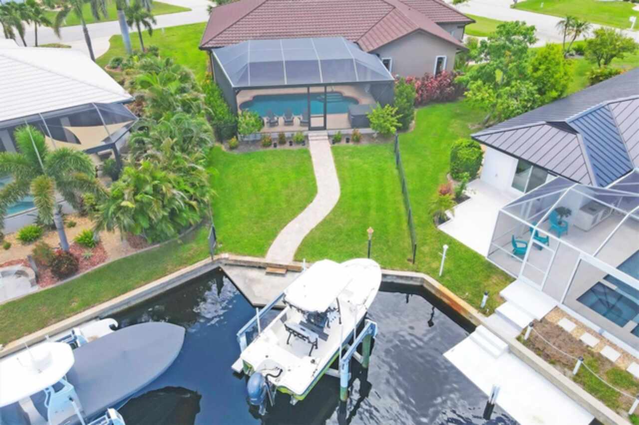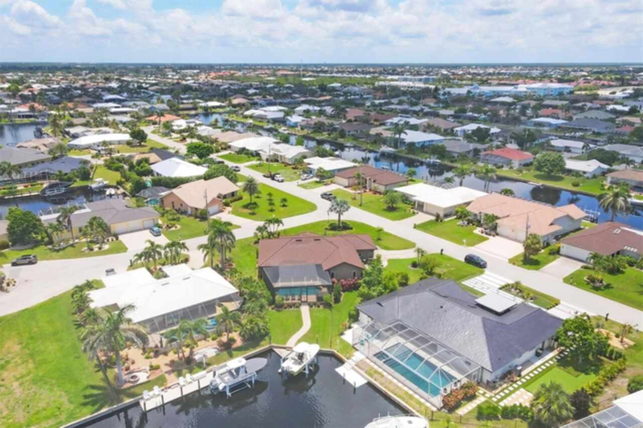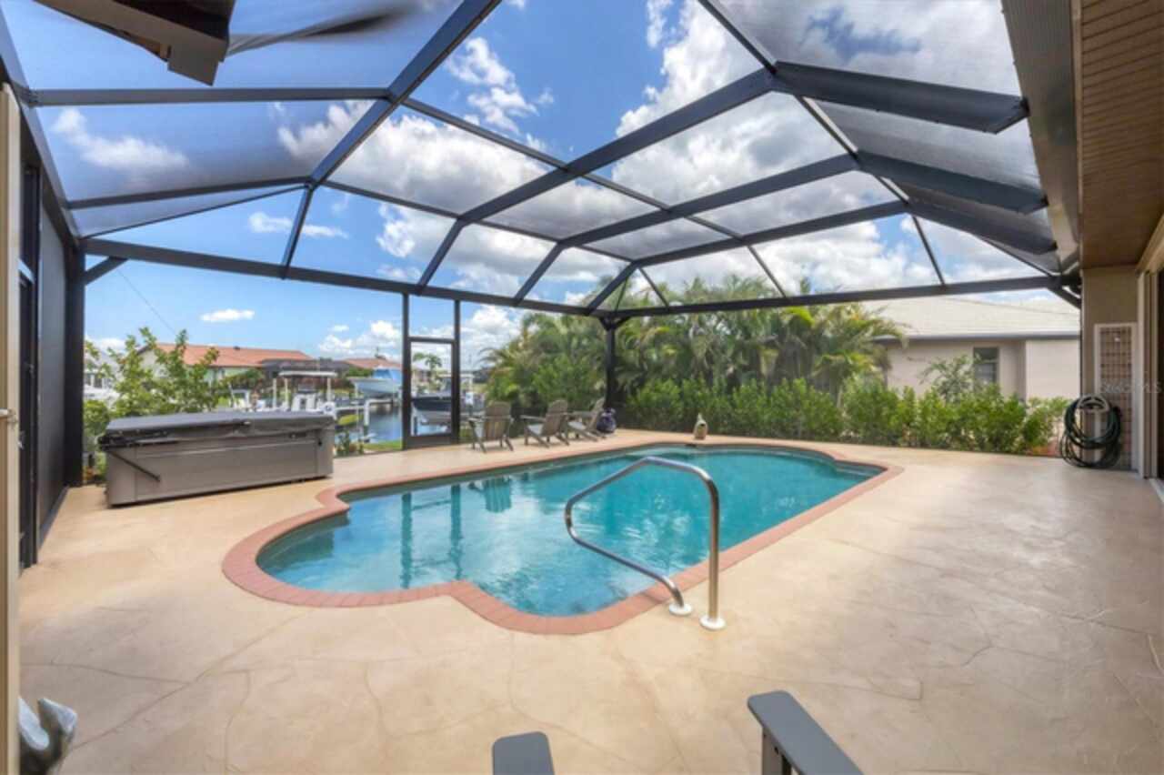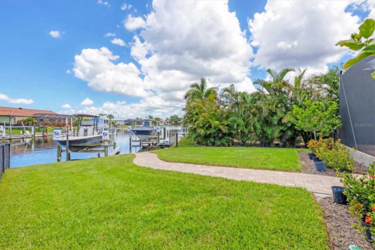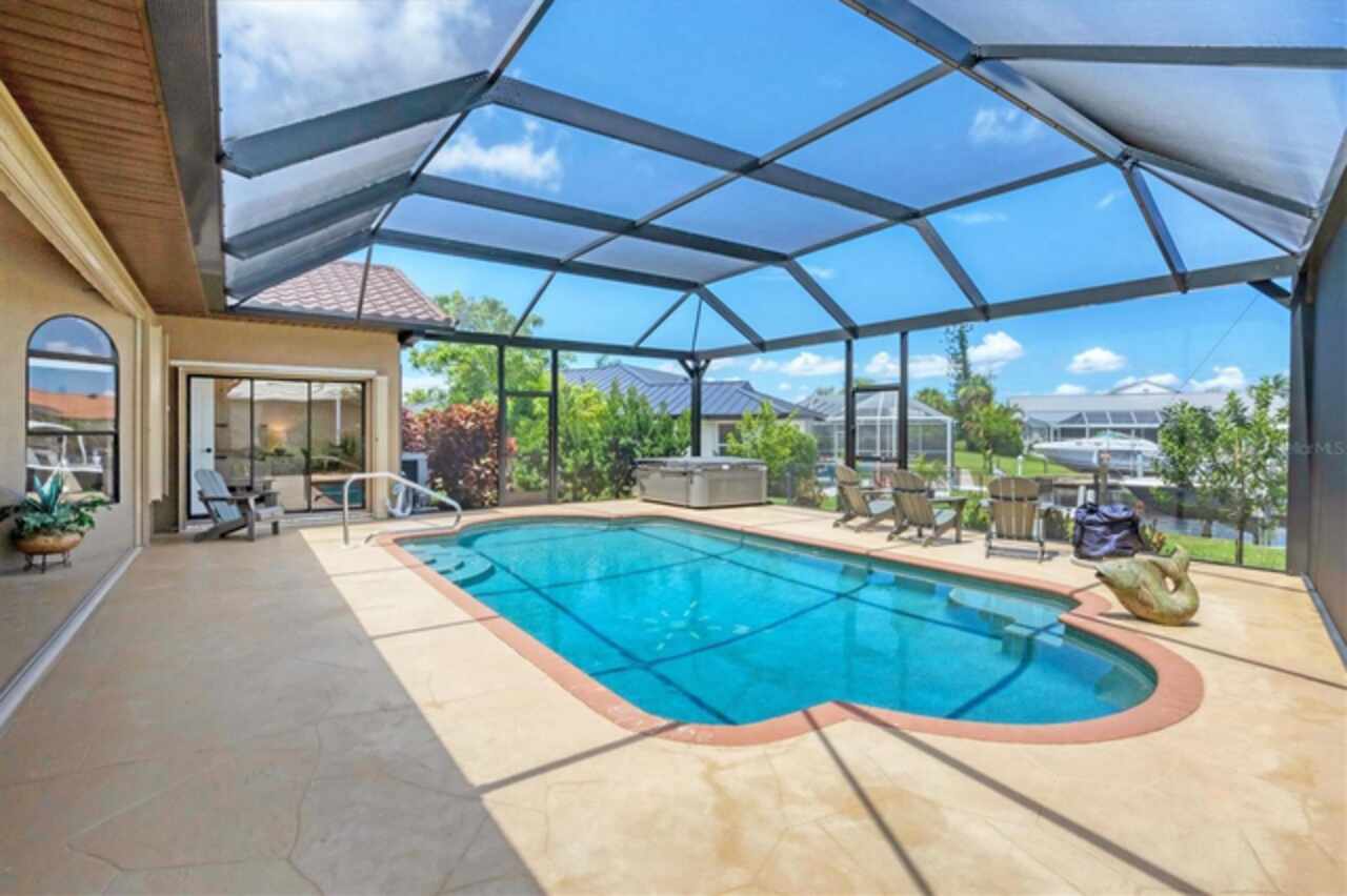Tucked away within Punta Gorda Isles & just a short boat ride out to the open waters of Charlotte Harbor! Now available, an authentic Potter built, 3/2/2 home that offers peace, privacy and everything a watersport enthusiast could ever want! Overlooking a canal lagoon w/30 ft of sea wall, an 8 x12 angular cement dock & a 10, 000 lb. boat lift! The home attributes vaulted & tall ceilings, freshly painted neutral hues throughout, a sprawling & open floor plan with split sleeping quarters! One of its best features is its large, heated swimming pool, situated within the *NEW* “Miami-Dade grade” pool cage & nosuem screen; its covered lanai, w/ 2 fans, which can all be accessed via glass pocket sliders off the living room, the great room/den as well as from the Primary bedroom! Whether you're hosting out of town guests, enjoying family time, or simply relaxing, this home offers plenty of room to entertain inside that naturally flows outside! Inside, a bright and inviting atmosphere, but the real magic happens outside and out on the water! Perfect for gathering with friends or winding down after a day on the boat. What really sets this property apart, is built on a spacious, oversized, corner lot, on a cul-de-sac and is significantly set-back off the canal & along with the newly planted landscape, provides plenty of seclusion and tranquility. It's a haven for those who love to relax and enjoy being in the outdoors in every way. Whether you're looking for a quiet, seasonal retreat or a full-time home, this property surely delivers! It's private, peaceful, and will be perfect for the most discerning buyer.