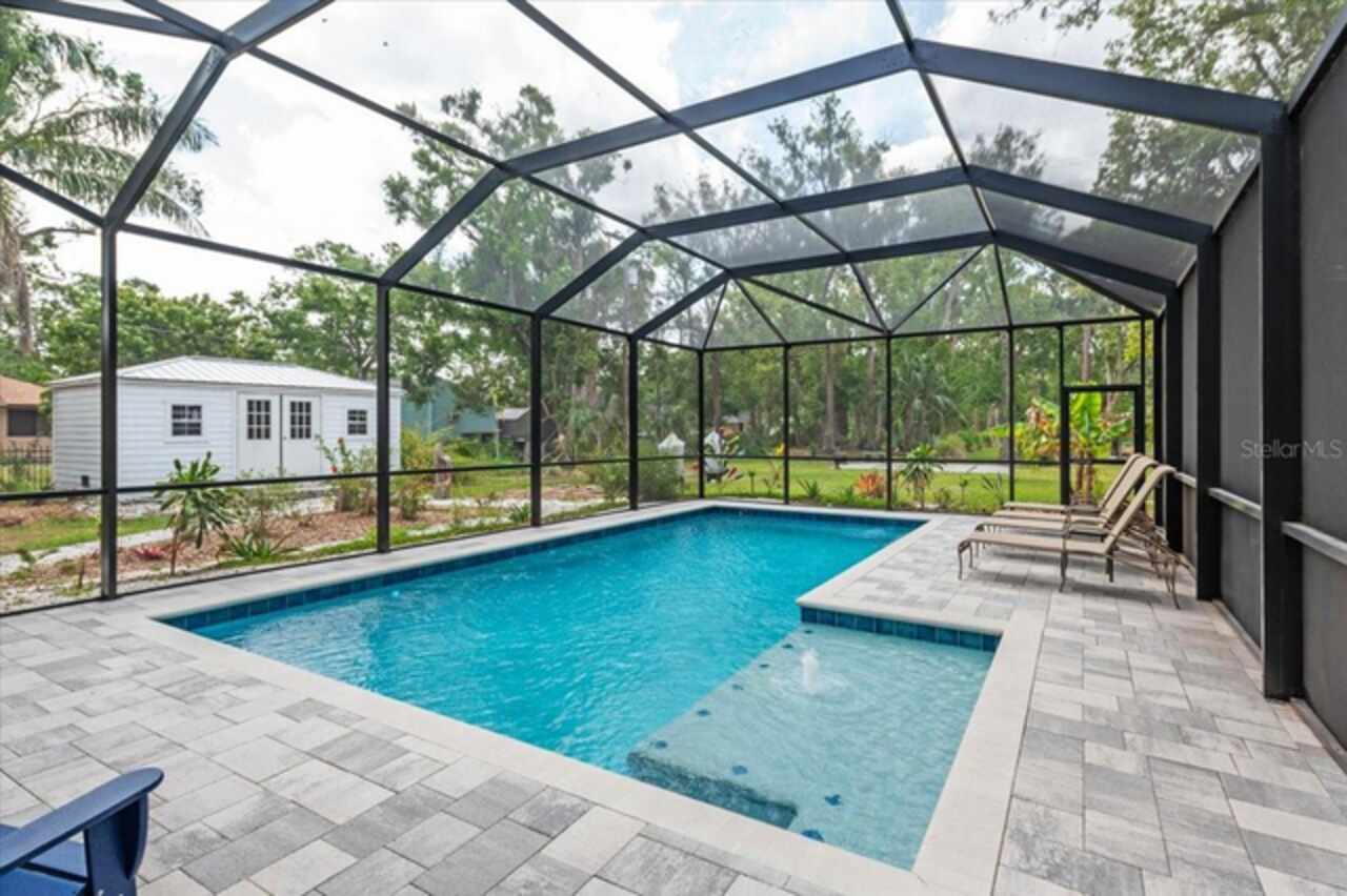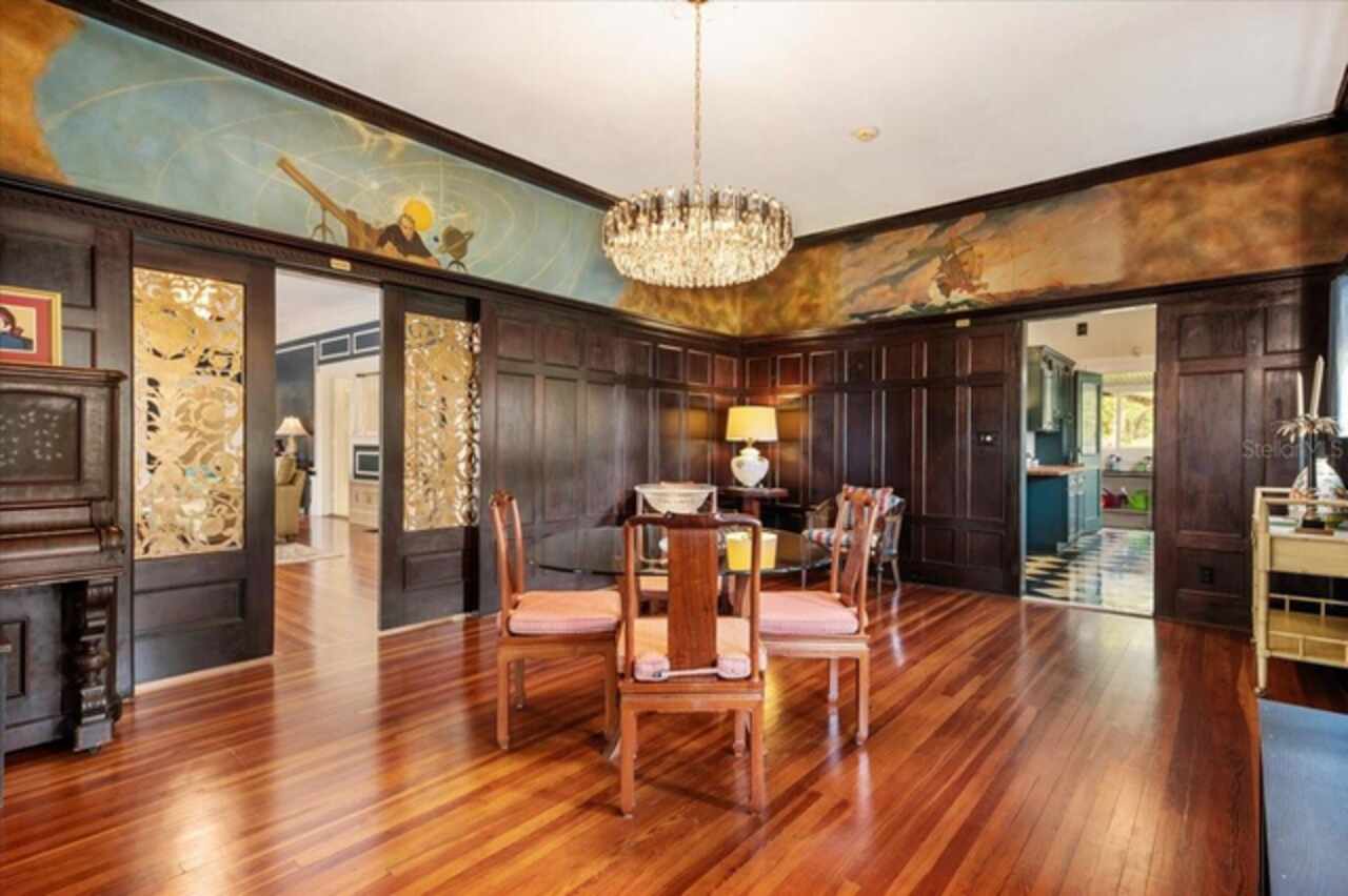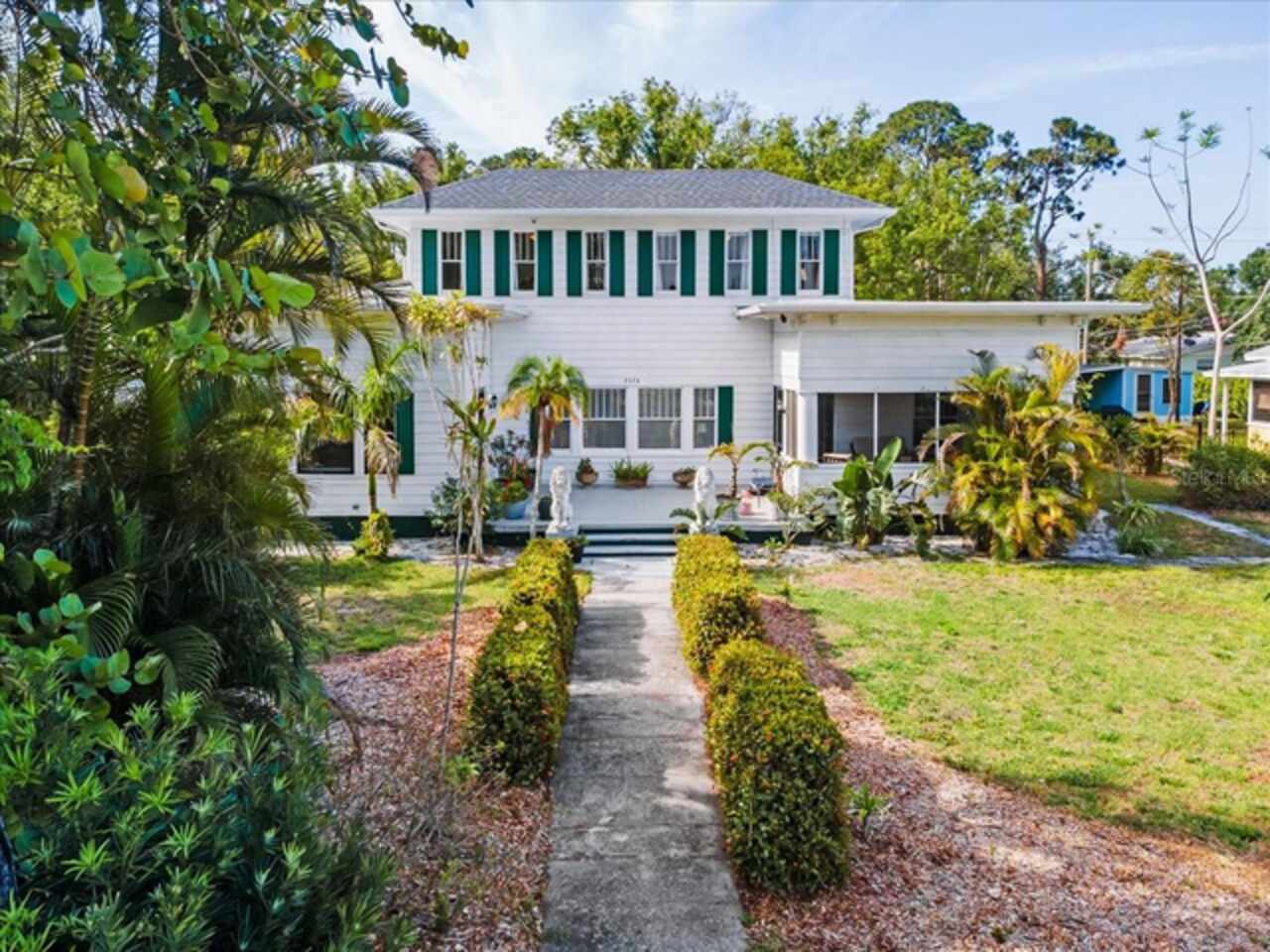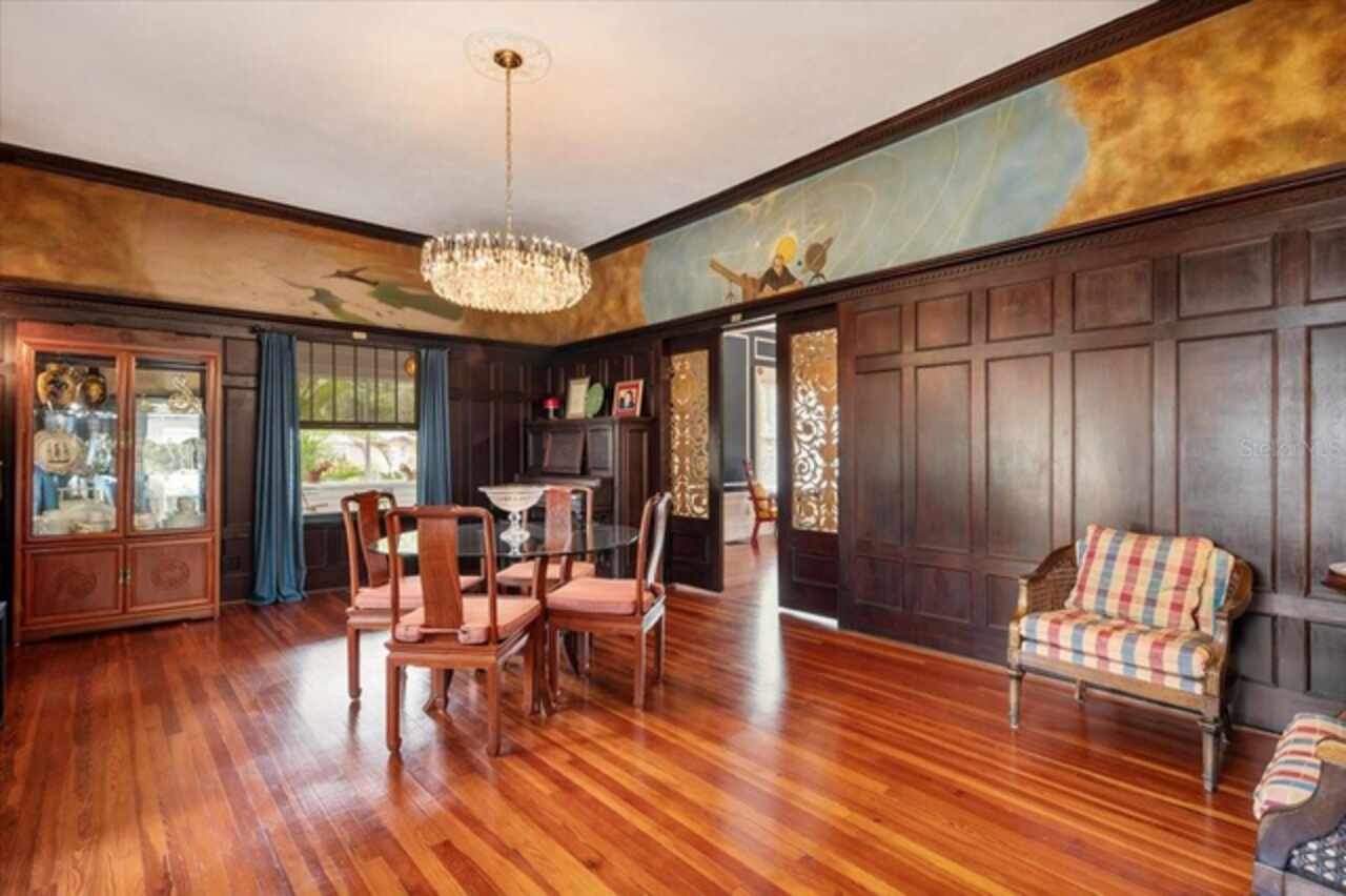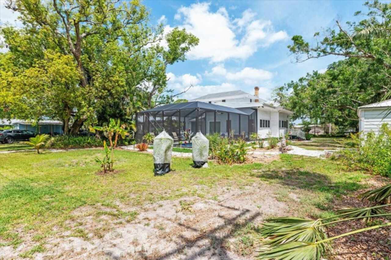Come home to your oasis, a home distinguished by refined elegance and old Florida charm. Built around 1928 as the personal residence of Dr Blake Lancaster, a local surgeon, painter, and musician, this is no old house with a cookie cutter renovation. Move-in ready, the home has preserved features and historic patina that combine with modern functionality for a light- filled and joyful ambience. With spacious rooms and 10’4” ceilings, it is perfect for those who love to entertain or host fun family gatherings, who seek a serene retreat or who crave a huge canvas to express their creativity. Miraculously, many original features remain: gleaming heart- pine flooring, 7’ mahogany veneer paneling, 4 original murals by Lancaster; arched ceilings, carved pilasters, gilted carved pocket doors, impressive Art Deco light fixtures, a built-in bookcase & mahogany wardrobe. Renovations and updates (between 2020-24) include kitchen and laundry with new LG appliances, bathrooms, window glazing, plumbing, electrical, new roof, & 3 new A/C units. Additions include a bespoke stained-glass interior door, ornamental fence, & backyard irrigation. A new 400 sq ft sunroom (2023) features ceiling-to-floor doors that open onto the deck of a 29’ heated, saltwater pool with sun shelf + bubbler. Sweeping views of the rear garden transport you to a leafy preserve, with winding nature trails, raised garden beds, lush tropical trees, flowering vegetation, even insect hotels! An outdoor chessboard with oversized playing pieces lend a European city park vibe; a climbing structure created from lighter trees is a kids’ favorite. A 12x20’ custom shed (2022) is stylistically in step with the house & fully wired with A/C; it is used as workshop but could be converted into pool house, art studio, or office. Two rooms in the house – the breakfast room and the former east foyer, now a playroom – are also versatile and could be repurposed, and prior owners used the study as a 4 th bedroom. So many options! Unlike many older homes, this one offers great storage, including walk-in closets in every bedroom and a walk-in linen closet upstairs. Main bedroom is downstairs. The home is solidly constructed on a raised foundation to minimize risk of flooding. The rear lots (~.8 acre) are zoned residential, but options to develop are almost limitless with city approval: homes for the next generation, in-law or Airbnb cottages, a retreat center, a wedding venue. Or keep the entire property as it is, your oasis, an escape that invites you to relax and play, that inspires you and draws out your creativity. A copy of the history of the house conveys. Many furnishings negotiable, if turnkey is preferred. This remarkable home is set in a diverse and friendly neighborhood, walkable to Olde Manatee, the Bradenton Riverwalk & Manatee River. Close proximity to public boat launch on Braden River, golf courses, shops, restaurants, & grocers. Minutes to downtown Bradenton, Saturday farmers market, & marina; 11 miles to world-class soft-sand beaches, 20 minutes to SRQ airport or UTC mall, 30 to downtown Sarasota, 35 to St Pete, 50 to TPA airport. Discover how old Florida can enliven your future!