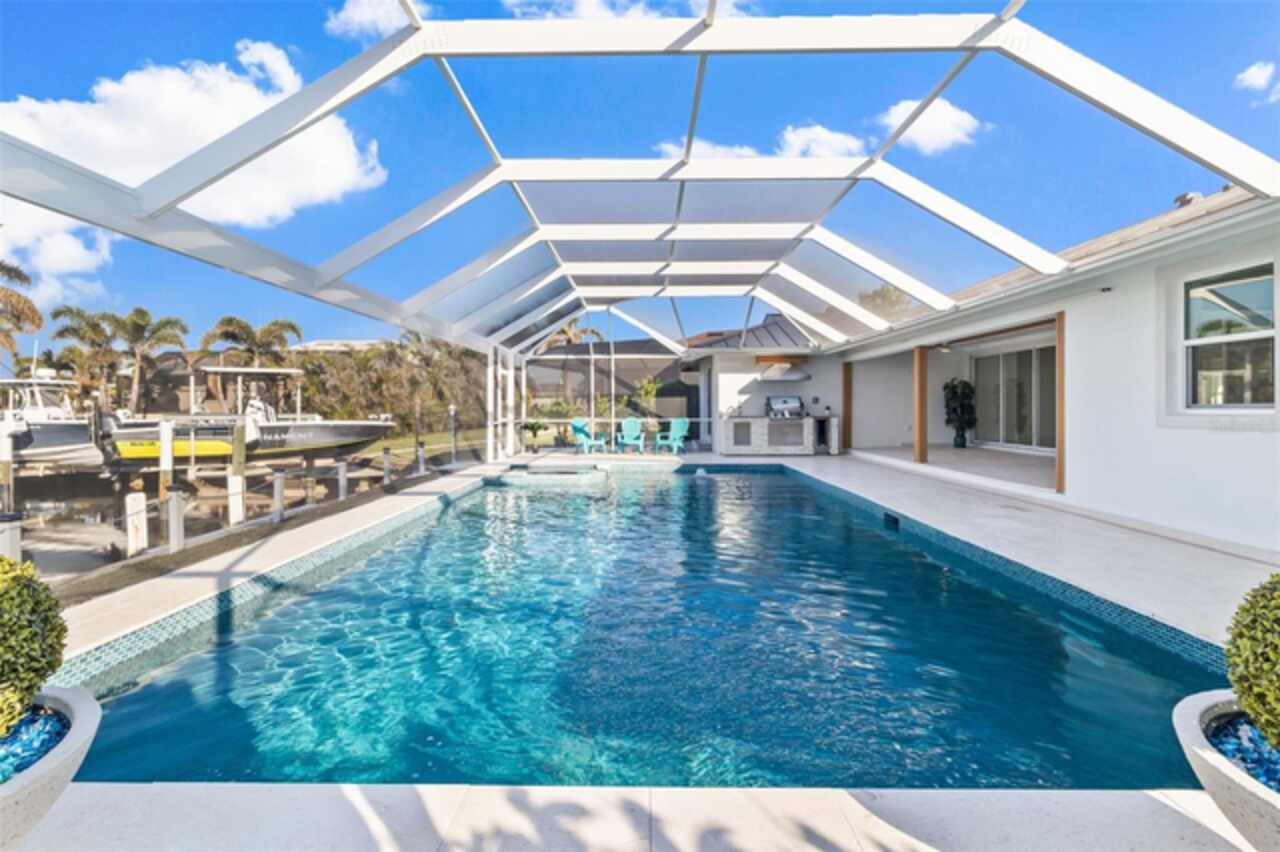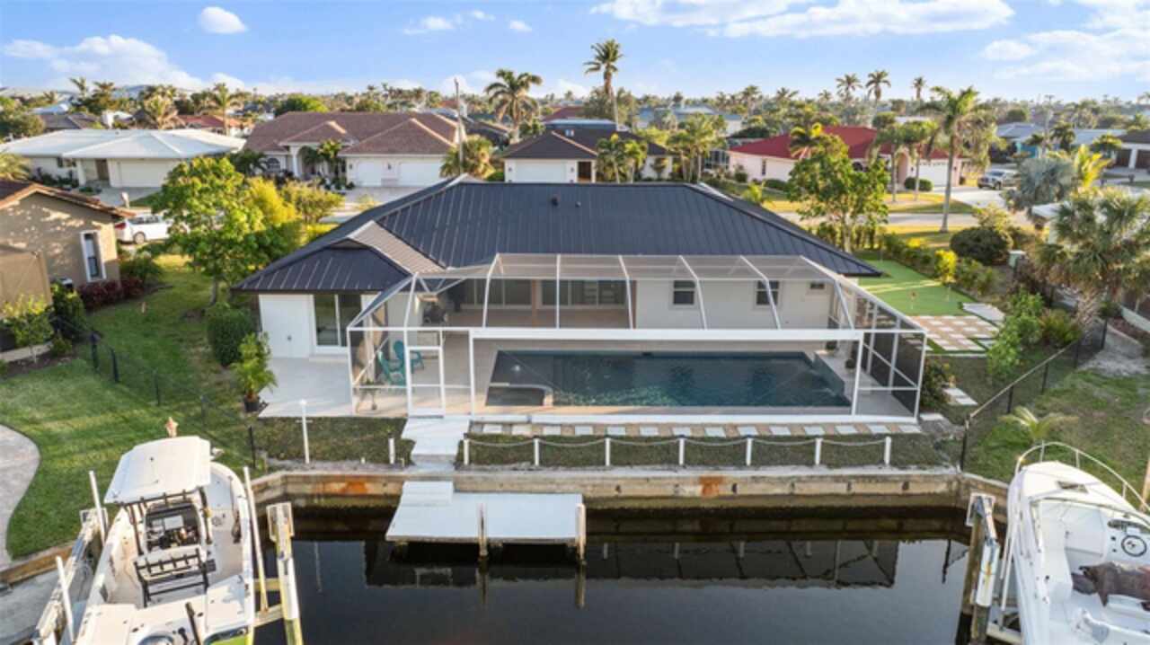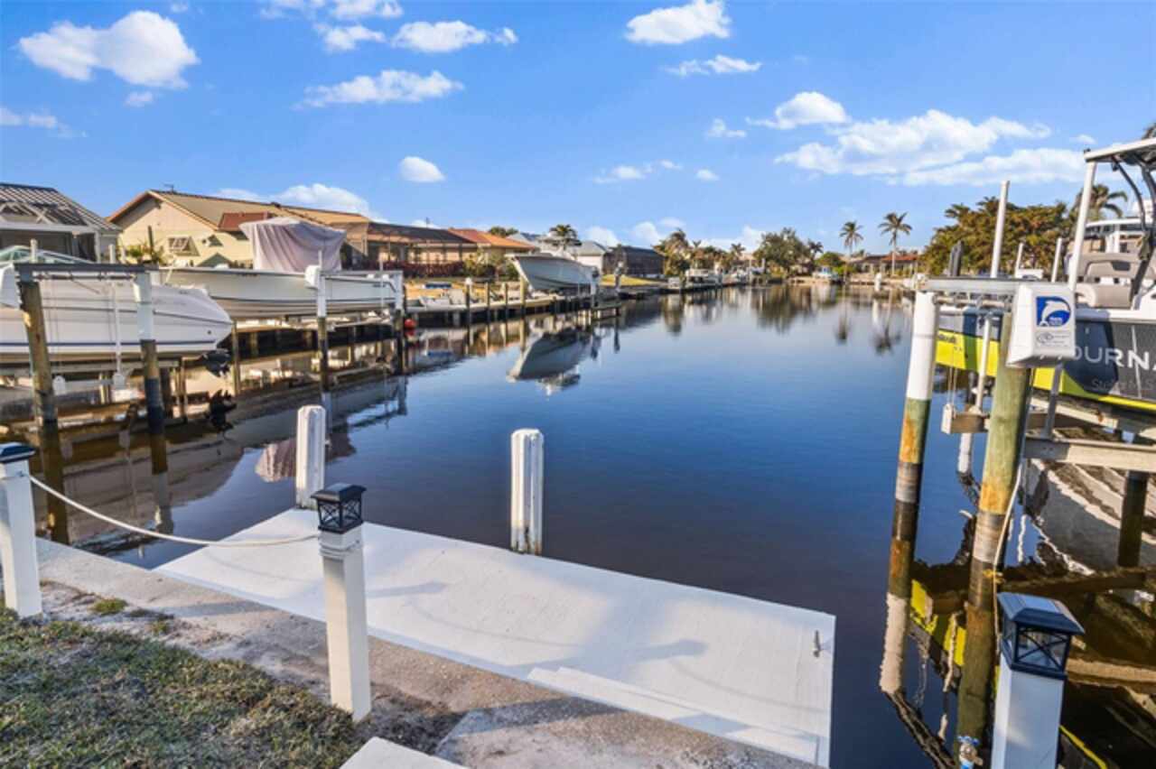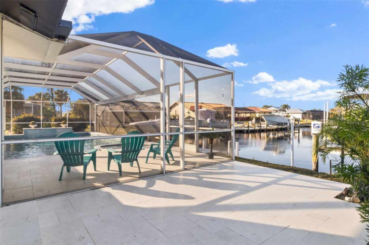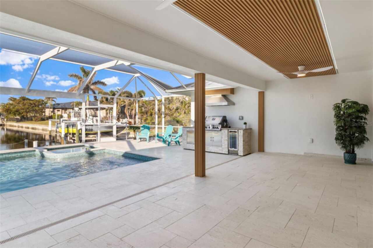 One or more photo(s) has been virtually staged. Priced To Sell, Enjoy Florida's luxury living in Punta Gorda Isles with this breathtaking 4-bedroom, 3.5-bathroom Resort-Style WATERFRONT POOL HOME with Direct Sailboat access, and DOCK. This beautifully updated Vacation or Primary Home offers almost 2, 800 sqft of meticulously designed living space with modern amenities, including a new metal roof , architecturally designed outdoor spaces, and more. As you enter, you are greeted by an abundance of natural light streaming through the new impact windows and doors, which enhance the expansive, open-concept layout. At the heart of the home is the chef-inspired custom Gourmet Kitchen, that features stainless steel appliances, including a large 60-inch custom refrigerator and freezer, sleek cabinetry, and a stunning quartz waterfall island that is ideal for both everyday living and entertaining. The Gourmet Kitchen flows seamlessly into a spacious living and dining room that overlooks the beautiful water. THE HOME FEATURES TWO EXPANSIVE MASTER SUITES, each with its own private walk-in closet and spa-inspired ensuite, offering ultimate relaxation. For those seeking a quiet retreat or dedicated workspace, this home has a private den/office that is perfect for working remotely, reading, or simply enjoying some peaceful downtime. As you step outside to your very own Resort-Style Oasis surrounded by lush landscaping with two mature mango trees and a tangerine tree, the large screen enclosed lanai is perfect for outdoor dining, social gatherings and entertaining. You can either dive into the almost 10ft deep large pool, relax in the spa, cook dinner in the outdoor kitchen, or play a round of MINI GOLF IN YOUR OWN BACKYARD. With your own private dock just steps away, enjoy boating, fishing, or simply relaxing by the water, all while soaking in Florida’s warm year-round sun and viewing vibrant sunsets. This beautiful home also includes two additional bedrooms, a two-car garage, laundry room with a new stackable washer and dryer and lots of storage space throughout. Located close to shopping, great restaurants, and beautiful beaches, this Resort-Style Home isn’t just a place to live, it’s the perfect place to embrace the best of the Florida Coastal Lifestyle.Be sure to ask for the FEATURES SHEET for additional information. Call today to schedule a private tour!