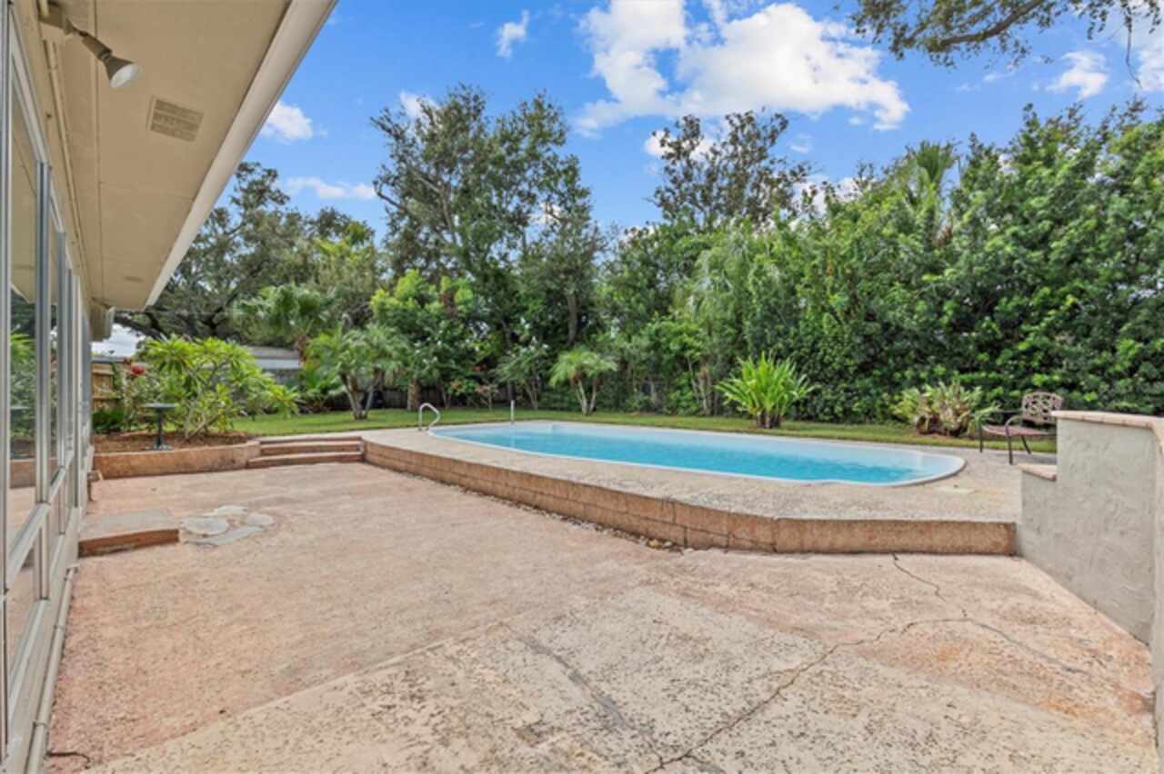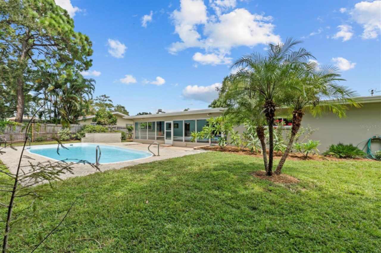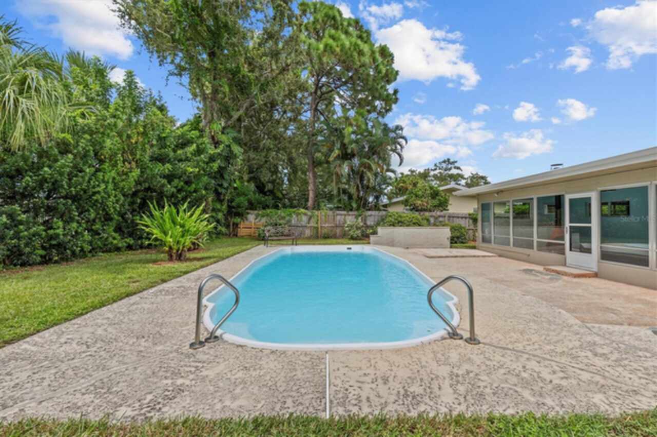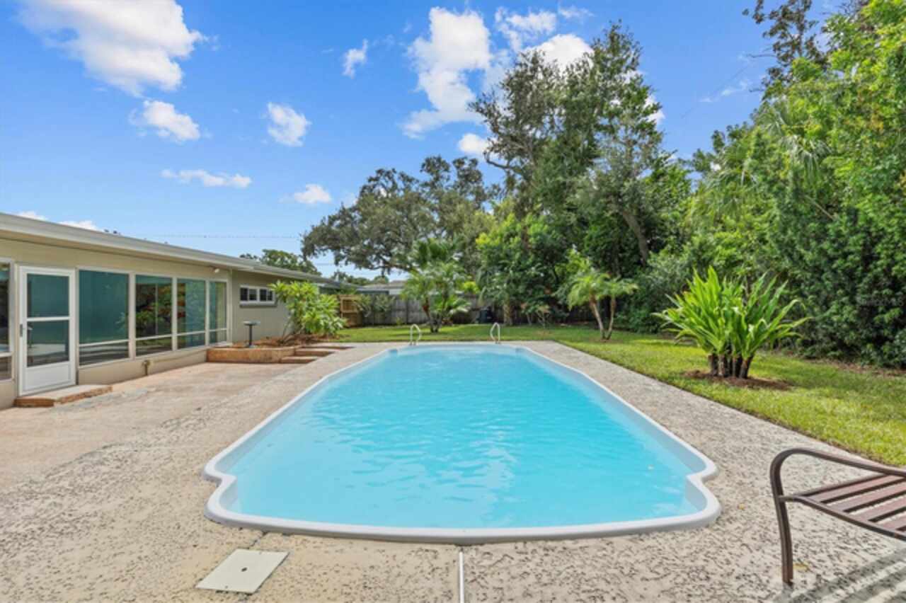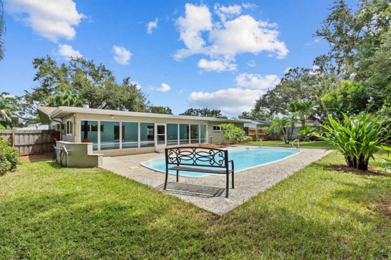 Under contract-accepting backup offers. Price Improvement. You don’t need to live in downtown Dunedin to enjoy the ultimate walkable lifestyle. Nestled in Fairway Estates, this residence is just steps from the Pinellas Trail, an 18-hole championship golf course and clubhouse, and the region’s premier visual arts and education center. Nearby, a community center with library, fitness studio & classes, Olympic size pool, tennis and pickleball courts, and picturesque parks ensure endless opportunities for recreation, festivals, and nature exploration—all without ever getting in your car. The optional HOA offers the freedom of no deed restrictions, along with an active calendar of family friendly gatherings. Peace of mind comes with a newer roof and HVAC system, hurricane-rated windows and doors, and X flood zone status that helps keep insurance affordable. Inside, you’ll find an open-concept great room and chef’s kitchen designed for entertaining, with soaring vaulted ceilings, dramatic exposed beams, and luxury plank flooring. European-style wood cabinetry, sleek stainless appliances, oversized island with entertainment bar, and gleaming granite countertops. Host with style in the expansive 35’ x 14’ enclosed lanai, complete with a cozy fireplace and the potential for additional climate-controlled living. The Owner’s Suite is a true retreat with direct lanai access, and a spa-inspired ensuite with updated vanity and mid-century modern sunken tub/shower. Two additional bedrooms share an updated ceramic tile bath, also with a timeless sunken tub/shower. Original mid-century terrazzo floors grace all bedrooms. Step outside to your private backyard oasis with a sparkling in-ground pool. The fully fenced yard provides both privacy and security for kids and pets alike. Homes in Fairway Estates are highly sought-after and rarely available. Don’t miss the chance to claim this exceptional lifestyle—schedule your private tour today.