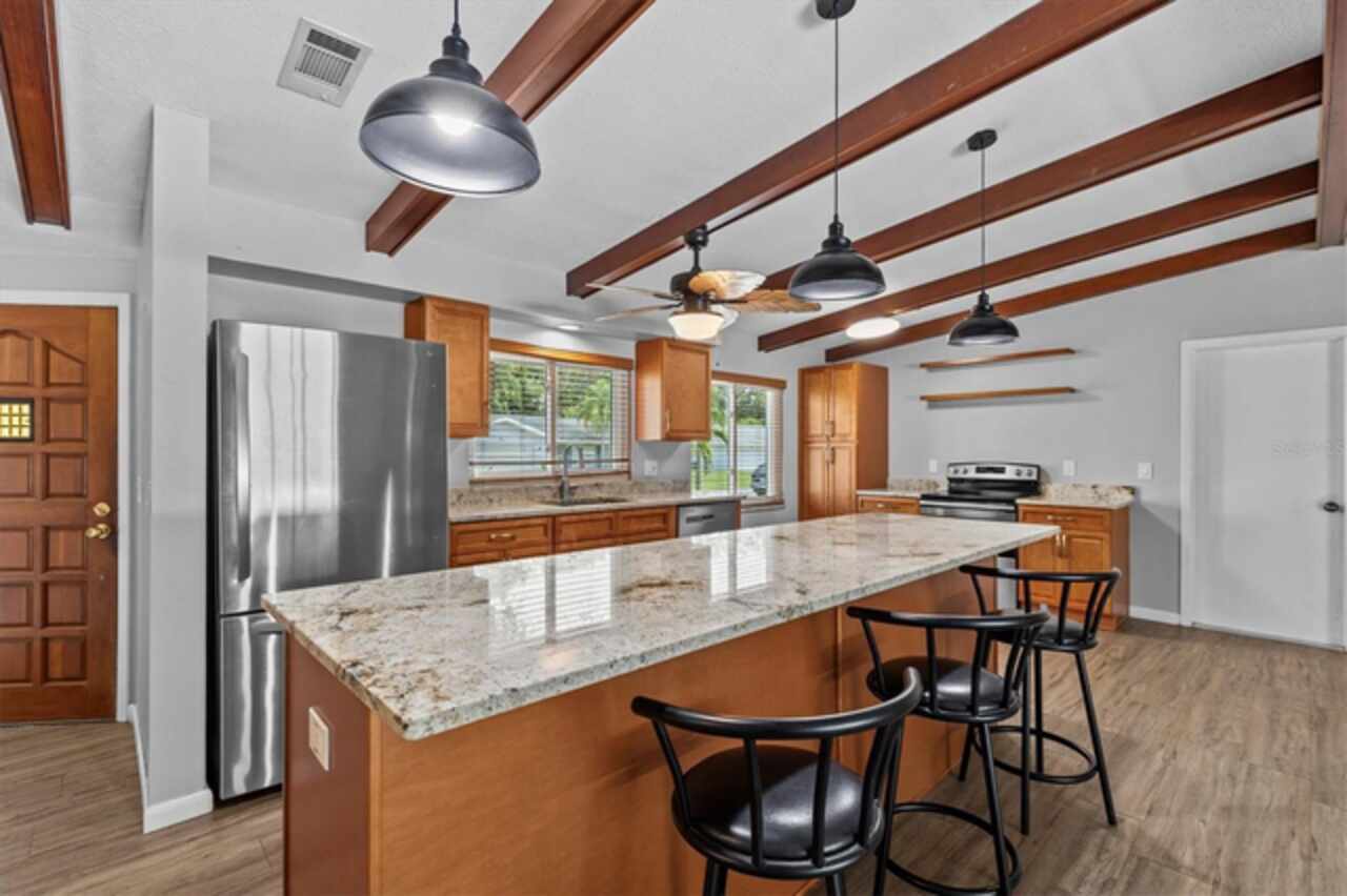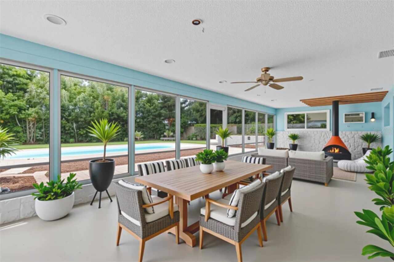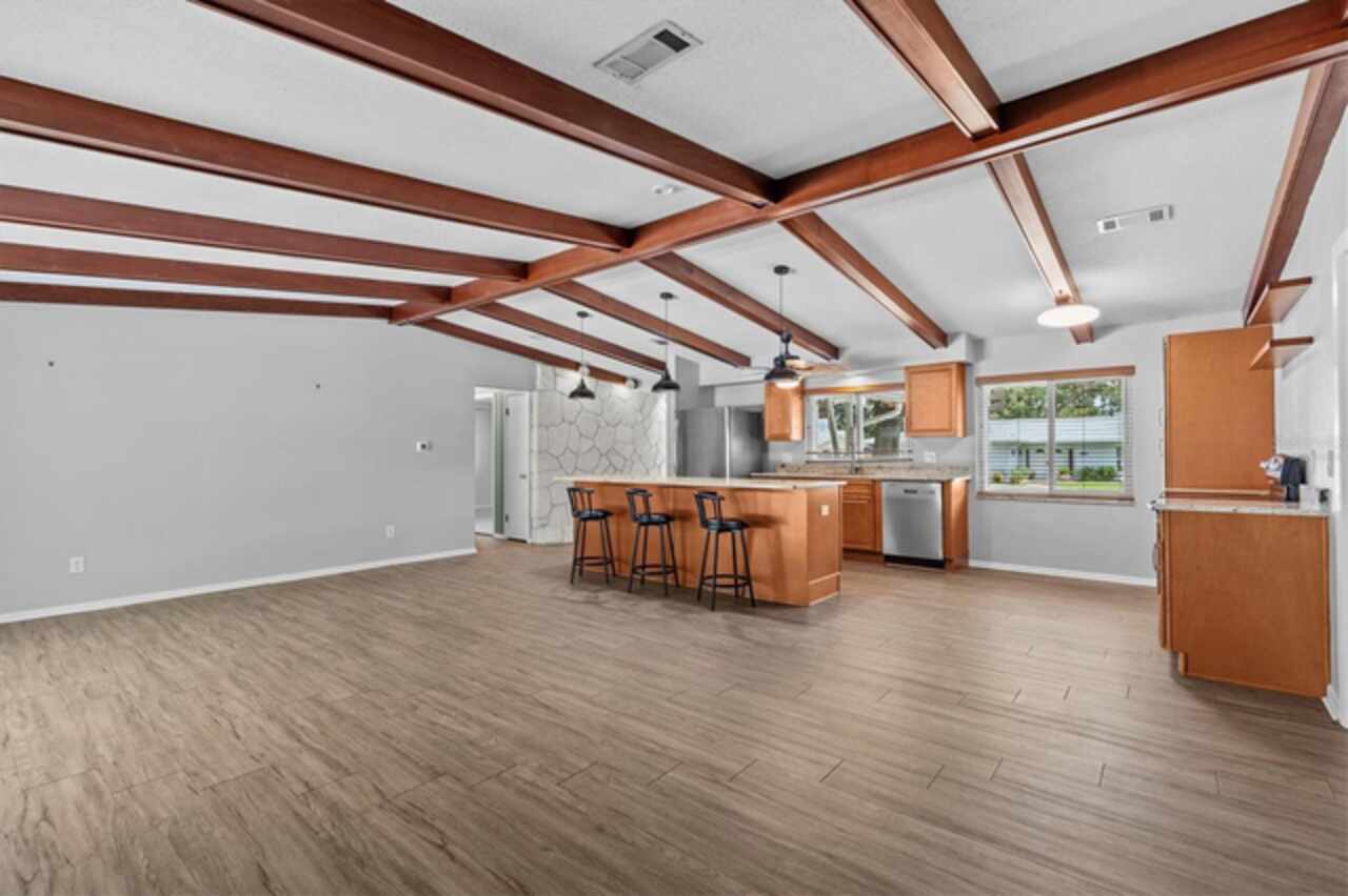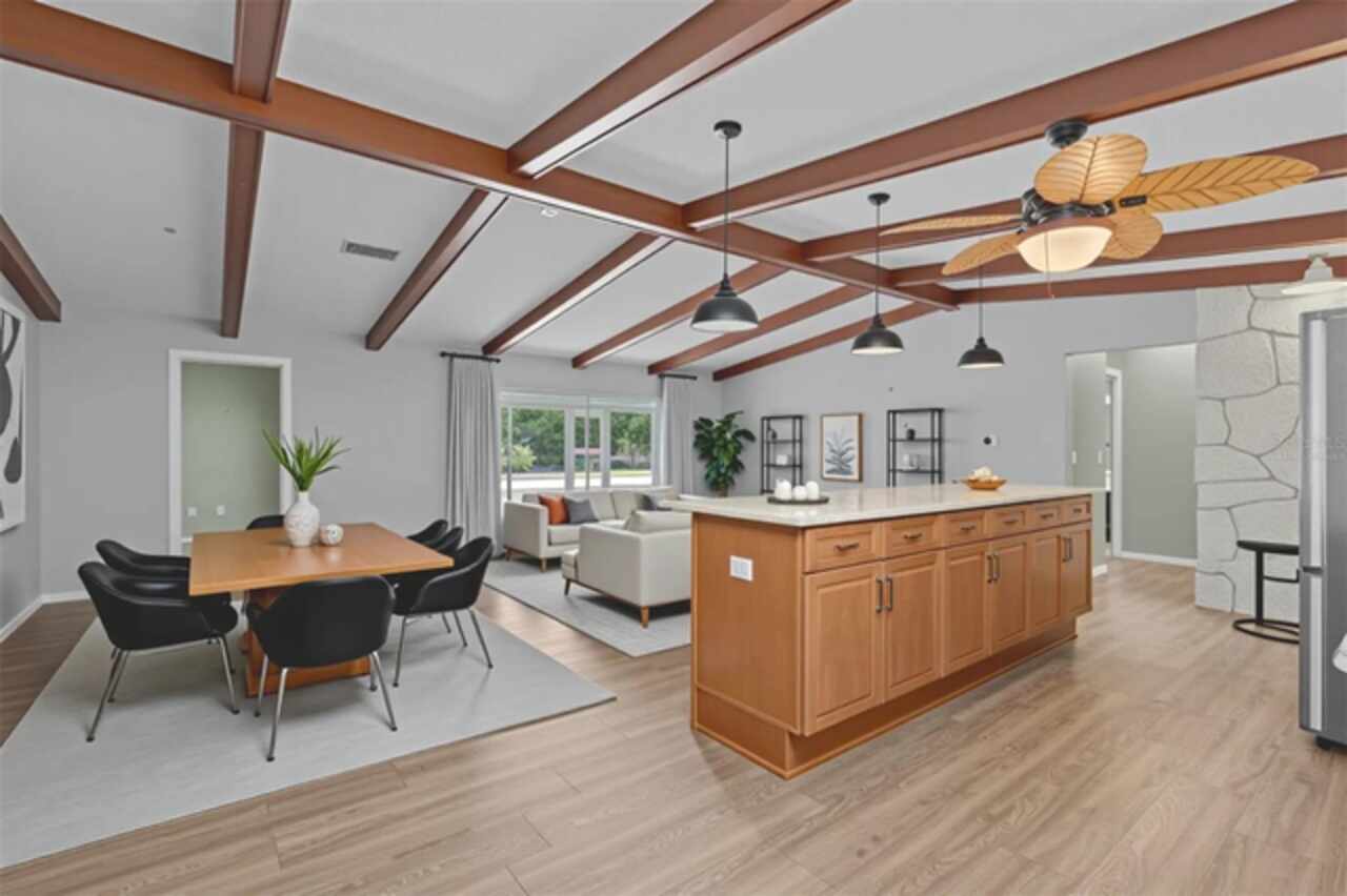 Under contract-accepting backup offers. Price Improvement. You don’t need to live in downtown Dunedin to enjoy the ultimate walkable lifestyle. Nestled in Fairway Estates, this residence is just steps from the Pinellas Trail, an 18-hole championship golf course and clubhouse, and the region’s premier visual arts and education center. Nearby, a community center with library, fitness studio & classes, Olympic size pool, tennis and pickleball courts, and picturesque parks ensure endless opportunities for recreation, festivals, and nature exploration—all without ever getting in your car. The optional HOA offers the freedom of no deed restrictions, along with an active calendar of family friendly gatherings. Peace of mind comes with a newer roof and HVAC system, hurricane-rated windows and doors, and X flood zone status that helps keep insurance affordable. Inside, you’ll find an open-concept great room and chef’s kitchen designed for entertaining, with soaring vaulted ceilings, dramatic exposed beams, and luxury plank flooring. European-style wood cabinetry, sleek stainless appliances, oversized island with entertainment bar, and gleaming granite countertops. Host with style in the expansive 35’ x 14’ enclosed lanai, complete with a cozy fireplace and the potential for additional climate-controlled living. The Owner’s Suite is a true retreat with direct lanai access, and a spa-inspired ensuite with updated vanity and mid-century modern sunken tub/shower. Two additional bedrooms share an updated ceramic tile bath, also with a timeless sunken tub/shower. Original mid-century terrazzo floors grace all bedrooms. Step outside to your private backyard oasis with a sparkling in-ground pool. The fully fenced yard provides both privacy and security for kids and pets alike. Homes in Fairway Estates are highly sought-after and rarely available. Don’t miss the chance to claim this exceptional lifestyle—schedule your private tour today.