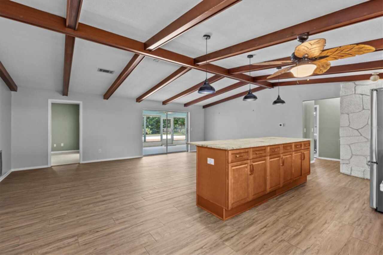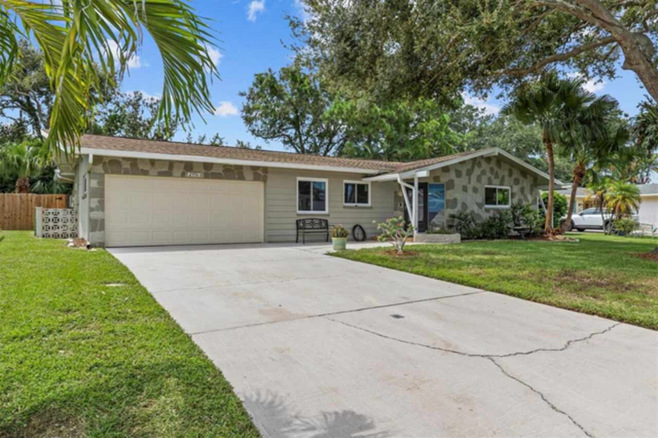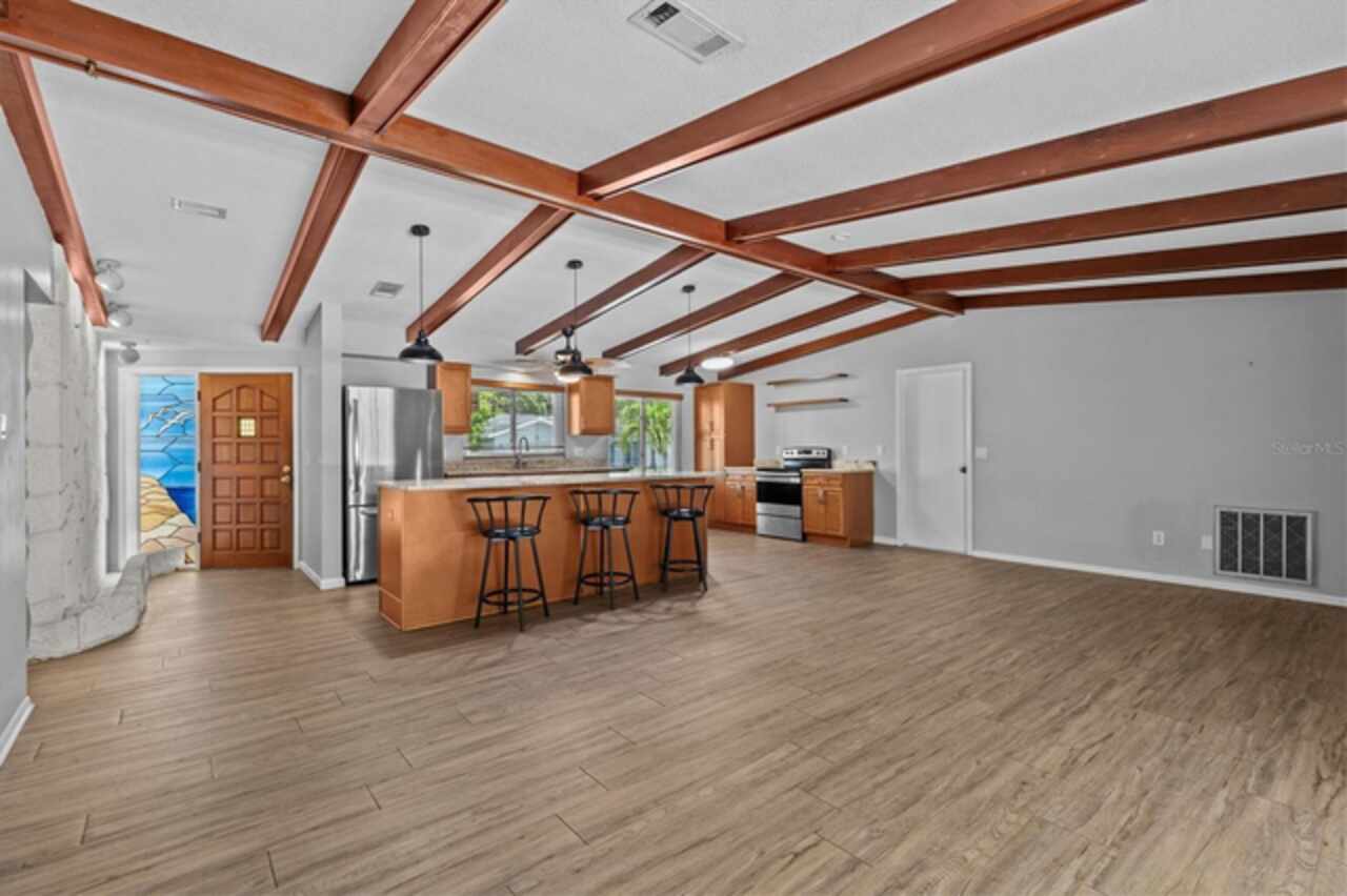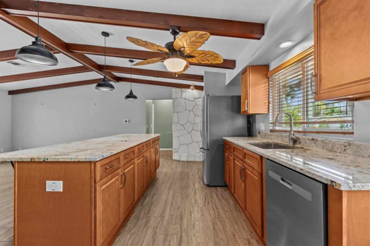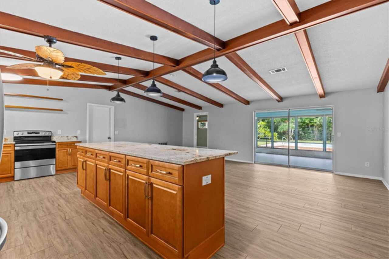 Under contract-accepting backup offers. Price Improvement. You don’t need to live in downtown Dunedin to enjoy the ultimate walkable lifestyle. Nestled in Fairway Estates, this residence is just steps from the Pinellas Trail, an 18-hole championship golf course and clubhouse, and the region’s premier visual arts and education center. Nearby, a community center with library, fitness studio & classes, Olympic size pool, tennis and pickleball courts, and picturesque parks ensure endless opportunities for recreation, festivals, and nature exploration—all without ever getting in your car. The optional HOA offers the freedom of no deed restrictions, along with an active calendar of family friendly gatherings. Peace of mind comes with a newer roof and HVAC system, hurricane-rated windows and doors, and X flood zone status that helps keep insurance affordable. Inside, you’ll find an open-concept great room and chef’s kitchen designed for entertaining, with soaring vaulted ceilings, dramatic exposed beams, and luxury plank flooring. European-style wood cabinetry, sleek stainless appliances, oversized island with entertainment bar, and gleaming granite countertops. Host with style in the expansive 35’ x 14’ enclosed lanai, complete with a cozy fireplace and the potential for additional climate-controlled living. The Owner’s Suite is a true retreat with direct lanai access, and a spa-inspired ensuite with updated vanity and mid-century modern sunken tub/shower. Two additional bedrooms share an updated ceramic tile bath, also with a timeless sunken tub/shower. Original mid-century terrazzo floors grace all bedrooms. Step outside to your private backyard oasis with a sparkling in-ground pool. The fully fenced yard provides both privacy and security for kids and pets alike. Homes in Fairway Estates are highly sought-after and rarely available. Don’t miss the chance to claim this exceptional lifestyle—schedule your private tour today.
