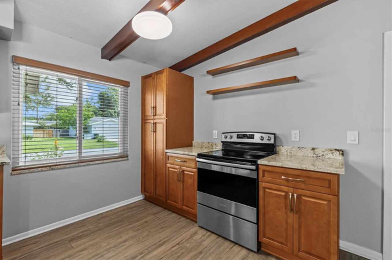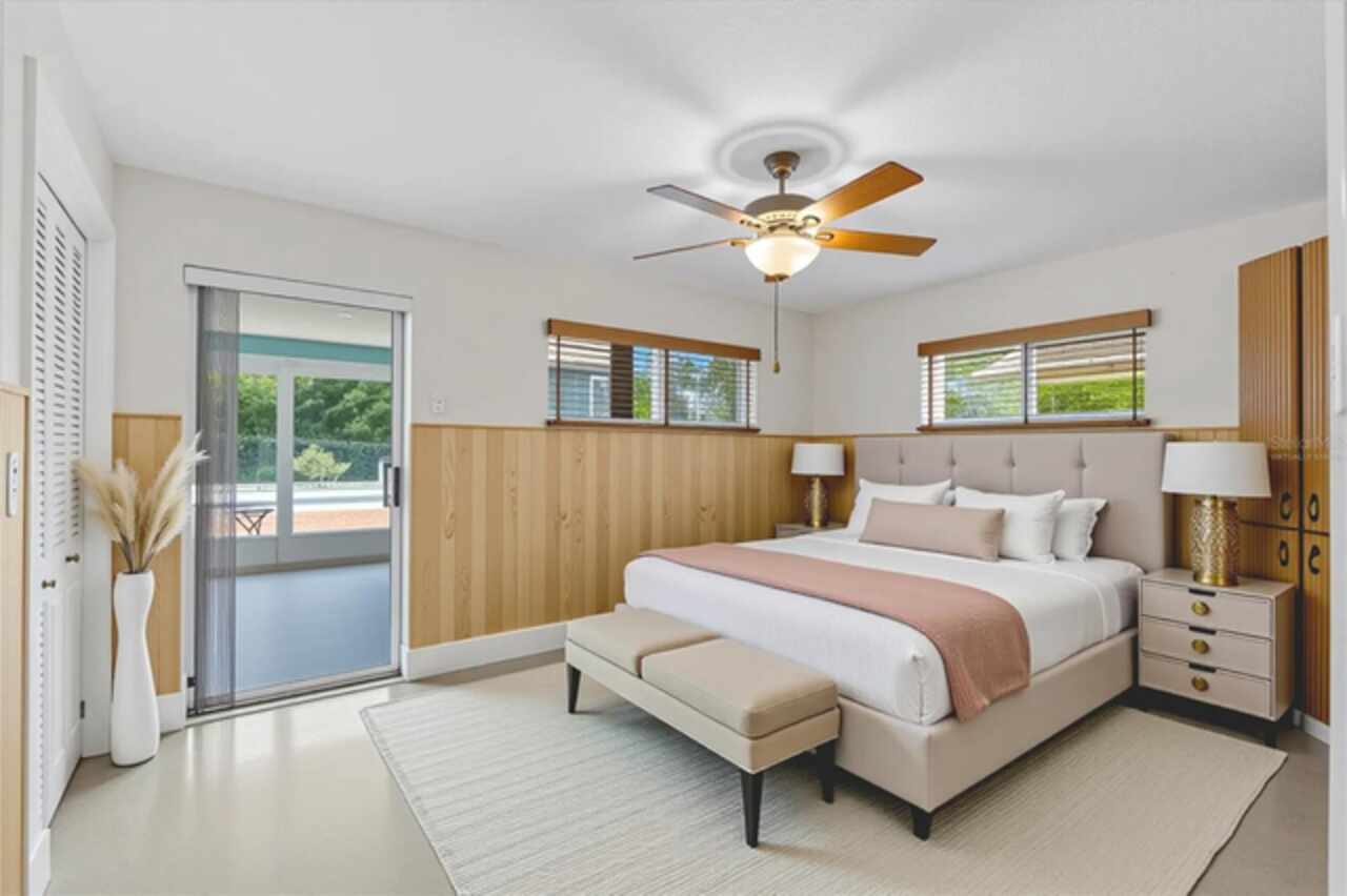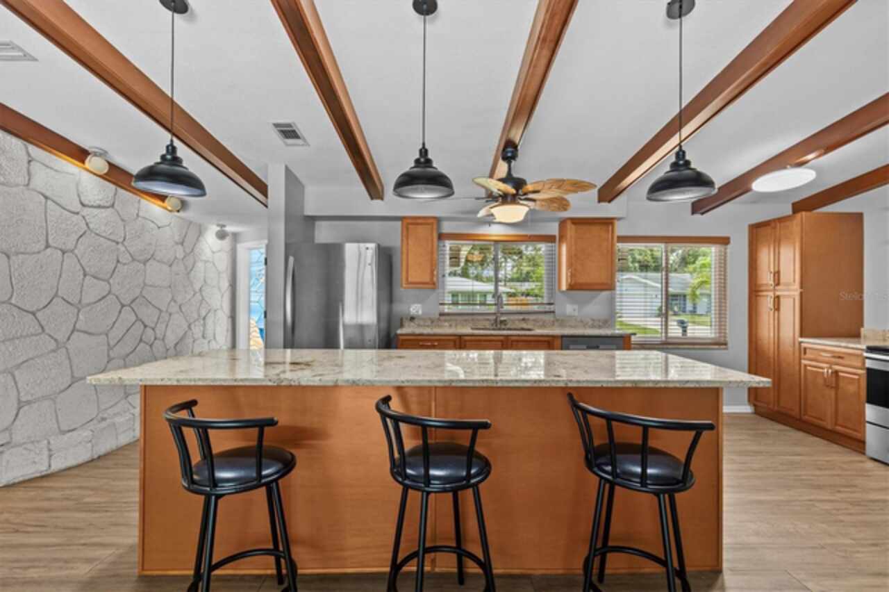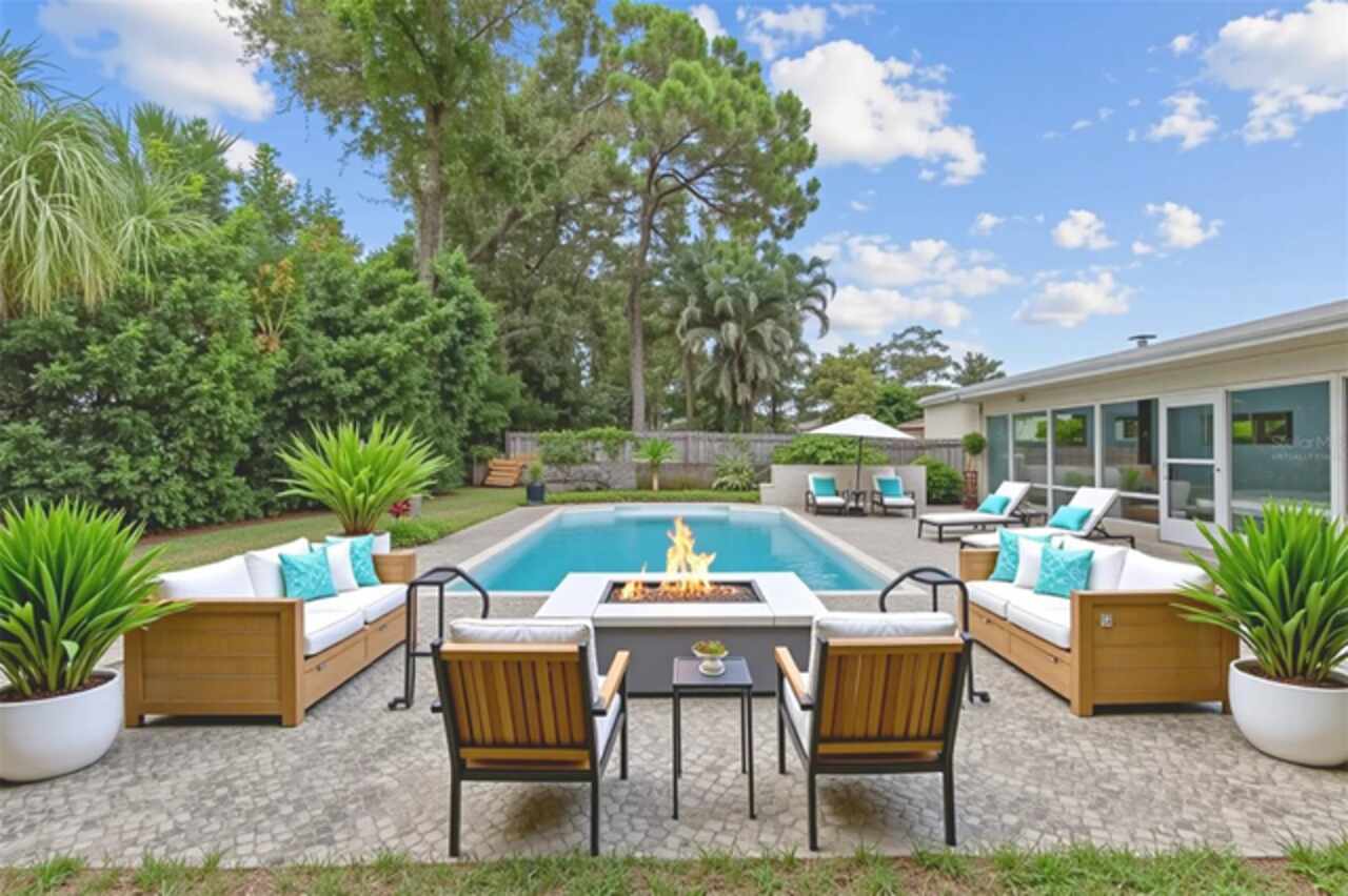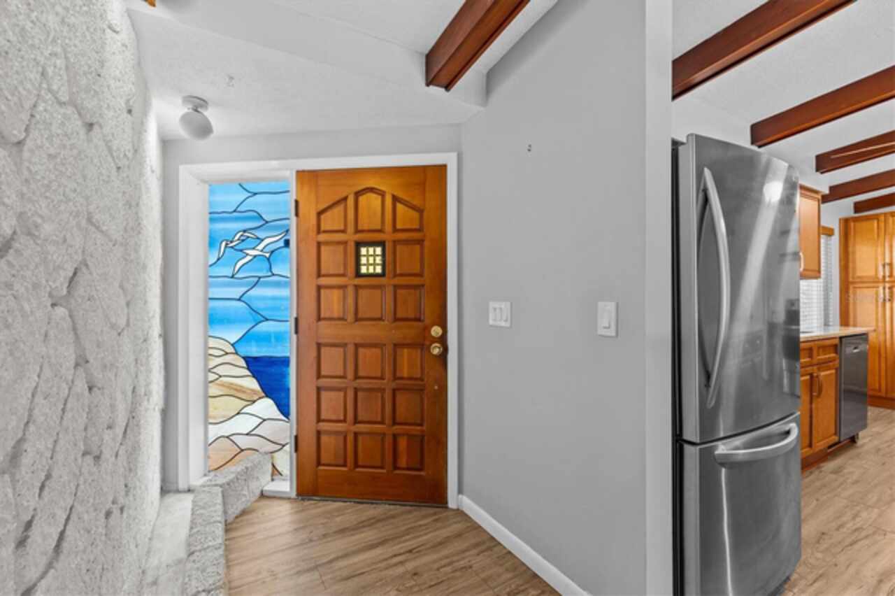Under contract-accepting backup offers. Price Improvement. You don’t need to live in downtown Dunedin to enjoy the ultimate walkable lifestyle. Nestled in Fairway Estates, this residence is just steps from the Pinellas Trail, an 18-hole championship golf course and clubhouse, and the region’s premier visual arts and education center. Nearby, a community center with library, fitness studio & classes, Olympic size pool, tennis and pickleball courts, and picturesque parks ensure endless opportunities for recreation, festivals, and nature exploration—all without ever getting in your car. The optional HOA offers the freedom of no deed restrictions, along with an active calendar of family friendly gatherings. Peace of mind comes with a newer roof and HVAC system, hurricane-rated windows and doors, and X flood zone status that helps keep insurance affordable. Inside, you’ll find an open-concept great room and chef’s kitchen designed for entertaining, with soaring vaulted ceilings, dramatic exposed beams, and luxury plank flooring. European-style wood cabinetry, sleek stainless appliances, oversized island with entertainment bar, and gleaming granite countertops. Host with style in the expansive 35’ x 14’ enclosed lanai, complete with a cozy fireplace and the potential for additional climate-controlled living. The Owner’s Suite is a true retreat with direct lanai access, and a spa-inspired ensuite with updated vanity and mid-century modern sunken tub/shower. Two additional bedrooms share an updated ceramic tile bath, also with a timeless sunken tub/shower. Original mid-century terrazzo floors grace all bedrooms. Step outside to your private backyard oasis with a sparkling in-ground pool. The fully fenced yard provides both privacy and security for kids and pets alike. Homes in Fairway Estates are highly sought-after and rarely available. Don’t miss the chance to claim this exceptional lifestyle—schedule your private tour today.