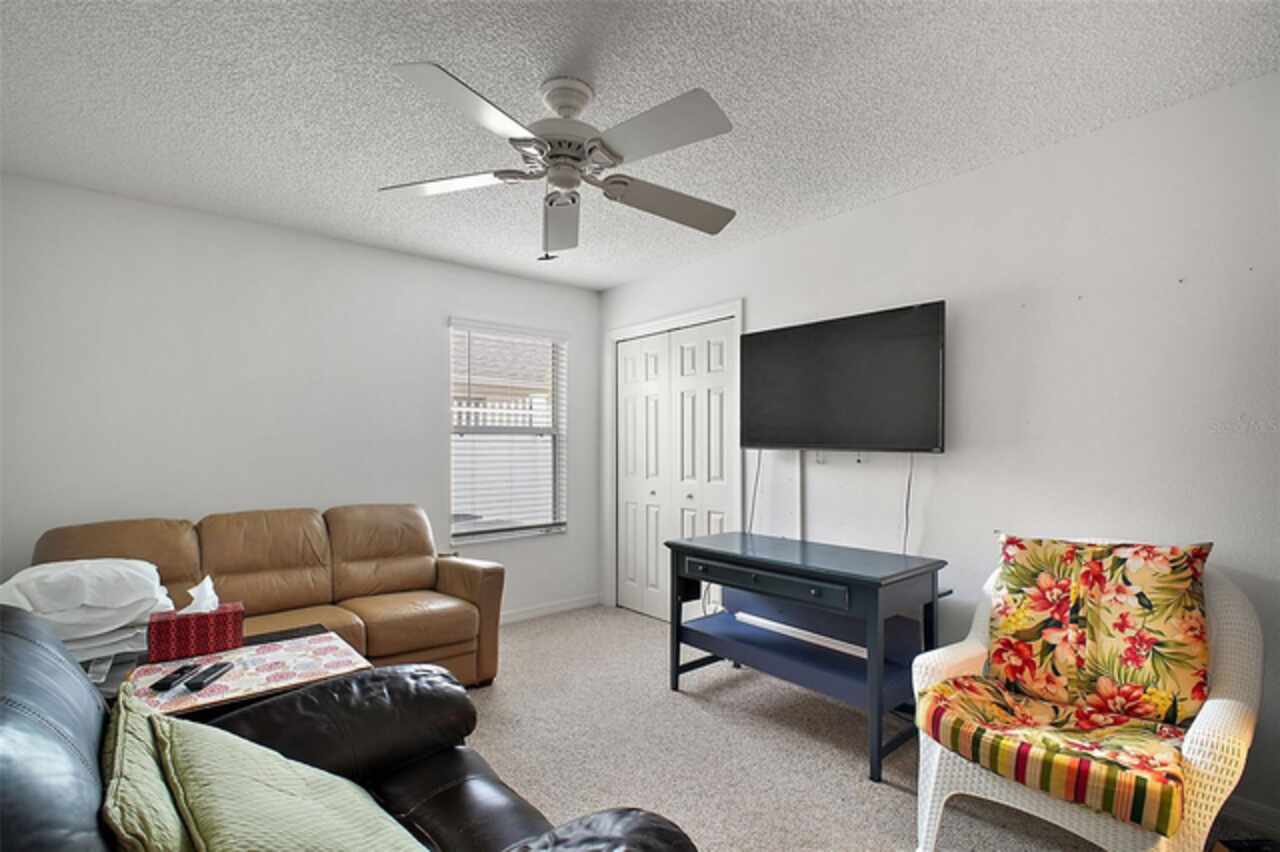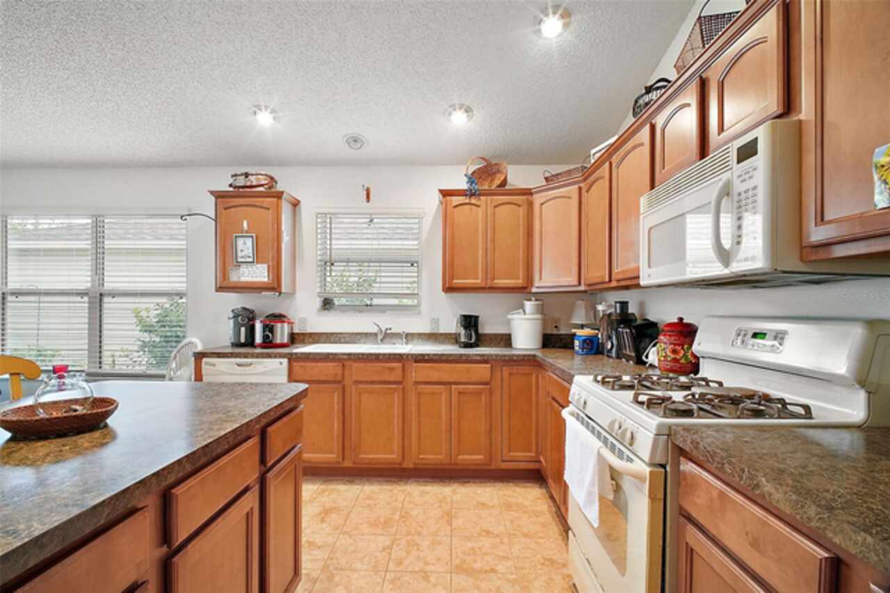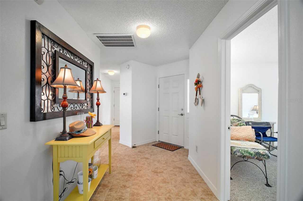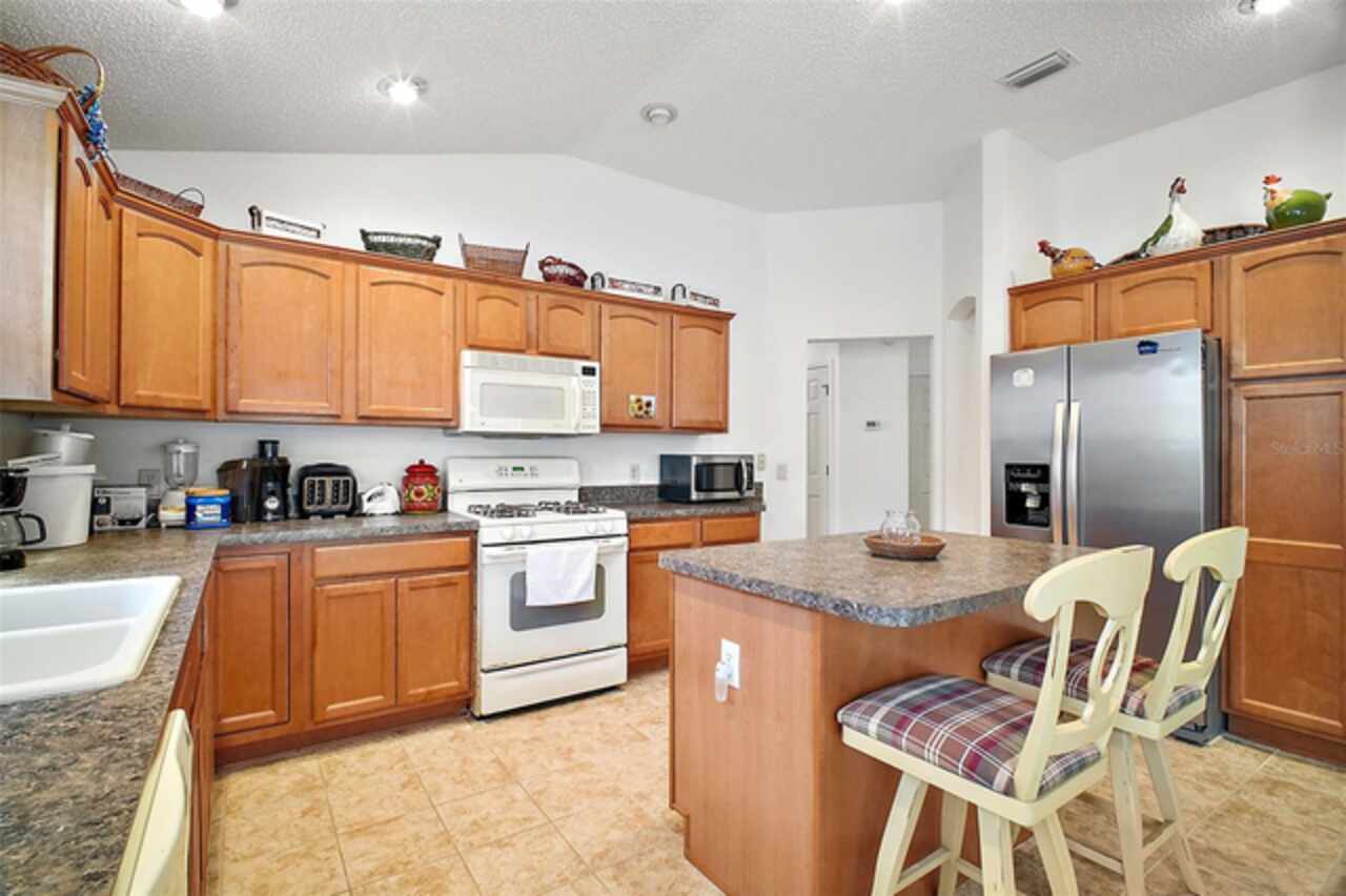Under contract-accepting backup offers. Discover your dream home in this beautifully designed 3 bedroom, 2 bathroom residence, boasting an open and inviting floor plan that's perfect for modern living. Start your day at the charming breakfast bar, bathed in sunlight streaming through the cathedral ceilings that lend a spacious and airy feel to the home. Ceiling fans throughout ensure your comfort is a priority, gently circulating the breeze. The master bedroom is a true retreat, offering ample space and a luxurious ensuite complete with his and hers sinks for added convenience. Situated in a prime central location, this home puts you at the heart of it all. Hop in your golf cart and you're just a swift 10-minute ride away from the vibrant Lake Sumter Landing or the charming Brownwood area. Enjoy easy access to a host of recreational facilities, including Seabreeze Rec Center, Havana Country Club, Cane Garden Country Club, and Lake Miona Rec Center—there's no shortage of options for fun and leisure. Need to run some errands? Colony Shopping Center is just a short drive away, whether you're taking the car or the golf cart. And for peace of mind, the Emergency Room at Trailwinds is conveniently located nearby on 466A. Don't miss out on the chance to call this fantastic house your home. Schedule a viewing today and experience the perfect blend of comfort, style, and convenience! Bond Paid off!!