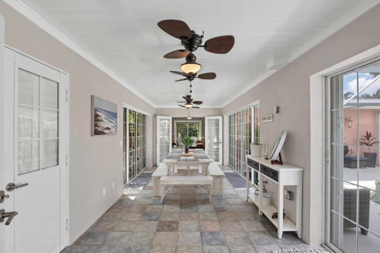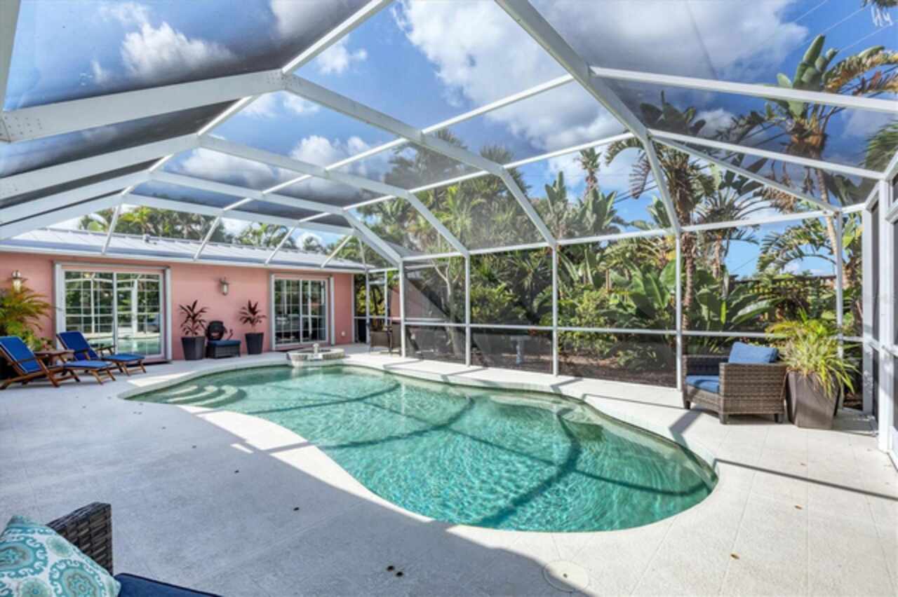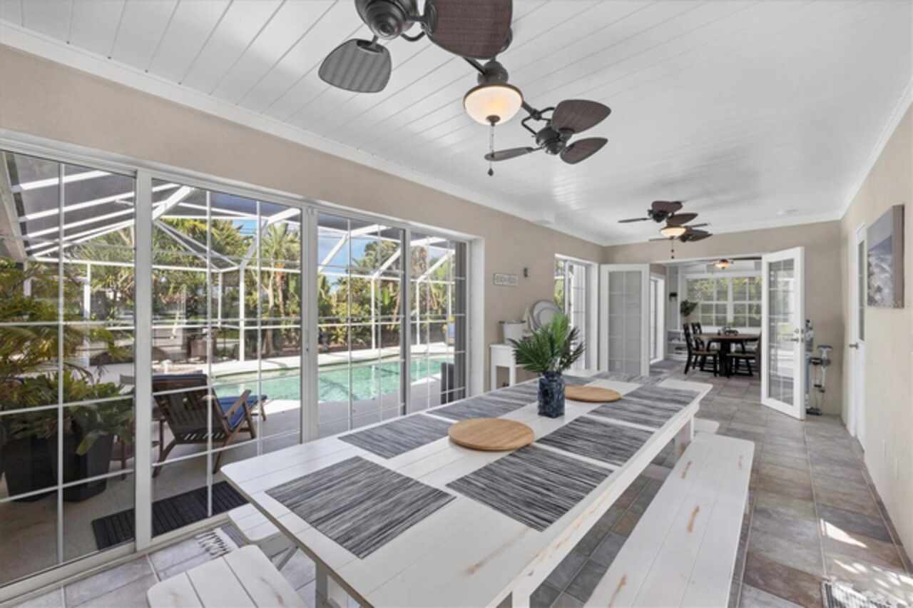 Under contract-accepting backup offers. Welcome to Villa Rosa, an exceptional turnkey residence ideally positioned on a quiet cul-de-sac in the heart of Venice, Florida. This fully furnished pool home is set within biking distance of Venice’s sandy Gulf beaches, dining and specialty shops, while providing rare privacy in a peaceful residential setting. Configured with flexible living arrangements, the home currently functions as a three-bedroom, three-bath layout, with the option to convert to a two-bedroom, two-bath main residence with a one-bedroom, one-bath private suite. The interiors are defined by nautical and Balinese-inspired design, tongue-and-groove ceilings, built-in shelving, and designer window treatments. The renovated kitchen showcases stainless steel countertops, newer appliances, and modern lighting and fans, while the home itself benefits from structural enhancements such as a metal roof, hurricane shutters, and a generator. Outdoors, a saltwater pool anchors the tropical backyard, surrounded by lush landscaping and a pergola-covered sitting area, perfect for Florida’s indoor-outdoor lifestyle. A detached, air-conditioned building expands the possibilities for a yoga studio, office, creative space, or guest suite. Villa Rosa is offered fully equipped, including all furnishings, bicycles, beach chairs, pool essentials and more, and has a strong track record as a highly rated short-term rental. Whether you are seeking a permanent Florida home, seasonal getaway or income-producing asset, this one-of-a-kind property offers the best of all worlds. Don’t miss the opportunity to own a furnished coastal retreat in Venice, schedule your private showing today!