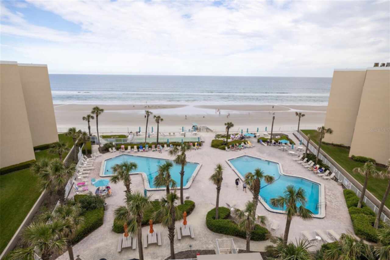 Spectacular oceanfront condo at the very popular Pelican condo situated on the top 6th floor. Beautifully remodeled & tastefully furnished in 2022, this move-in ready beach retreat features 2 bedrooms, 2 baths plus a bonus den or 3rd bedroom. Direct oceanfront balcony provides gorgeous views overlooking two pavered pools, courtyard & the sparkling Atlantic ocean! The Pelican has had both SIRS & Milestone Inspections and the exterior of the building was completed in 2022! The new budget has the monthly maint. fee at $595/mo. from July 1, 2025 to June 30, 2026. Entertaining is easy in this gourmet kitchen with breakfast bar, quartz counters, new appliances, plumbing & lighting. This light & bright condo has an open floorplan & was completely remodeled in 2022, including new hurricane rated windows & doors, new plumbing, new electrical panel & wiring, new HVAC, new washer/dryer & new tiled floors. Decorator finishes include new custom milled white washed nickel gap shiplap siding on all ceilings & accent walls, plantation shutters. Both bathrooms feature quartz countertops with vessel sinks & tiled step-in showers. The bonus room, den, 3rd BR has a pocket door & attractive trundle bed. The Pelican had major building renovations in 2022, which included concrete restoration, new balconies & railings, new windows, new roof, new deck coatings, new waterproofing and paint, and new pool furniture & seawall. This tropical paradise resort includes two oceanfront pools surrounded by beautiful pavered decks, lots of tables & chairs, 2 shuffleboard couurts, 2 gas grills & a private gated walkway to the beach. Well maintained & managed, this condo can be your forever home or rental investment since they do allow weekly rentals! They are pet friendly, allowing 2 pets ups to 80 lbs total. Conveniently located close to a grocery store, The Bakers Table, Touch of Italy, The Garlic & Norwoods Restaurants, Nautilus Fitness, salon & a short walk or bike ride to Publix, Bealls, BBQ & Off the Hook. Only a couple of miles to historic Flagler Ave. Bistros & Shops, where you can enjoy wine tastings, art shows & good music too! Watch spectacular sunrises, sunsets & space launches from this immaculate furnished condo! Just bring your bathing suit & your toothbrush & enjoy the Florida lifestyle you deserve!