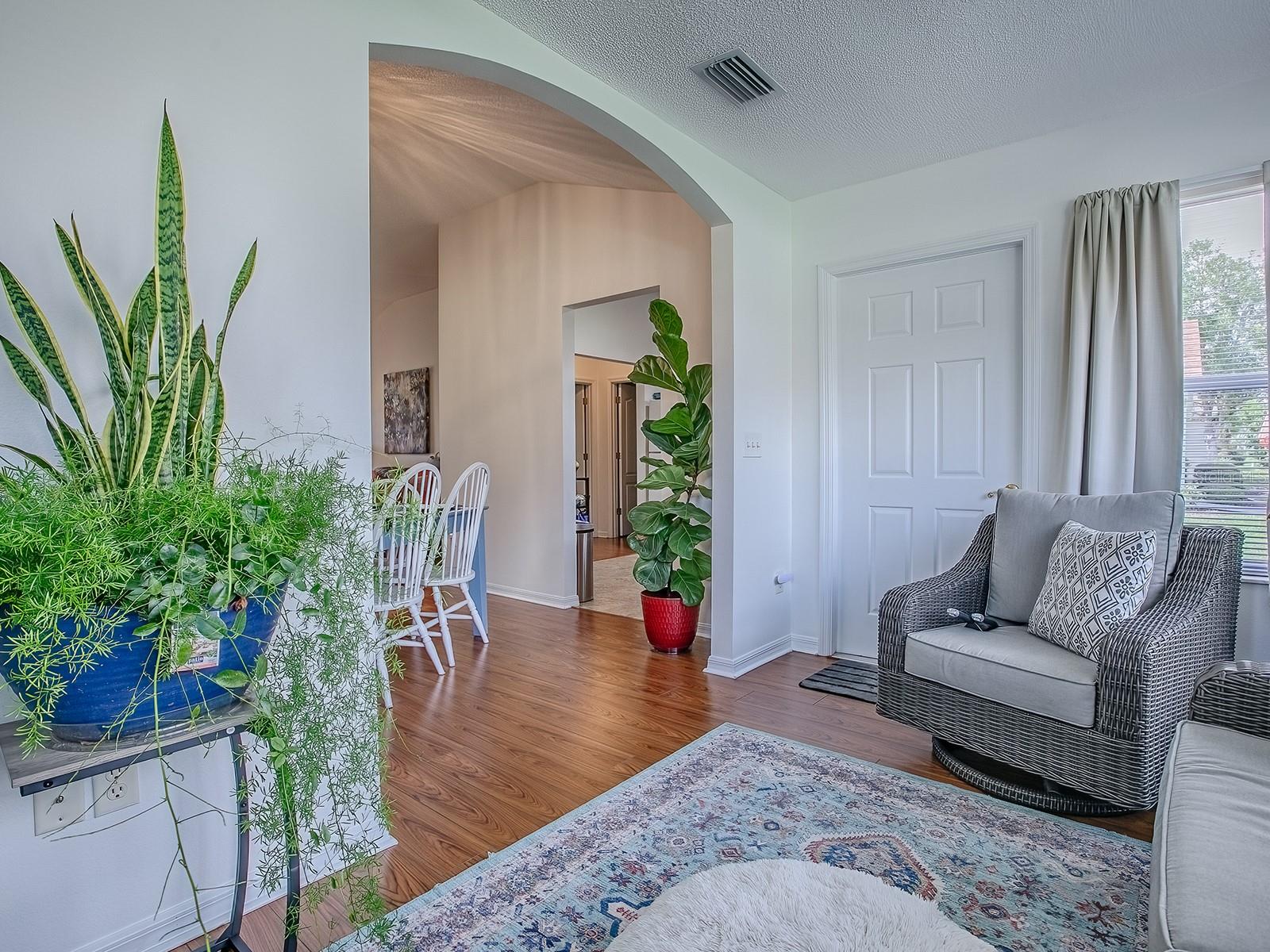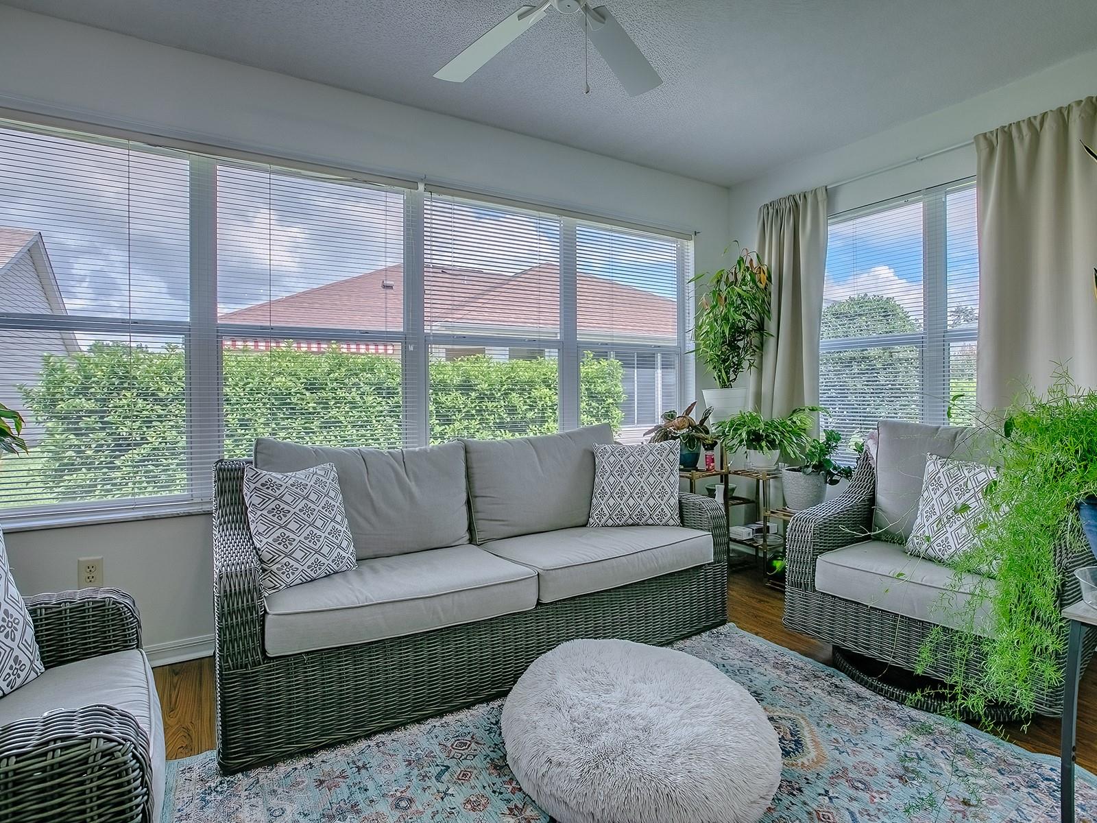 Welcome to the vibrant Village of Santiago, where this charming BOND PAID Amarillo model home offers everything you need to enjoy the active 55+ lifestyle here in The Villages. This area combines comfort, style, and a sense of community. The property is conveniently located near key amenities, including a hospital, medical facilities, shopping, and restaurants along 441. These conveniences ensure that daily needs and healthcare services are easily accessible, giving you more time to enjoy the leisurely pursuits and social activities that this community offers. Coming inside, you're greeted by vaulted ceilings that create an airy and spacious atmosphere. The home's layout features three bedrooms and two bathrooms, thoughtfully designed to promote both privacy and togetherness. The split bedroom plan provides a tranquil retreat in the primary suite, which boasts a large vanity, a glass-doored shower, and a generous walk-in closet. Everything you need for comfort and relaxation. The living area is perfect for entertaining, with updated fixtures adding a touch of modern elegance. There's no carpet here, offering a clean and seamless aesthetic throughout. Adjacent to the living room, the dining area offers a welcoming space to enjoy meals, easily accessible from the kitchen for convenience. One of the standout features of this home is its fabulous Florida Room, a perfect space for unwinding with a book or hosting friends. Natural light pours in, enhancing the open feel and inviting the outdoors inside. Outside, the home continues to impress with its 2020 Roof, inviting front porch and well-manicured landscaping. It’s the perfect spot for enjoying a morning coffee or chatting with neighbors. The backyard features a slab that's ideal for setting up an outdoor table and grill, making it an excellent spot for weekend barbecues or simply enjoying the pleasant Florida evenings. The practical aspects of the home haven’t been overlooked either, with a two-car garage featuring an epoxy floor coating, offering durability and an appealing finish. Living in the Village of Santiago means you're not just buying a home; you're becoming part of a thriving community. Enjoy the nearby recreation center, which provides ample opportunities for socializing and keeping active. Whether it's a leisurely stroll around the pond or dining at the local restaurant, there’s something for everyone. This location offers the perfect balance, providing tranquil living with all the conveniences just a stone's throw away. It’s not just a place to live; it's a lifestyle. Experience a new chapter in this vibrant community, where every day offers something exciting and new. Embrace the opportunities that await here in The Villages.