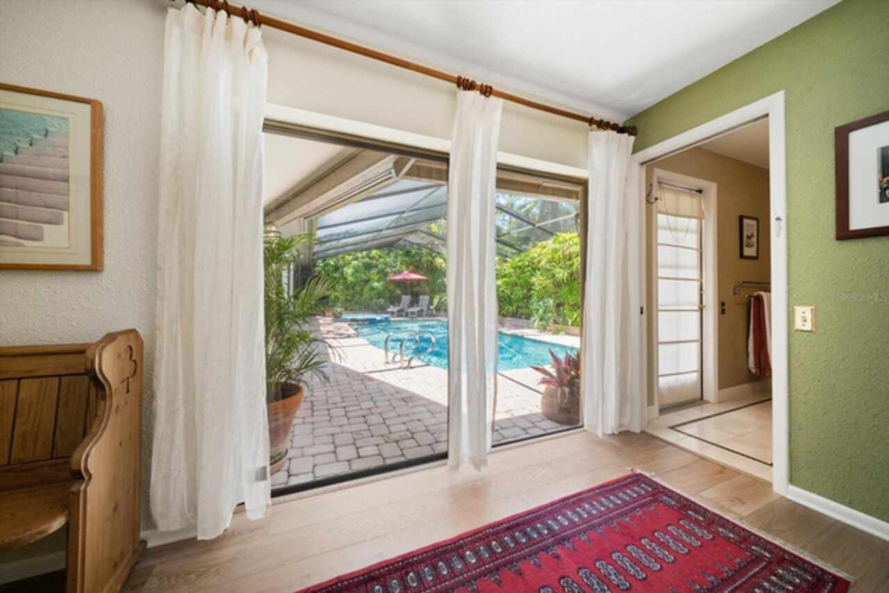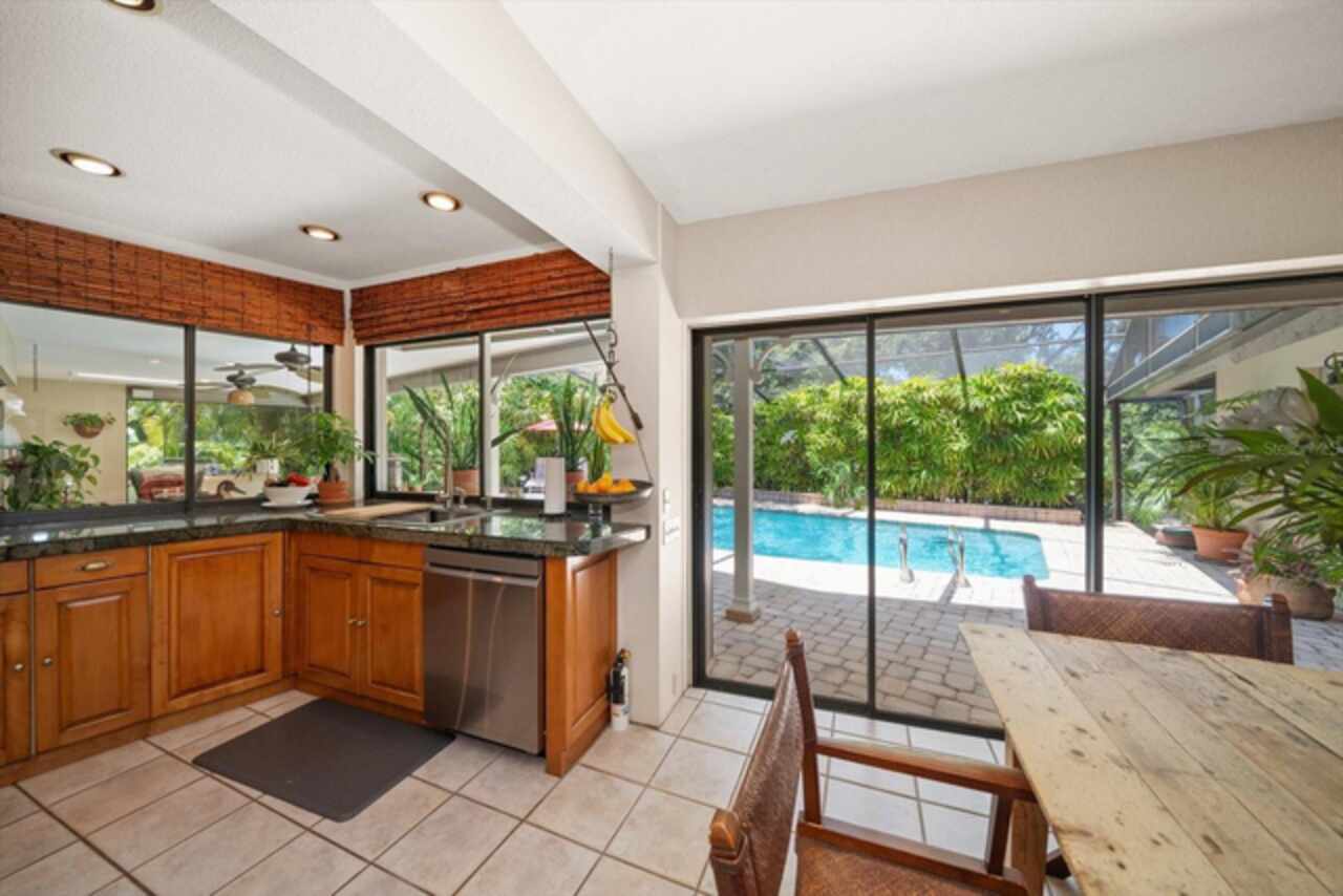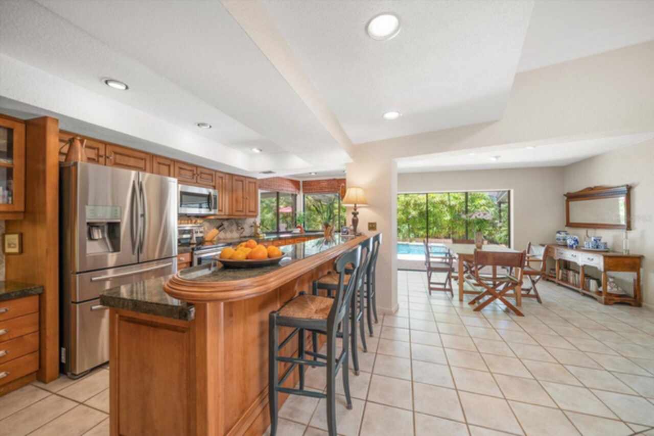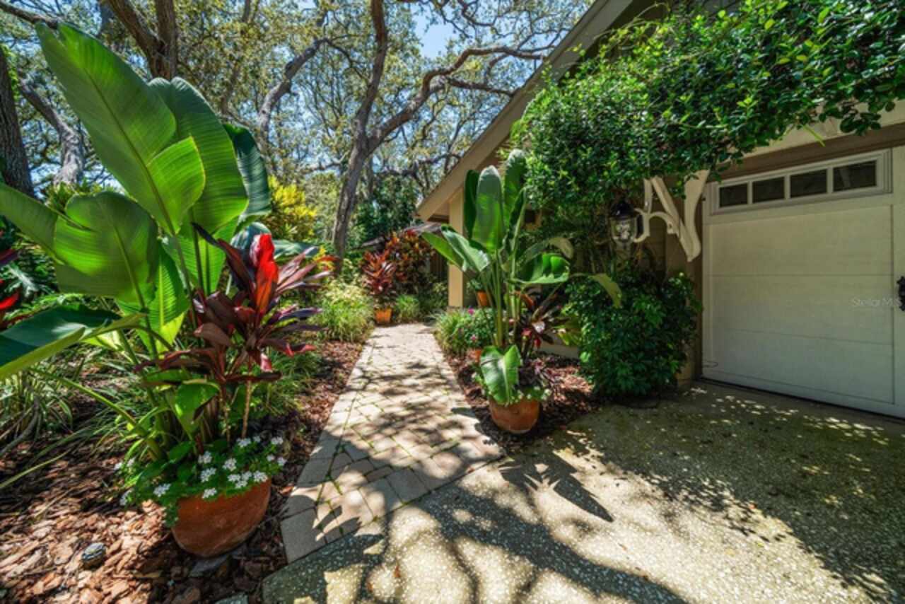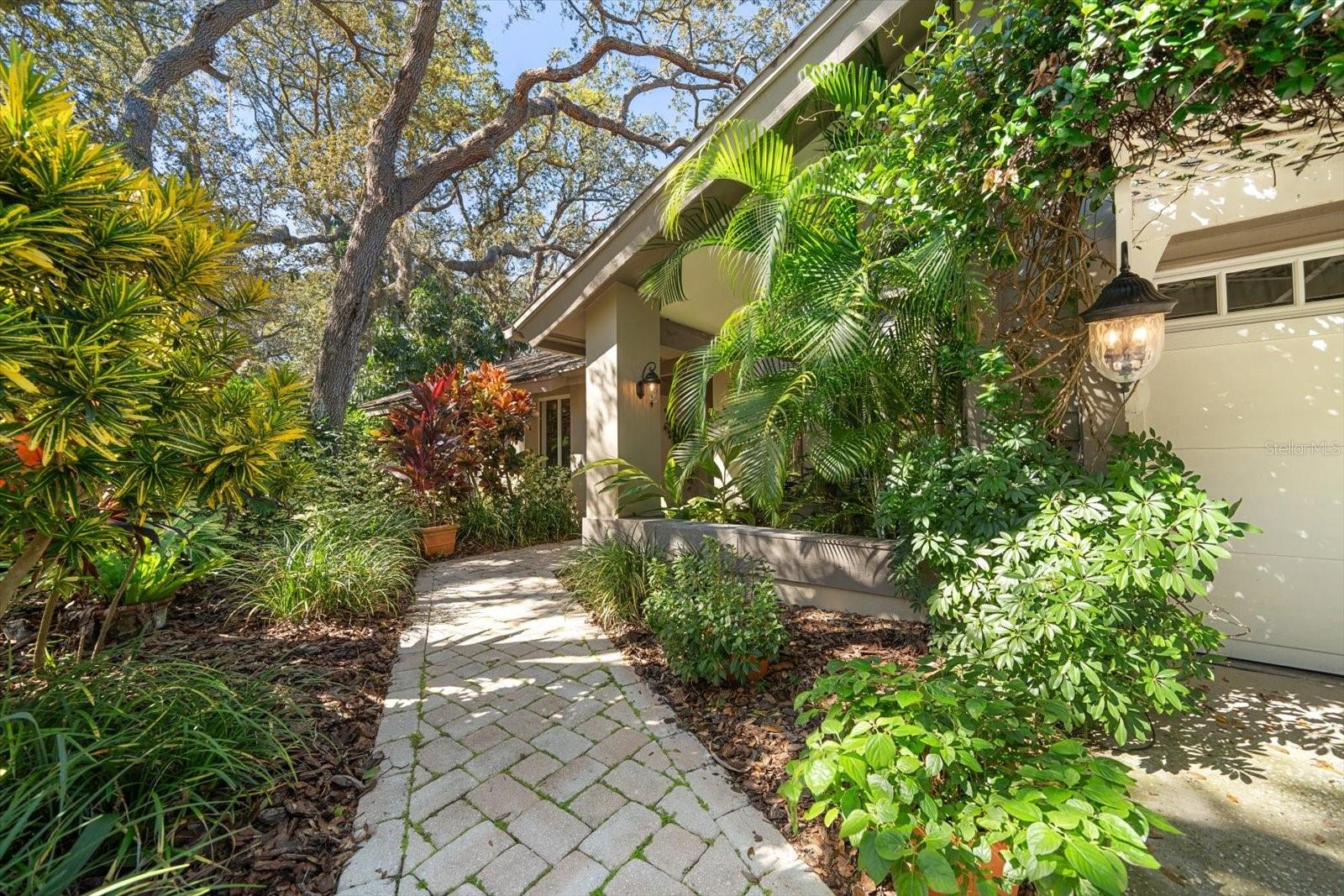 In the heart of desirable Dunedin on a quiet cul-de-sac in the coveted Weybridge Woods neighborhood, this lovely home offers elegance, comfort, and exceptional outdoor living. Tropical landscaping and majestic oaks provide privacy and a unique curb appeal. Follow the paver entry to the beautiful double leaded-glass front doors. Inside, the formal living room features an impressively high ceiling, fireplace and sliders opening to the lanai, enclosed pool and spa. A spacious floor plan lends to flow and a formal dining room impresses with a garden view. Skylights, custom built-ins and a second fireplace make the large family room perfect for entertaining or lounging. The dine-in kitchen features granite countertops, stainless steel appliances and windows and sliders that open to the pool. Beyond it, winding shell pathways meander through lush, tropical foliage. The split bedroom plan provides exceptional privacy. Just off the great room/kitchen, a hall, two bedrooms and bath with pool access make it perfect for family or guests. On the opposite end of pool, the large primary suite opens to the lanai. A newly renovated, spa-like ensuite with a garden tub, custom tiled walk-in shower, double vanity and private commode make it a dream space. A fourth bedroom has a small private hall and bathroom. The floor plan and property layout make this home a rare find. Blocks from Dunedin Country Club, downtown, restaurants, shops, parks and marina, this golf cart friendly community is minutes away from the pristine beaches of Honeymoon and Caladesi Island.