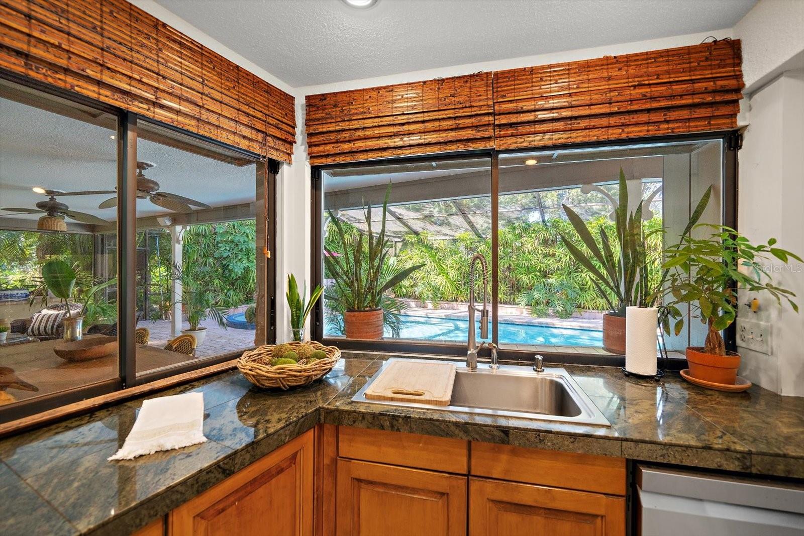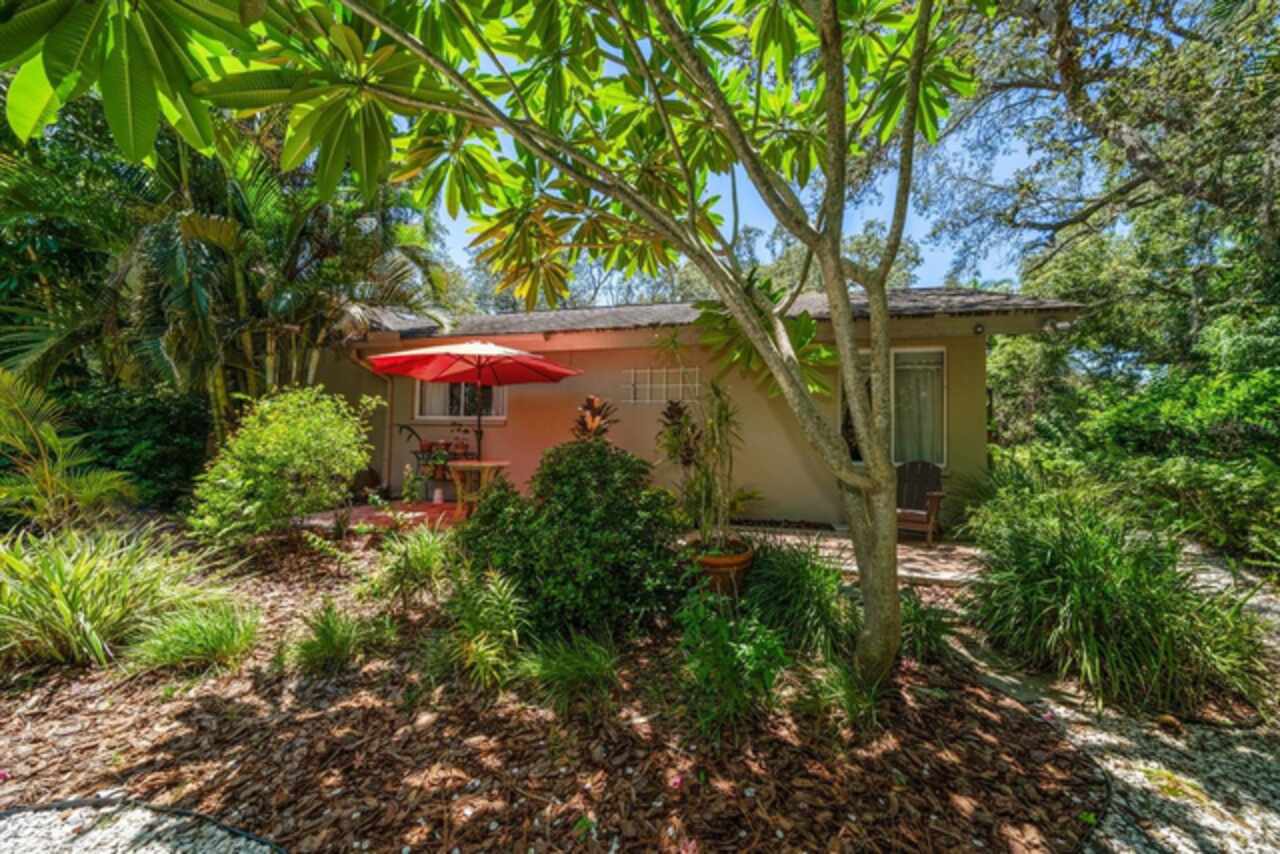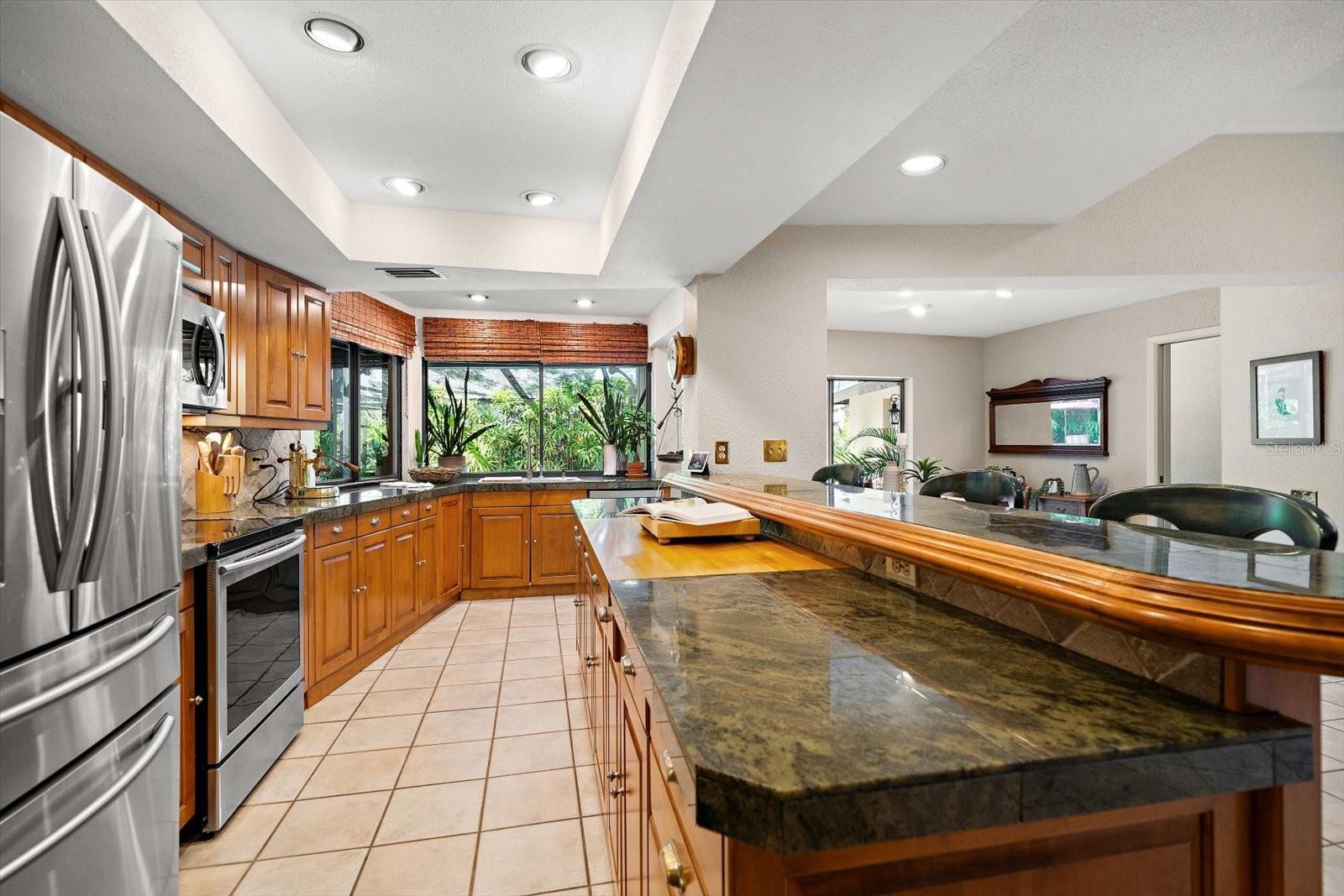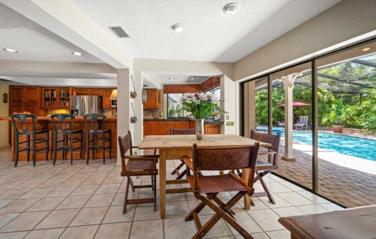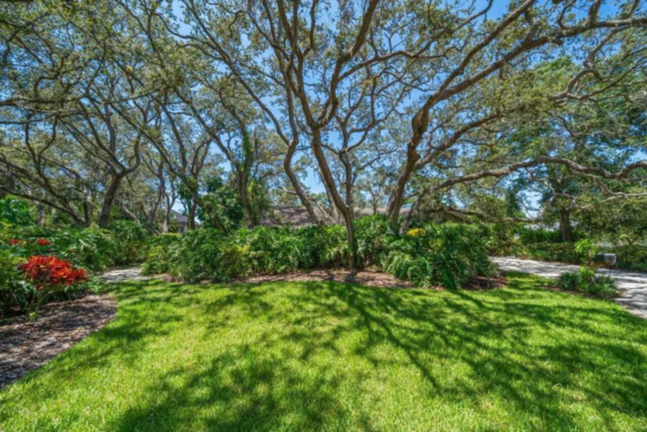 In the heart of desirable Dunedin on a quiet cul-de-sac in the coveted Weybridge Woods neighborhood, this lovely home offers elegance, comfort, and exceptional outdoor living. Tropical landscaping and majestic oaks provide privacy and a unique curb appeal. Follow the paver entry to the beautiful double leaded-glass front doors. Inside, the formal living room features an impressively high ceiling, fireplace and sliders opening to the lanai, enclosed pool and spa. A spacious floor plan lends to flow and a formal dining room impresses with a garden view. Skylights, custom built-ins and a second fireplace make the large family room perfect for entertaining or lounging. The dine-in kitchen features granite countertops, stainless steel appliances and windows and sliders that open to the pool. Beyond it, winding shell pathways meander through lush, tropical foliage. The split bedroom plan provides exceptional privacy. Just off the great room/kitchen, a hall, two bedrooms and bath with pool access make it perfect for family or guests. On the opposite end of pool, the large primary suite opens to the lanai. A newly renovated, spa-like ensuite with a garden tub, custom tiled walk-in shower, double vanity and private commode make it a dream space. A fourth bedroom has a small private hall and bathroom. The floor plan and property layout make this home a rare find. Blocks from Dunedin Country Club, downtown, restaurants, shops, parks and marina, this golf cart friendly community is minutes away from the pristine beaches of Honeymoon and Caladesi Island.