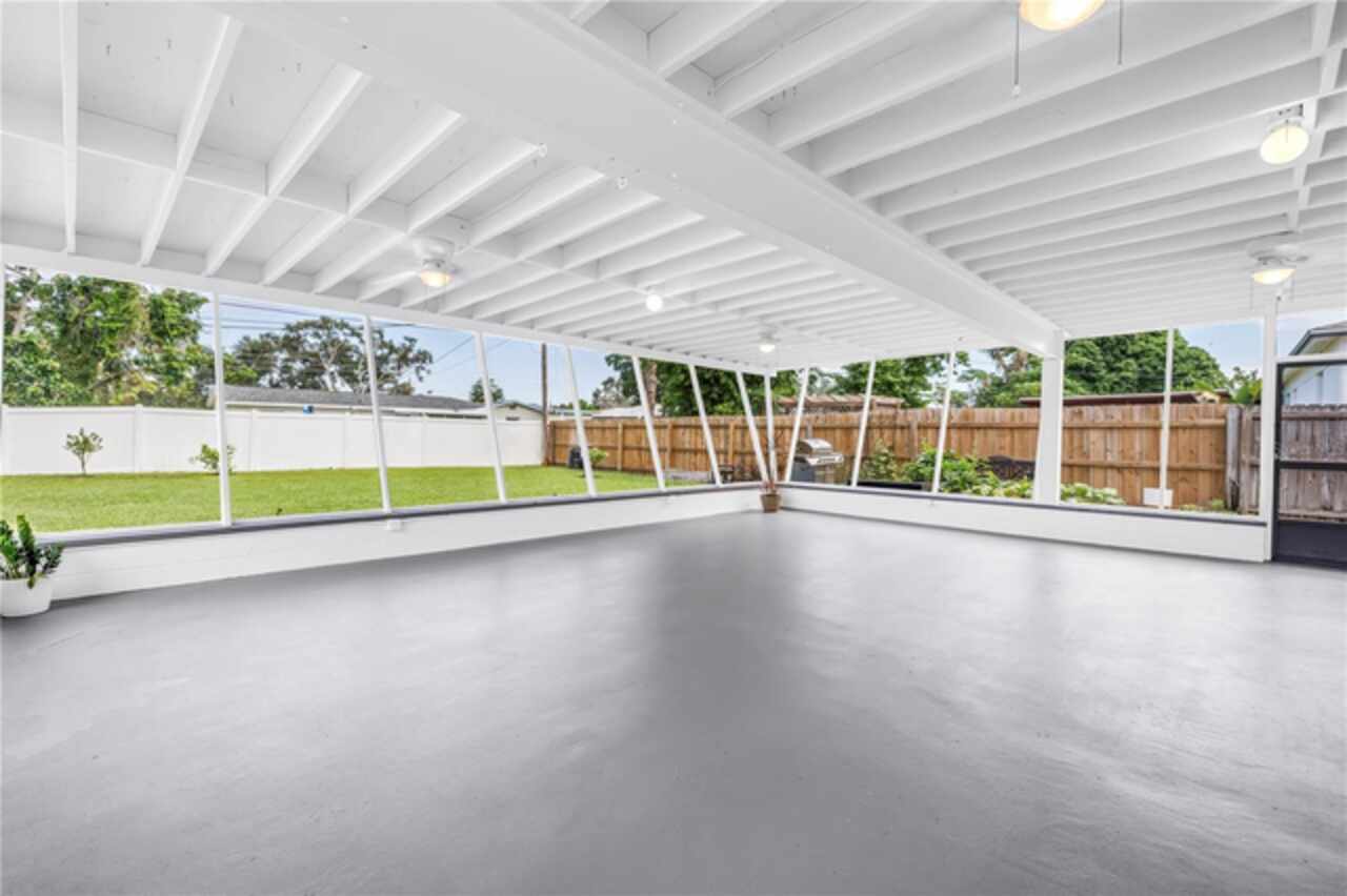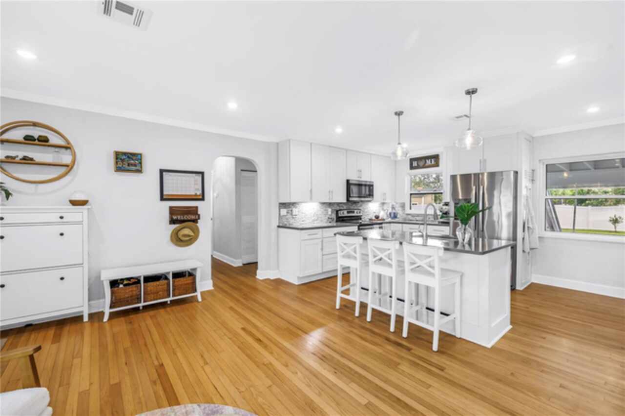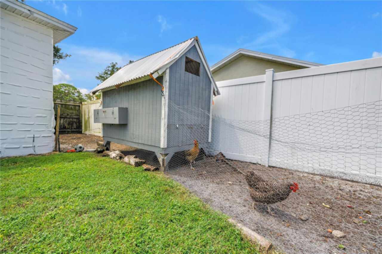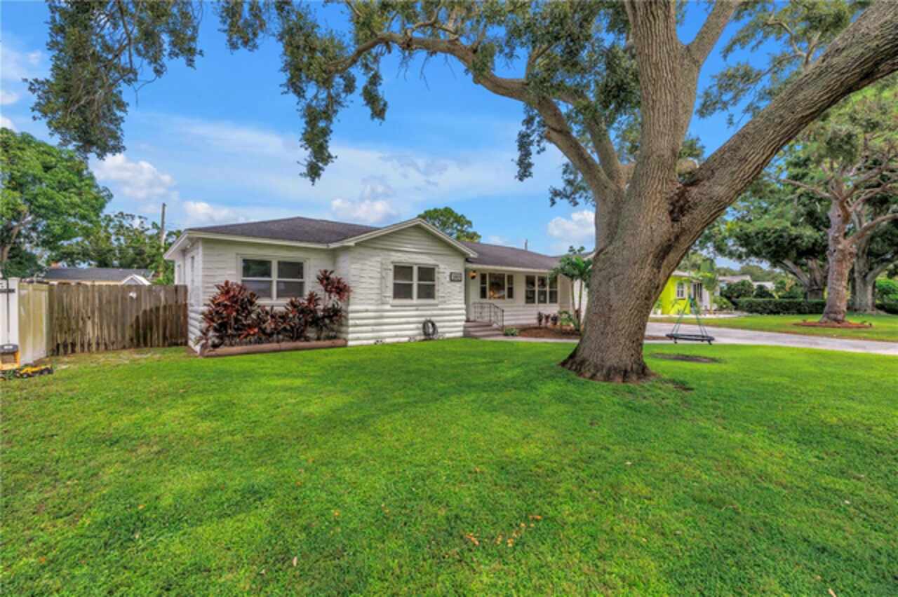 Welcome to this beautifully renovated 4-bedroom, 2-bath home featuring a thoughtful split floor plan on a large 1/4 acre lot in Lakewood Estates. Enjoy the seamless flow of the open living areas, highlighted by modern finishes, updated kitchen and abundant natural light. Master suite features a new en-suite bathroom and walk in closet. Three more bedrooms and hall bathroom all feature smart storage and wood floors. Step outside onto the large cantilevered screened porch — an ideal spot to relax and entertain while enjoying the fresh air in any weather. The expansive backyard is a true outdoor rarity - a flourishing garden space ready for your green thumb, large storage shed, and a charming chicken coop, plus even more yard to make your own! Located high and dry out of the flood zones, it is also eco-friendly with solar panels for super low electric bills year round, and pre-wired for generator hookup. Located around the corner from the St. Petersburg Country Club, and just minutes to I-275, downtown St Pete, and the Gulf Beaches. This home blends comfort, style, and practicality, making it a perfect retreat for modern living.