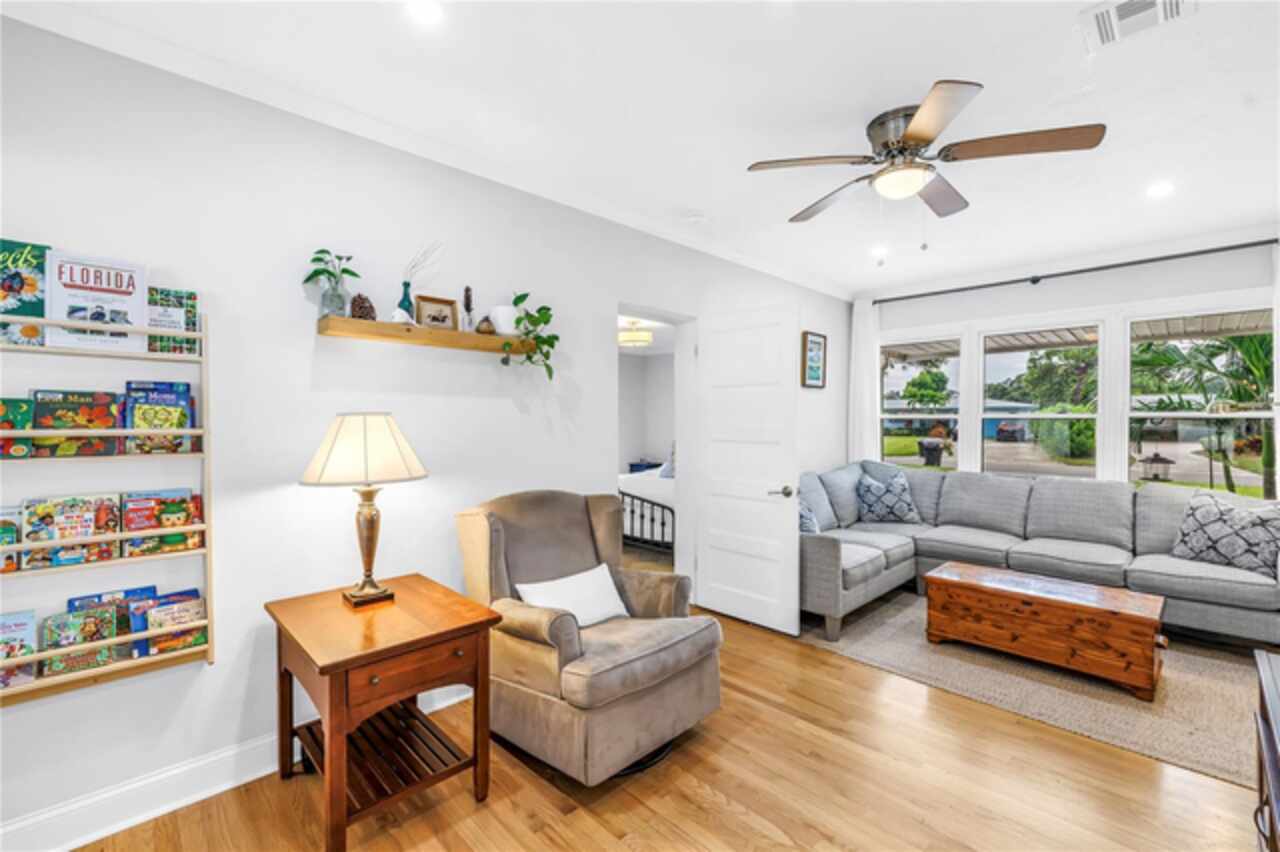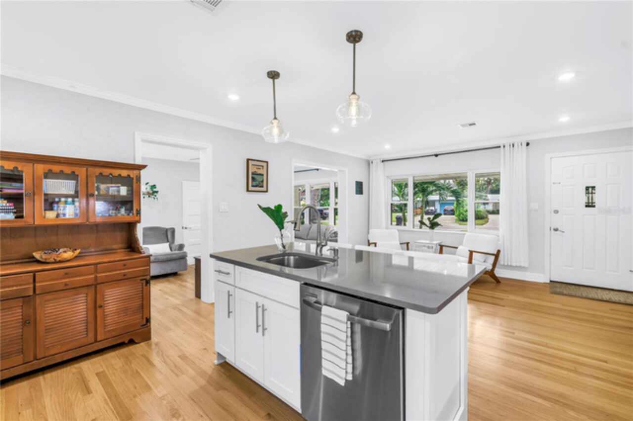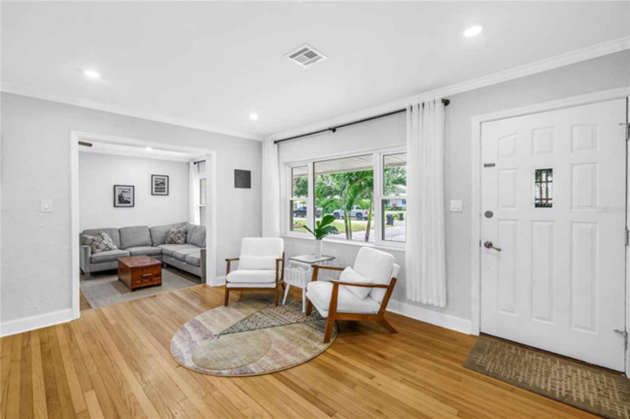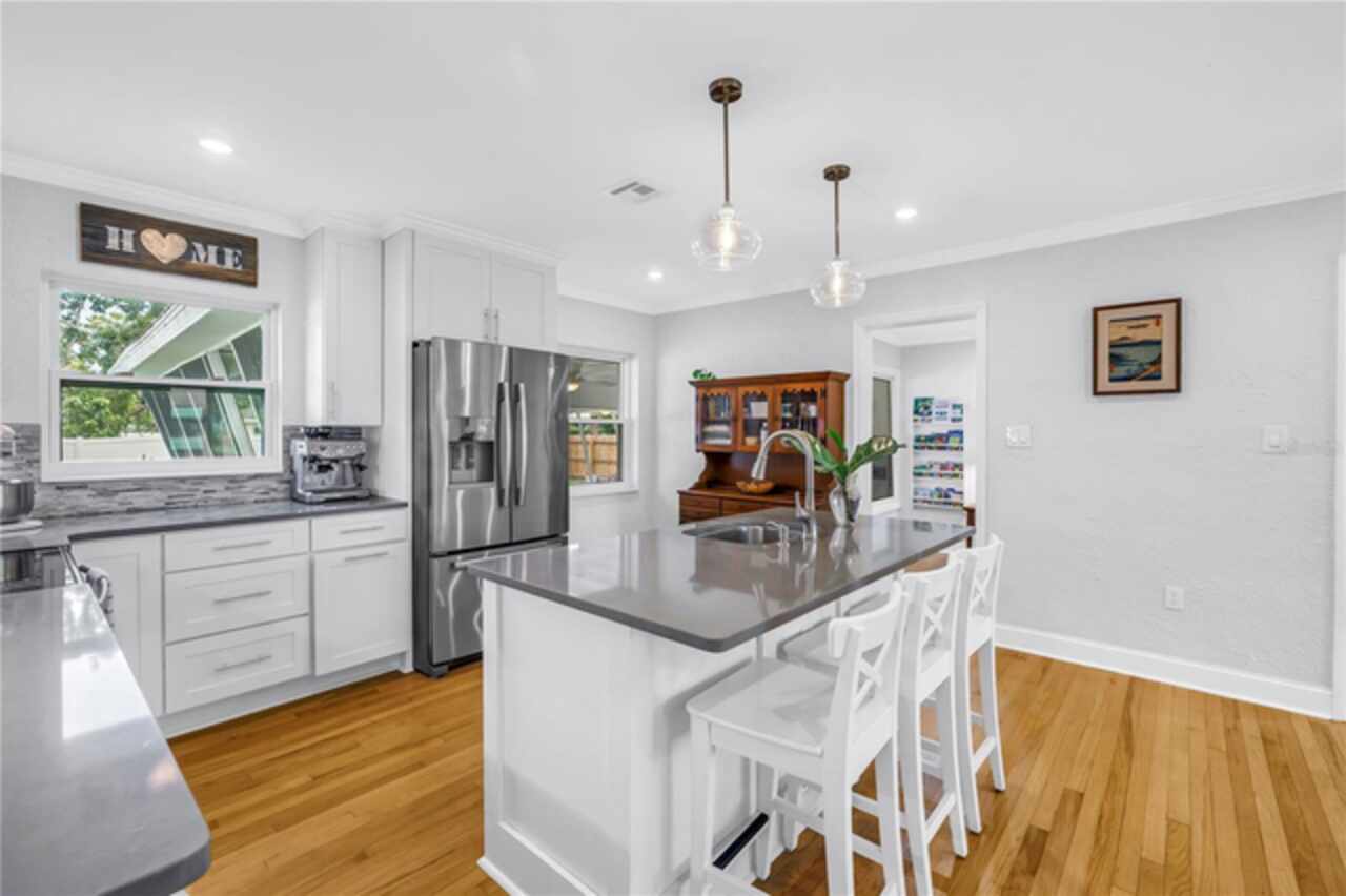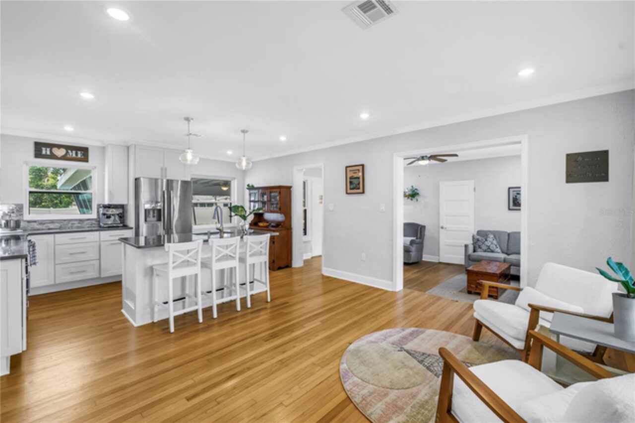Welcome to this beautifully renovated 4-bedroom, 2-bath home featuring a thoughtful split floor plan on a large 1/4 acre lot in Lakewood Estates. Enjoy the seamless flow of the open living areas, highlighted by modern finishes, updated kitchen and abundant natural light. Master suite features a new en-suite bathroom and walk in closet. Three more bedrooms and hall bathroom all feature smart storage and wood floors. Step outside onto the large cantilevered screened porch — an ideal spot to relax and entertain while enjoying the fresh air in any weather. The expansive backyard is a true outdoor rarity - a flourishing garden space ready for your green thumb, large storage shed, and a charming chicken coop, plus even more yard to make your own! Located high and dry out of the flood zones, it is also eco-friendly with solar panels for super low electric bills year round, and pre-wired for generator hookup. Located around the corner from the St. Petersburg Country Club, and just minutes to I-275, downtown St Pete, and the Gulf Beaches. This home blends comfort, style, and practicality, making it a perfect retreat for modern living.