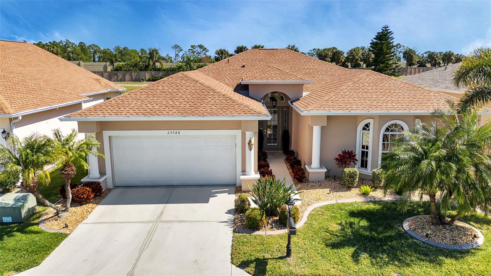 WOW!!!! You're going to fall in LOVE with this SPACIOUS EATON floor plan with GORGEOUS VIEW of water/golf in the gated golf course/active resort of highly desirable Kings Gate, a 55+ community (evacuation zone D - have not been under any evacuation order and NOT in a flood zone) This FULLY FURNISHED (quality/name brand) home has tons of updates/upgrades - including Travertine tile in the enclosed and UNDER AIR lanai, paver patio, convection oven-granite counters-pull outs to maximize storage-finger print resistant appliances-and under & over counter lighting ALL in kitchen, plantation shutters throughout, tinted windows, hang down storage in garage along with insulated garage door, 2023 ROOF, 2013 AC, 2021 Appliances and Accordion shutters. This home has been meticulously maintained and is MOVE-IN ready. Step inside this beauty and your eyes will gaze skyward to the 11 ft high ceilings before looking beyond the massive great room and into the large lanai with that decorative tile flooring and a serene view of water/golf beyond. The to-die for kitchen features an island with an additional sink/disposal and plenty of counter and cabinet space. The kitchen opens to the family room providing plenty of spaces for entertainment/relaxation. No question - you're going to love having your morning coffee and/or favorite evening beverage in the lanai overlooking the pond and observing the Florida wildlife. The large master bedroom to the back right features his/her WALK-IN closets along with dual vanity and separate tub and shower. Both guest bedrooms located to the front right feature WALK-IN closets as well. And if you haven't been to Kings Gate before - you're going to love the options for activity (Olympic size heated swimming pool and spa, tennis courts, pickle ball, lawn bowling, shuffle board, bocce, horseshoes, gym, billiards, library, euchre, bingo, bridge, Texas hold em, poker, mahjong and more). The onsite and NEWLY REMODELED Lions Den restaurant and bar is super convenient and also offers Tuesday night Karaoke and monthly trivia contests. Many residents love the fact that they are just a golf cart ride away from the shopping plaza that provides you access to grocery store, drug store, bank, ice-cream shop, restaurants and shopping. Want to explore outside of Kings Gate - your minutes away from the restaurants and shops of downtown Punta Gorda and Fisherman's village. And if you want to explore more of Florida's fun spots you’re near I75 to quickly head north or south. An AWESOME home with all those updates/upgrades with a great view in a PREMIER gated community needs to be experienced to be understood. Call today for a private showing and a golf cart tour of the community/amenities.