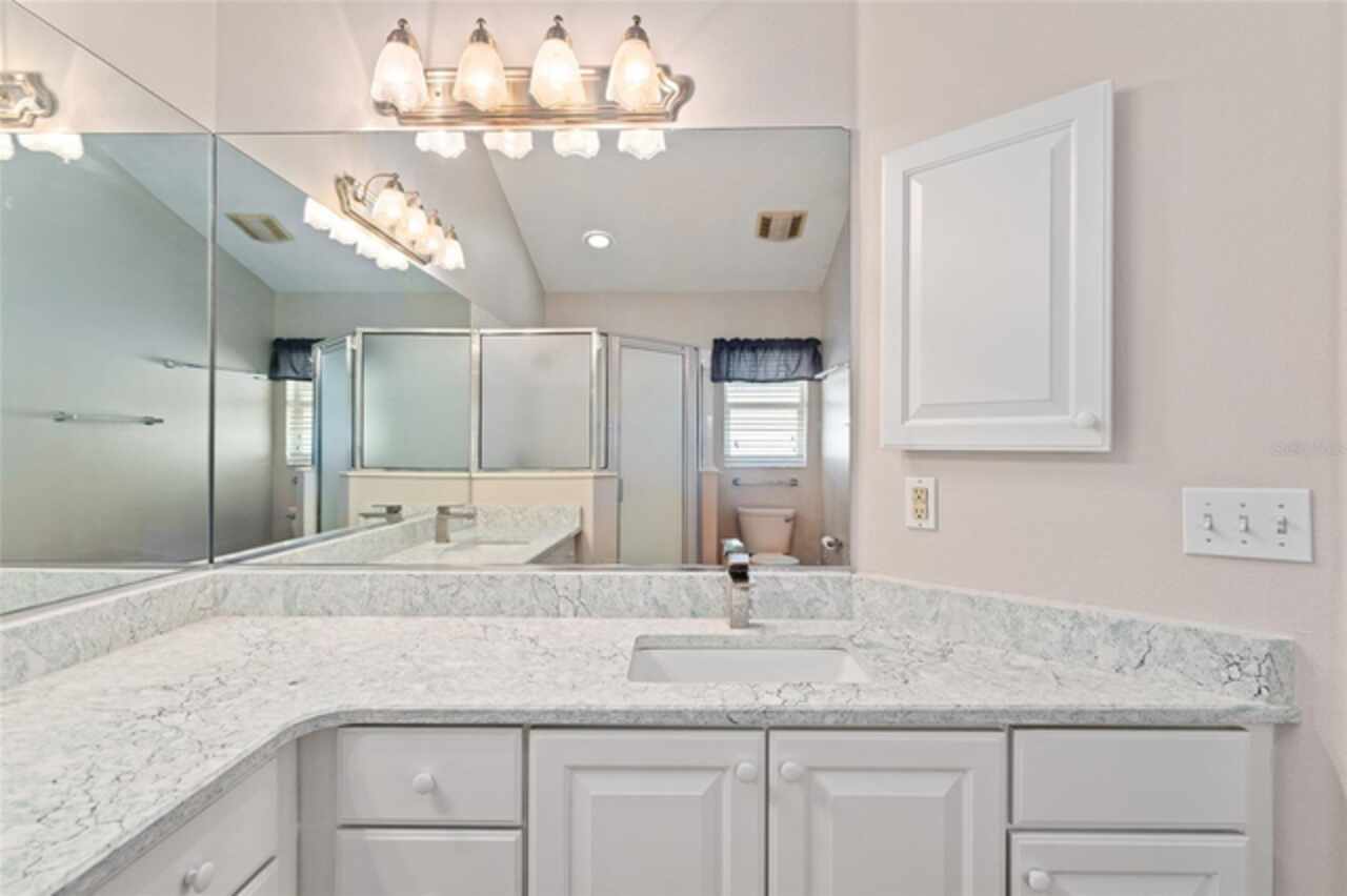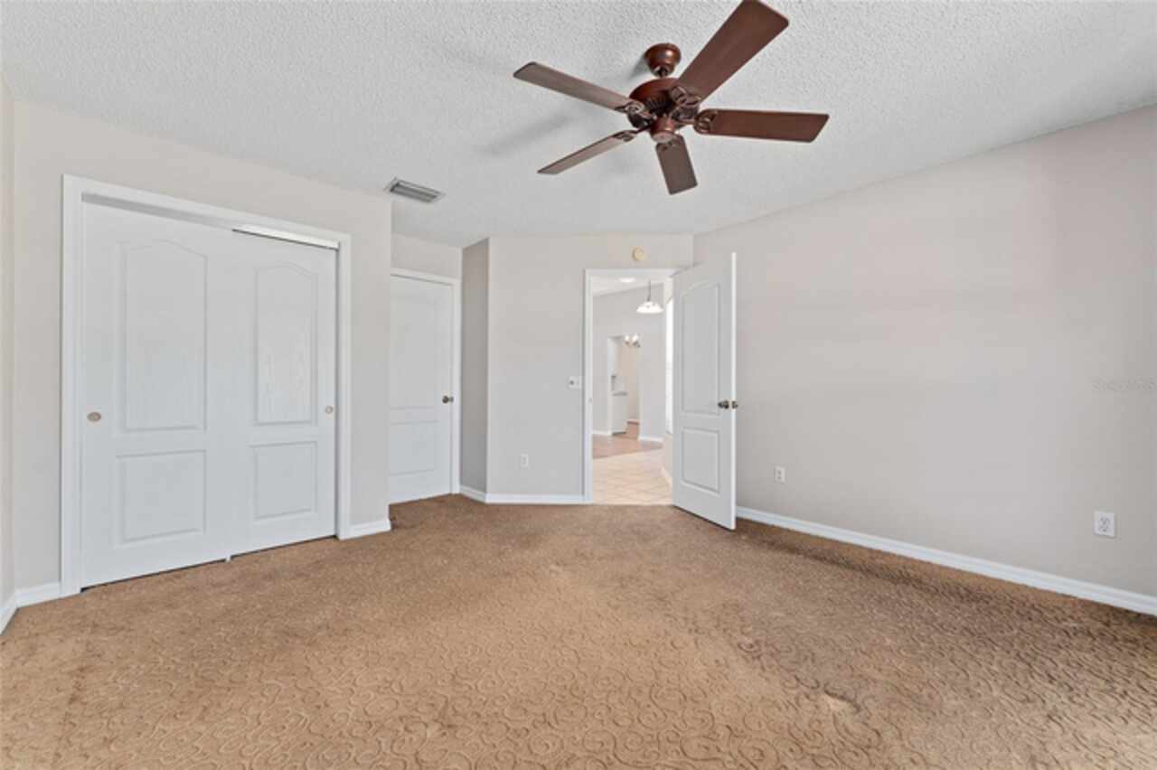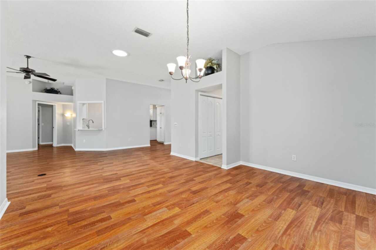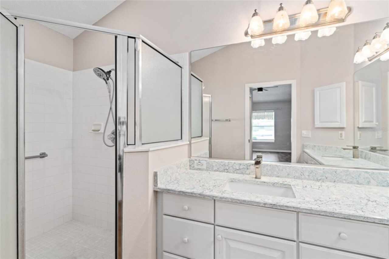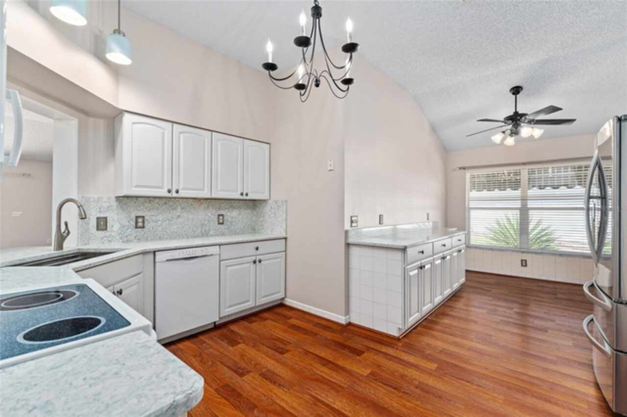 Under contract-accepting backup offers. UPDATE 10/23/2025: Seller Will Consider OWNER FINANCING! Discover the PERFECT BLEND of UNIQUE DESIGN, COMFORT, and PRIVACY in this expanded Designer located in the VILLAGE of SANTIAGO! Perfectly positioned on an oversized 0.218-acre lot, this well-maintained 3 BR/2 BA/2 Car Garage home offers privacy w/ NO HOMES BEHIND. Enjoy charming CURB APPEAL highlighted by an ARCH SHINGLE HIP ROOF (2019), CONCRETE BLOCK & STUCCO exterior, and MATURE LANDSCAPING featuring ROCK-FILLED BEDS & a variety of palm trees. Prepare to be impressed by the METAL GATE ENTRY leading to the elegant COVERED FRONT PORCH featuring a concrete patio enclosed by a decorative CBS half-wall w/ 2 mini-columns. Stylish outdoor lighting mounted atop the columns illuminate this area in the evenings. Accentuated by matching sidelights & an overhead transom, the welcoming front door has a full glass storm door which provides for protection from the weather elements. Step inside the FOYER and experience the spacious ambiance of this OPEN CONCEPT, SPLIT BEDROOM FLOOR PLAN w/ 2145 SF of living area. The sightline is perfectly centered from the FOYER through the LIVING ROOM to the SLIDING GLASS DOORS with SOUTHERN REAR EXPOSURE. Natural light is generous in the expansive LIVING ROOM which exudes warmth w/ VAULTED CEILINGS & rich WOOD LAMINATE FLOORING. Adjoining the Living Room, the DINING ROOM is brightly illuminated by natural light from 3 large EASTERN-FACING windows & a SOLAR TUBE. An INDOOR LAUNDRY is conveniently tucked behind closet doors in the hallway to the Dining Room. The KITCHEN offers a culinary paradise featuring WHITE CABINETS with PULL OUTS & BUILT-IN PANTRY, luxurious QUARTZ COUNTERTOPS w/ BACKSPLASH which creates a sleek & cohesive look, contemporary DROP PENDANT LIGHTING over the single basin SS sink w/ disposal button & pass through window, and a cozy BREAKFAST NOOK w/ a convenient BUILT-IN BUFFET CABINET providing storage galore! The PRIMARY BEDROOM (rear SW corner) features VAULTED CEILINGS, a WALK-IN CLOSET w/ a CUSTOM CLOSET ORGANIZATION system, and an ENSUITE BATHROOM boasting DUAL SINKS/ VANITY w/ elegant WATERFALL FAUCETS, a bright SOLAR TUBE, and a TILED WALK-IN SHOWER w/ a built-in seat & an oversized, handheld showerhead. The guest wing provides welcoming accommodations featuring BEDROOM #2 (front) w/ a closet & an adjoining BATHROOM #2 offering MATCHING QUARTZ COUNTERTOPS, TILED TUB/SHOWER COMBO, & a GRAB BAR for enhanced safety. Dual FRENCH DOORS framed w/ classic woodworking finishes present an elegant entrance to BEDROOM #3 (no closet) just off of the LR in the rear of the home (SE corner). The WOOD LAMINATE FLOORING, ample NATURAL LIGHT from dual windows, and an illuminating SOLAR TUBE make this a comfortable space. Step outside the SLIDING GLASS DOORS in the rear of the LR to the REAR PATIO, the ideal place for enjoying Florida’s balmy winter evenings. The spacious 2-CAR GARAGE includes a motorized GARAGE DOOR SCREEN and 2 exterior access keypads. Add’l features include: PAID BOND, WHOLE-HOUSE WATER FILTRATION SYSTEM, DOUBLE PANE windows, HVAC w/ HEPA filter, economical GAS HEATING & DRYER, & IRRIGATION SYSTEM. This lovely abode is conveniently located just minutes from vibrant SPANISH SPRINGS & LAKE SUMTER LANDING town squares, the renowned SAVANNAH CENTER, and El Santiago & Tierra Del Sol rec centers. Homes of this quality and unique charm are rarely available. Grab your “Slice of Paradise” now before it is too late! Call today!