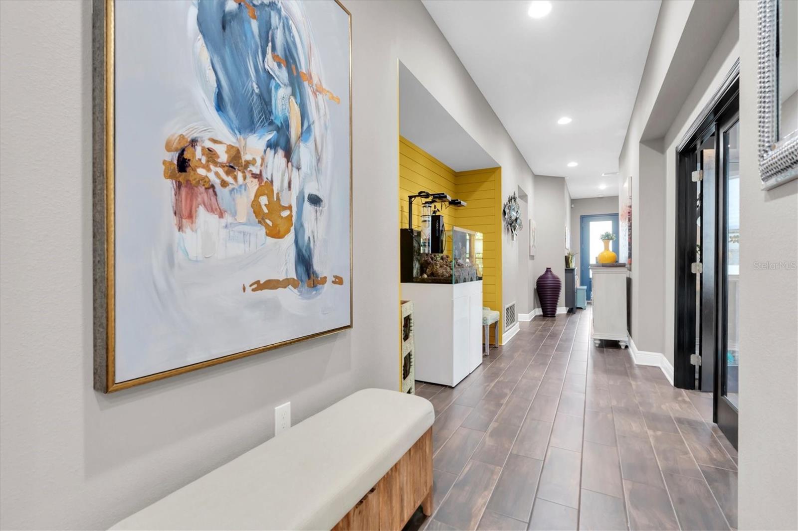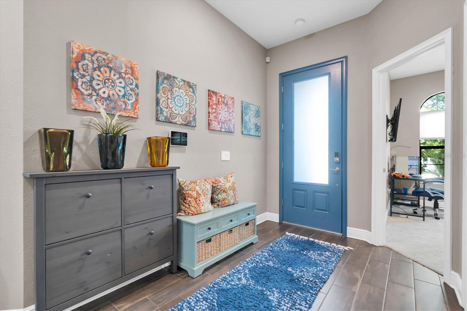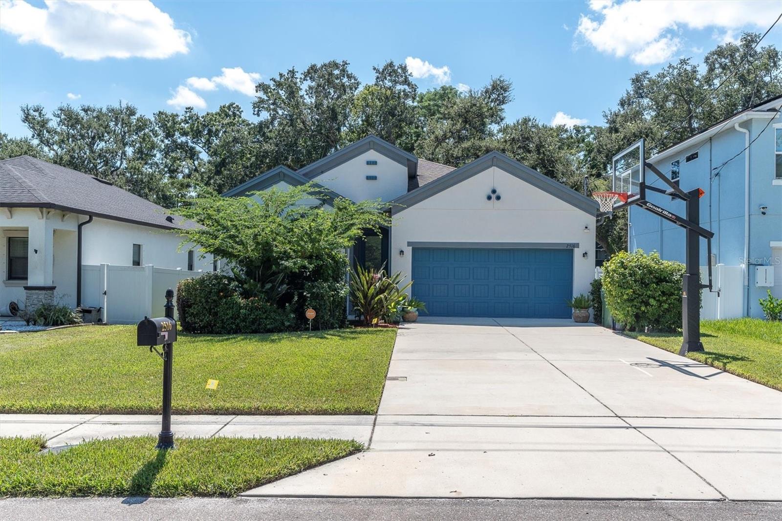 This 2019-built Tampa home perfectly blends modern comfort, designer style, and everyday freedom on a spacious quarter-acre lot with no HOA and no CDD. Freshly painted inside and out, it features high ceilings, wood-look tile floors, and thoughtful custom touches throughout. The front flex room with French doors offers the perfect space for a home office, playroom, or media room. At the heart of the home, the bright gourmet kitchen stands out with a bold shiplap island, new backsplash, granite countertops, stainless steel appliances, upgraded cabinets with crown molding, a glass pantry door, and a walk-in pantry. A cozy breakfast nook opens to the great room, where sliding doors lead to a covered lanai and fully fenced backyard—ideal for relaxing or entertaining. The owner’s suite features a tray ceiling, large walk-in closet, and a spa-like bath with dual vanities, frameless glass shower, and soaking tub. Two additional bedrooms offer flexibility for family, guests, or hobbies. Located in a no flood and no evacuation zone, this move-in ready home delivers a rare mix of modern design, low maintenance, and convenience just minutes from Tampa’s best shopping, dining, and major highways.
