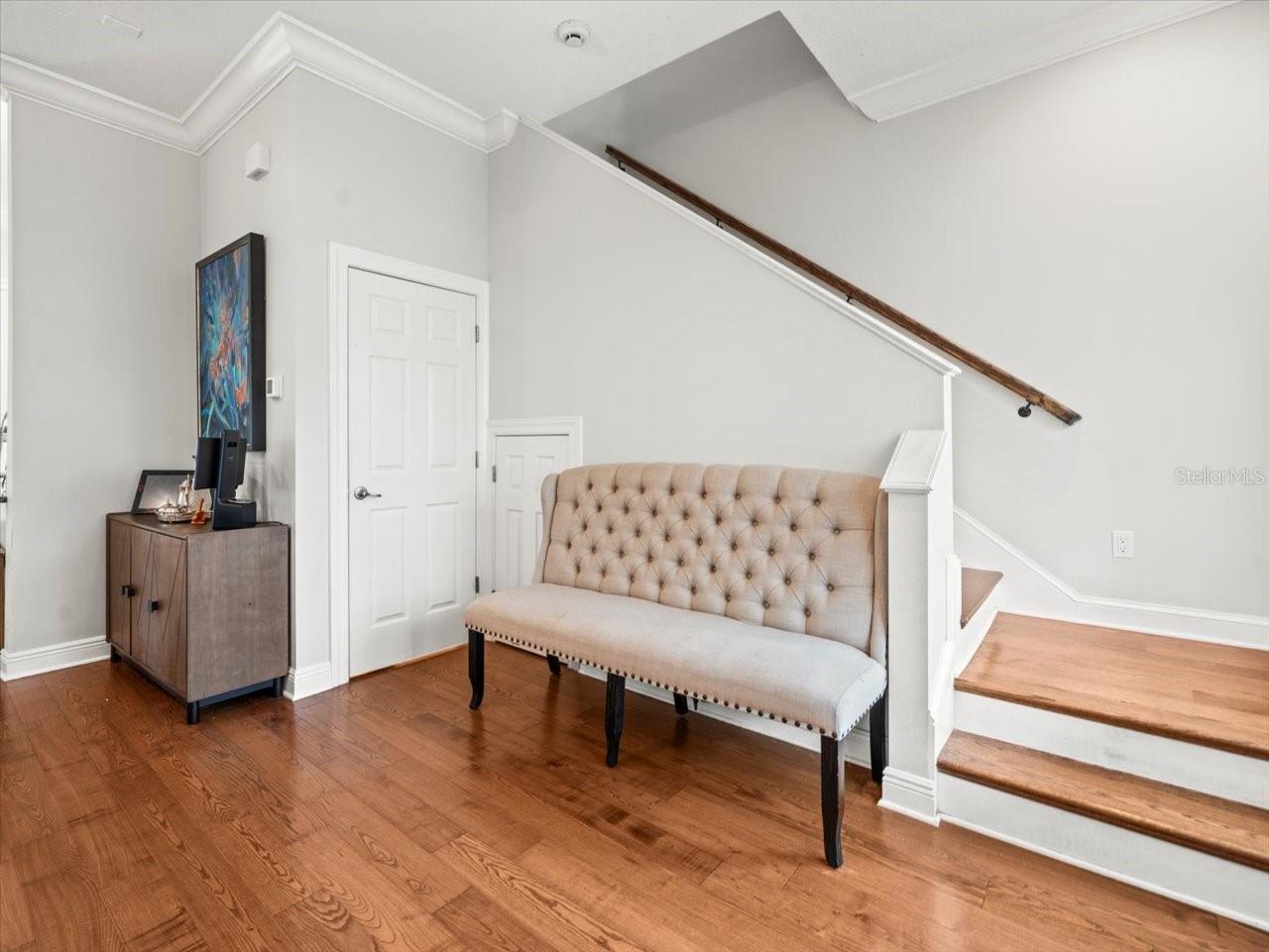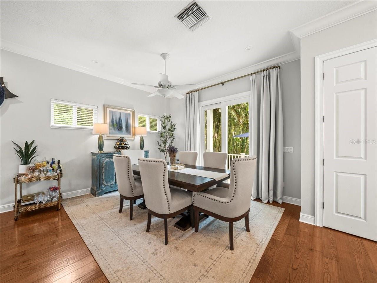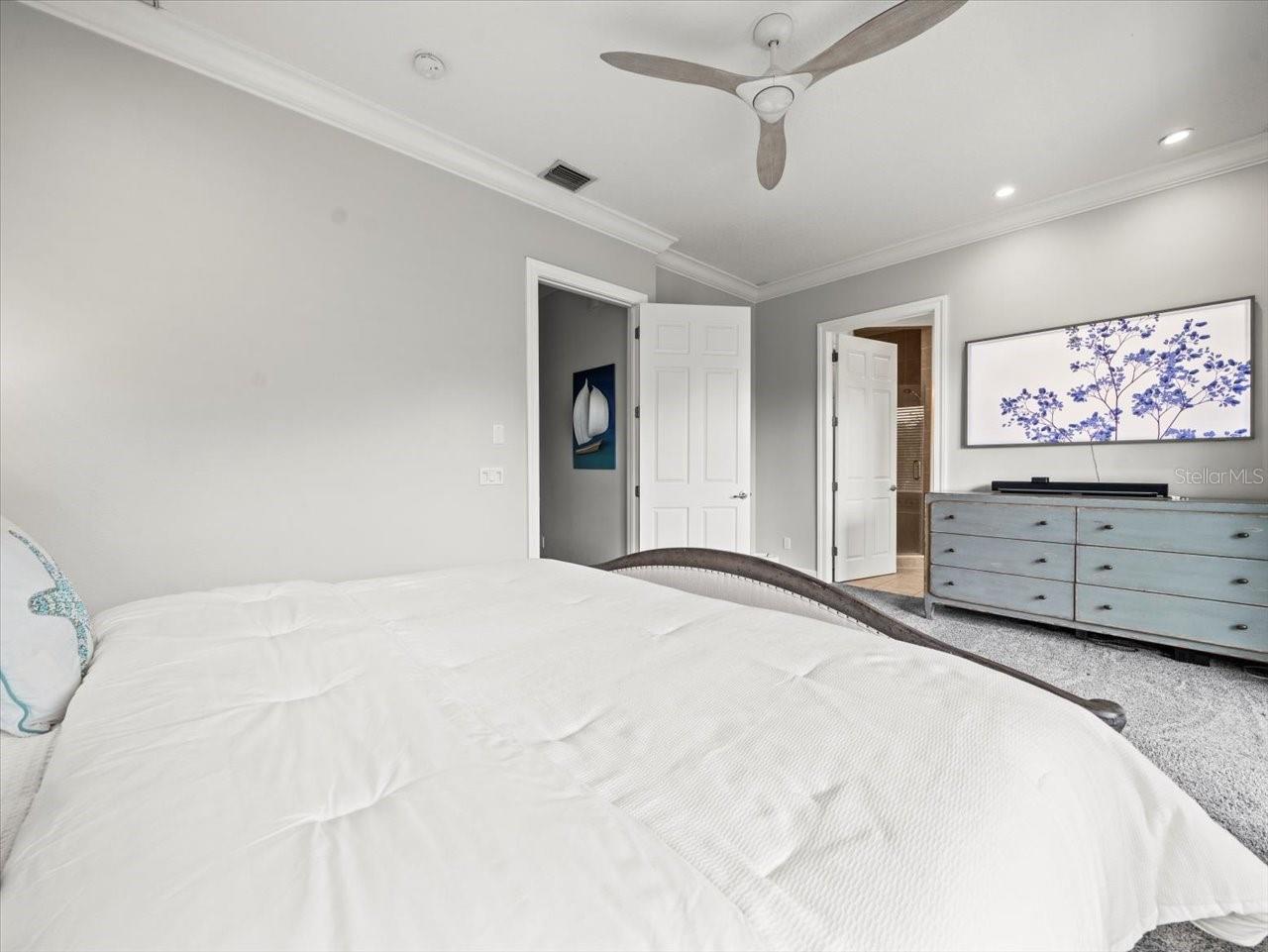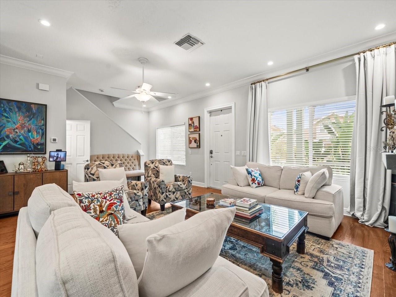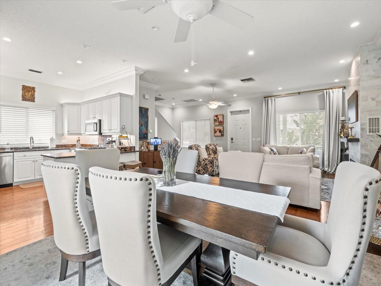 Ceiling Fans(s), Crown Molding, High Ceilings, L Dining, Open Floorplan, PrimaryBedroom Upstairs, Solid Surface Counters, Solid Wood Cabinets, Thermostat, Walk-In Closet(s), Window Treatments