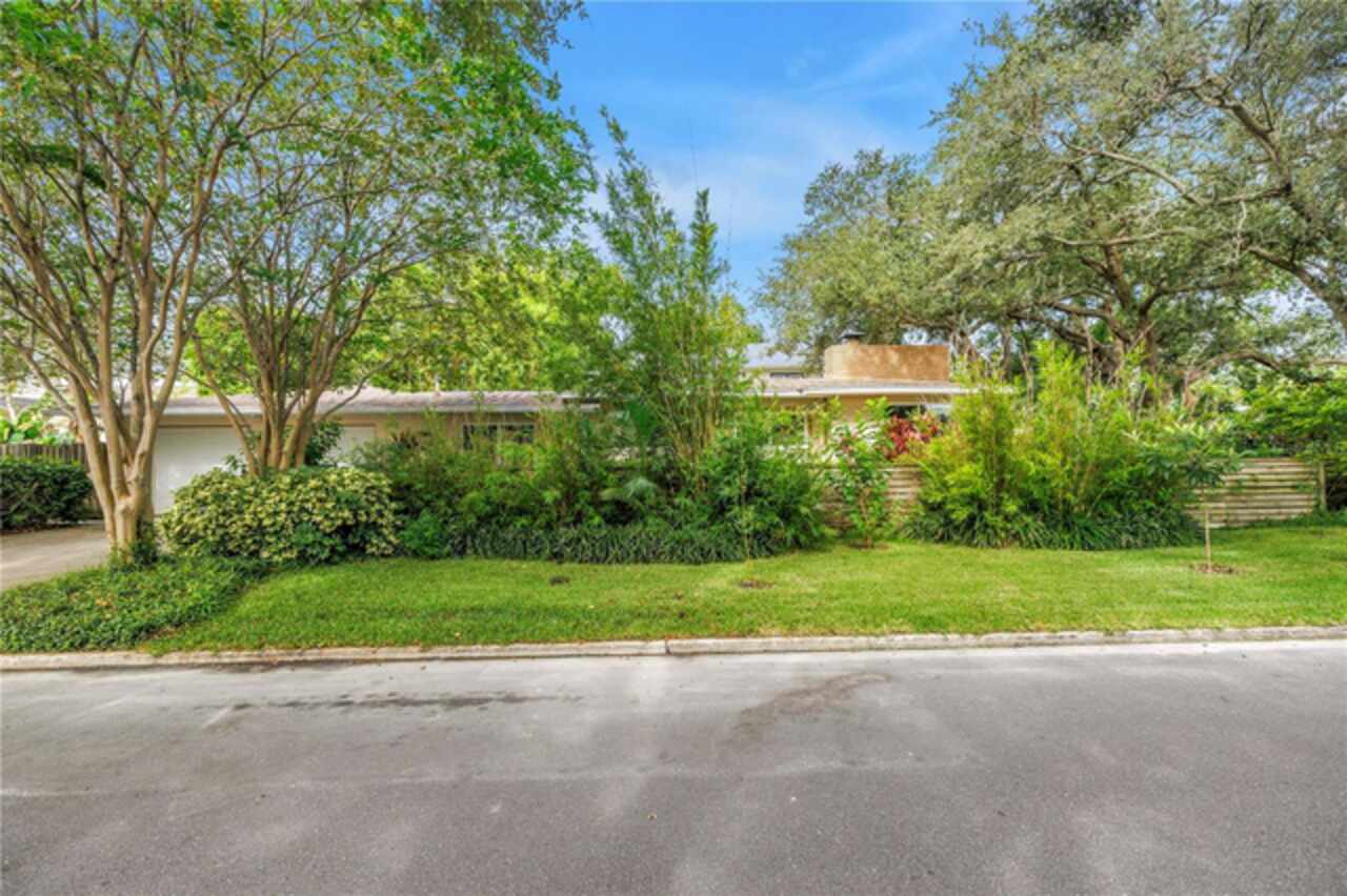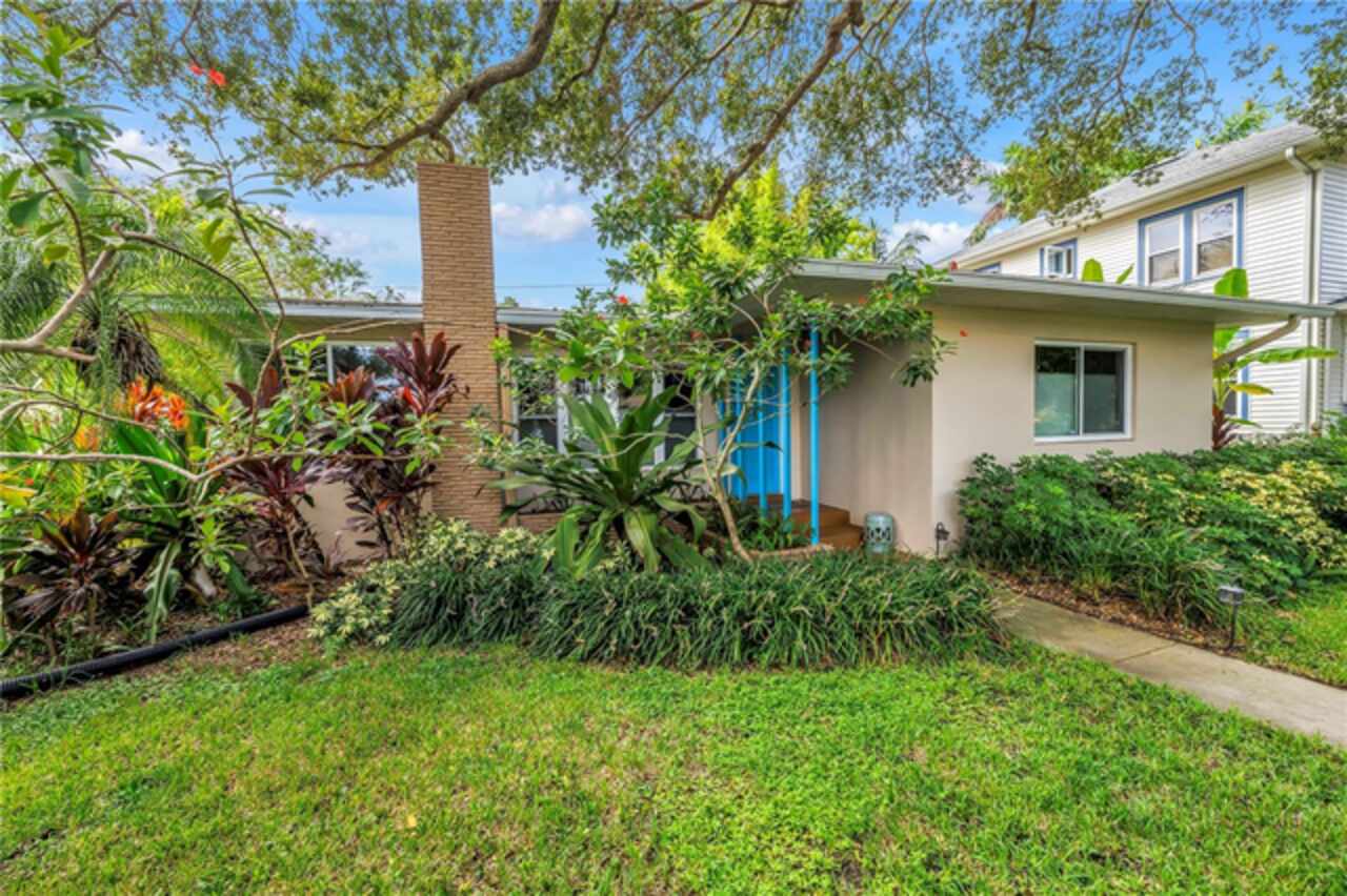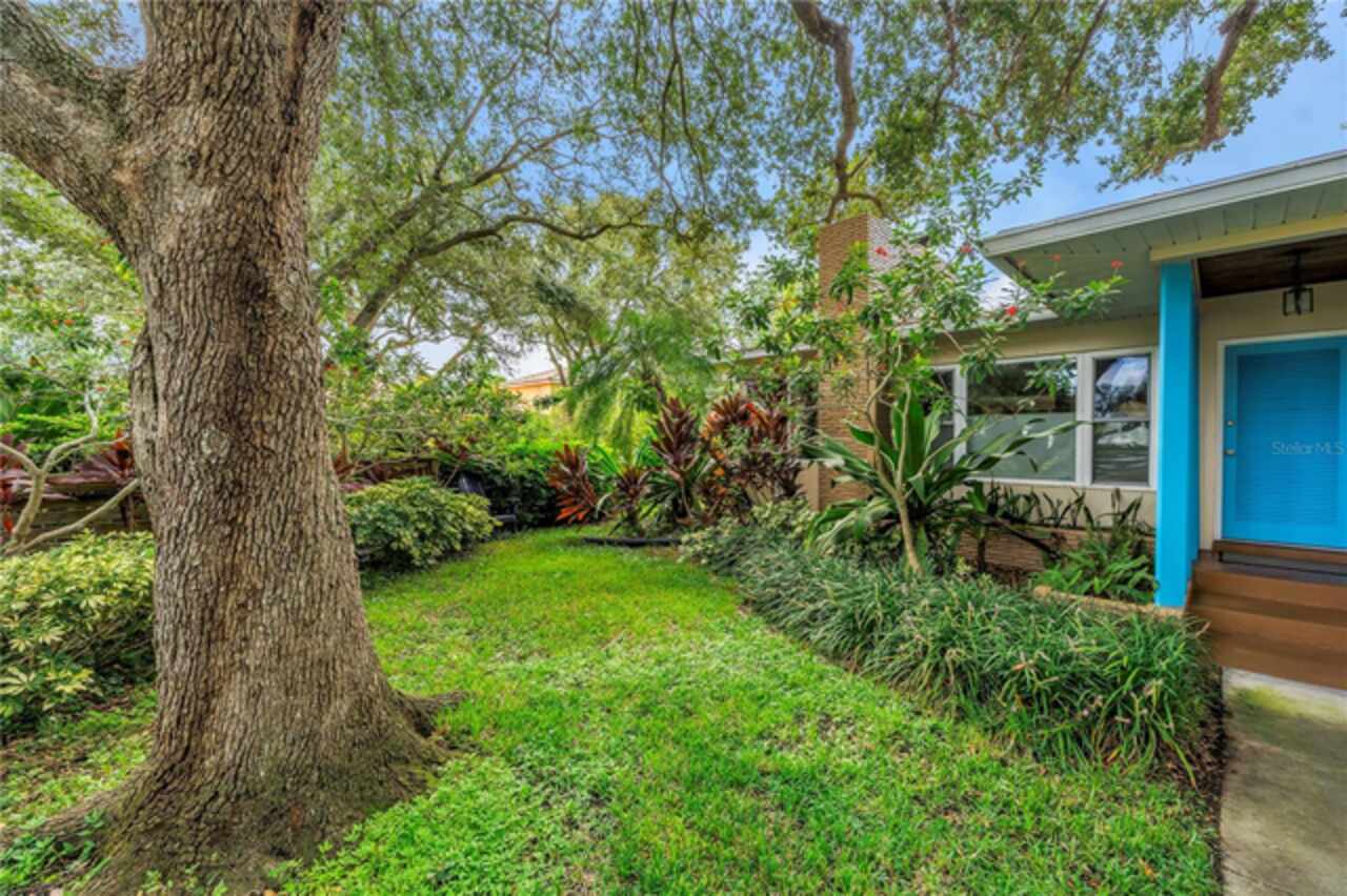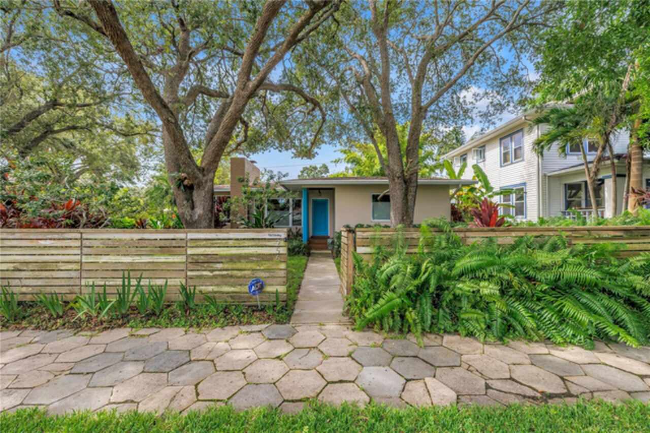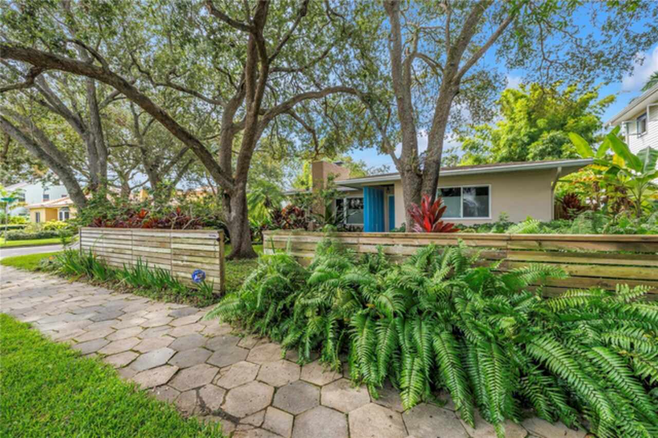 Under contract-accepting backup offers. This Historic Old Northeast treasure balances timeless charm with modern comfort. Nestled on a picturesque, oak-shaded corner lot, this thoughtfully maintained single-story mid-century home offers 1, 519 sq. ft. of stylish living in one of St. Petersburg’s most iconic neighborhoods. Inside, sunlight streams through oversized picture windows, illuminating gleaming oak hardwood floors and a classic wood-burning fireplace, already plumbed for gas. The open layout connects living, dining, and kitchen spaces, creating a seamless flow for both everyday living and effortless entertaining. The updated kitchen is a showpiece, featuring Carrara marble countertops, custom cherry cabinetry, glass tile backsplash, a modern hood, and soft-close drawers. A dining bar and adjacent dining room with French doors open to the back patio, elevating meals from casual coffee to lively dinner parties. Need flexibility? The enclosed sun porch, bathed in natural light, adapts as an office, reading nook, or wellness retreat. The spacious primary suite boasts a sleek ensuite bath with a floating vanity, frameless glass shower, and modern porcelain tile. The hall bath blends vintage 1950s charm with thoughtful updates, while two additional bedrooms provide comfort and privacy for guests or family. Outdoors, a private travertine patio sets the stage for al fresco living, ideal for grilling, gatherings, or unwinding with a glass of wine. Mature landscaping, supported by a deep-well irrigation system, offers beauty with low maintenance, and the oversized lot provides room to add a pool. The rare two-car garage is a standout, with storage, laundry, a workbench, perfect for future poolside access or creative projects . Half bath in garage could be converted into a cabana bath. All of this, just a short walk from the waterfront, Beach Drive, the Pier, and downtown’s vibrant arts and dining scene, while enjoying the peace of mind of a NON-FLOOD ZONE (X).