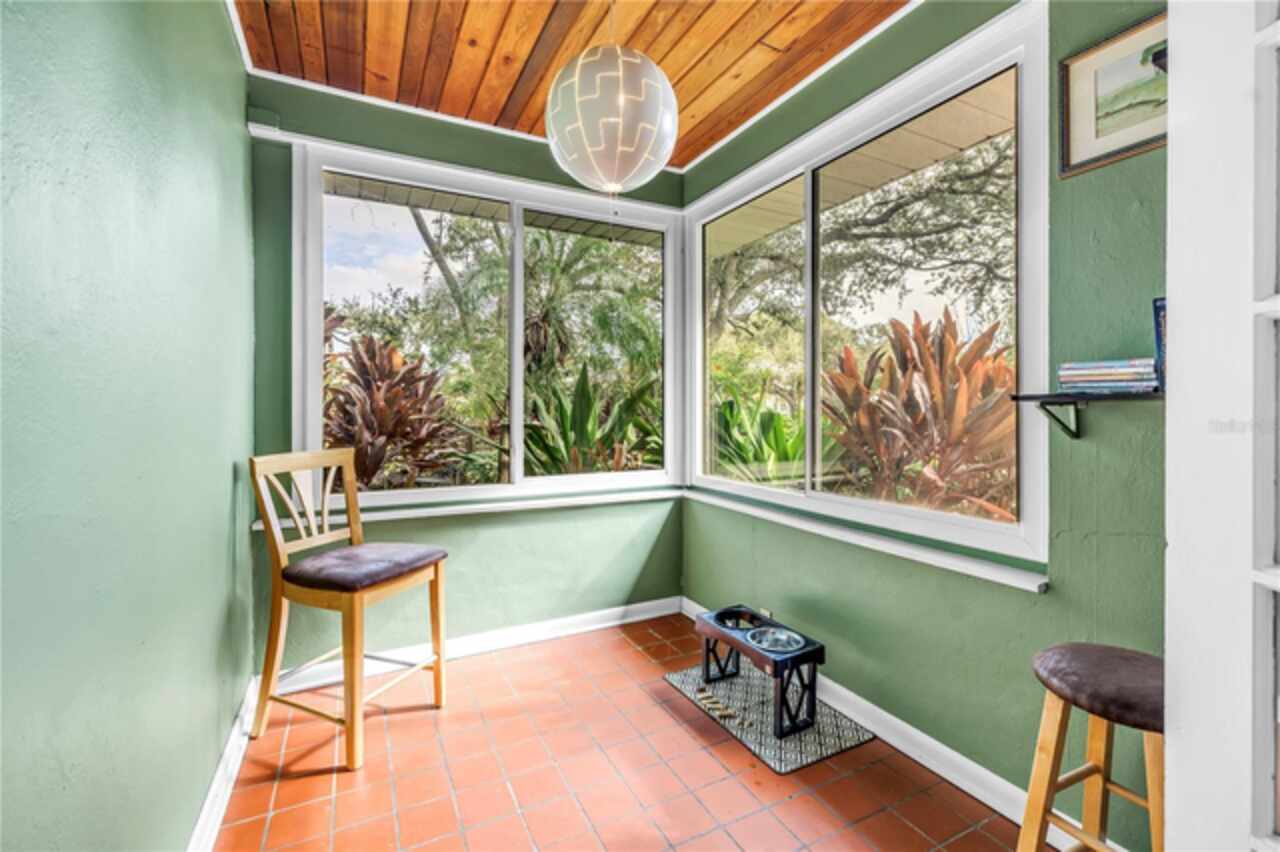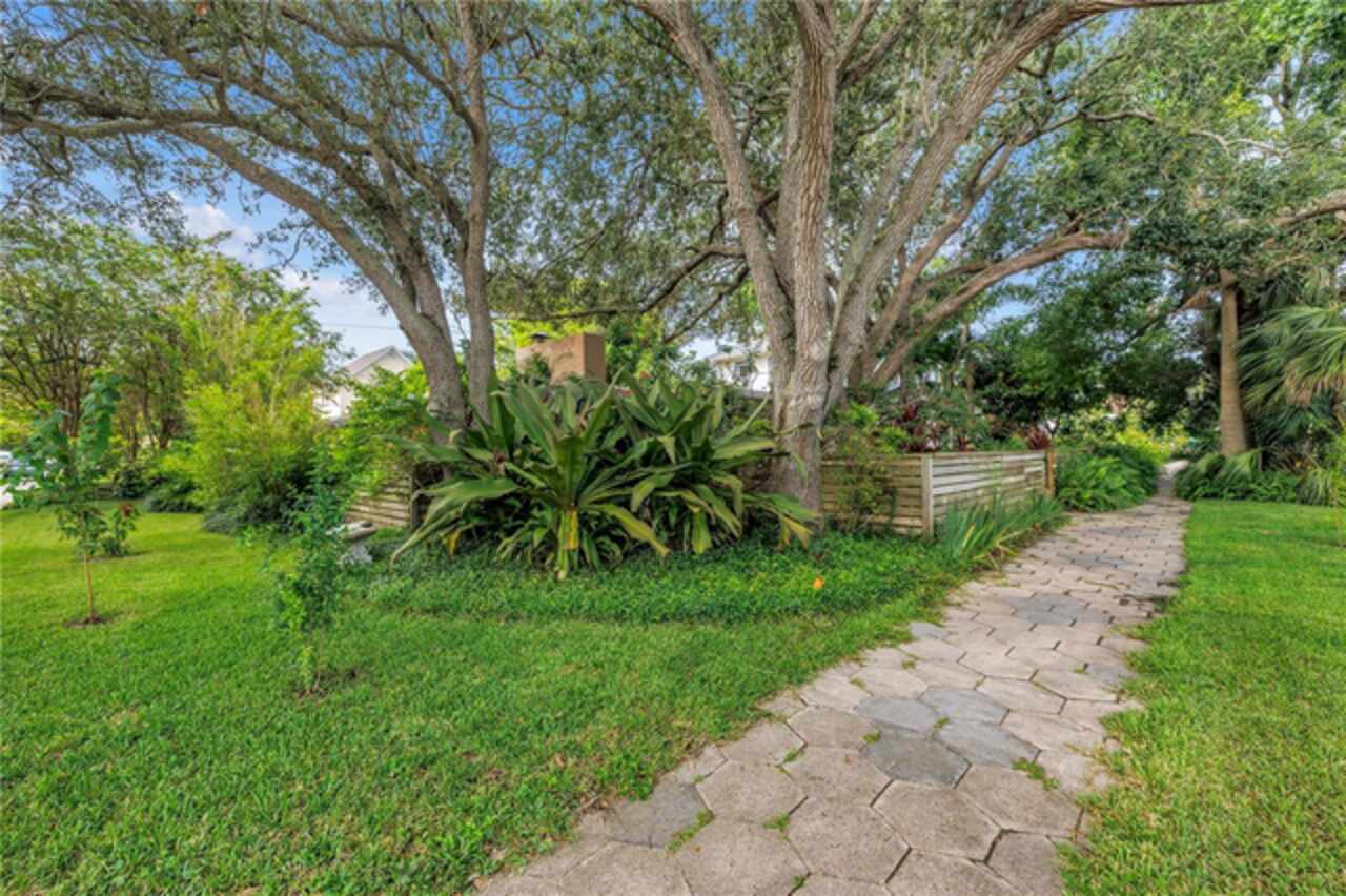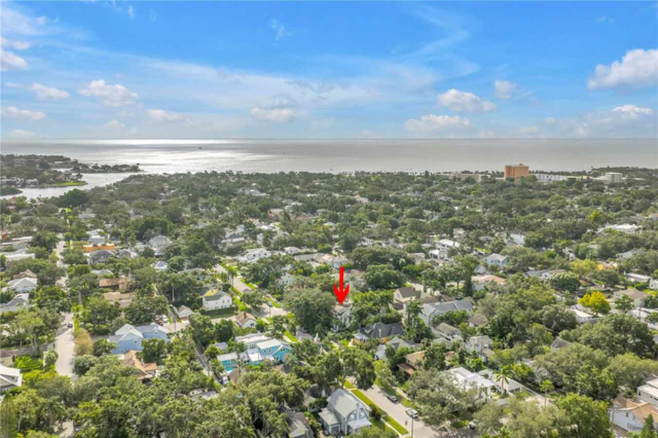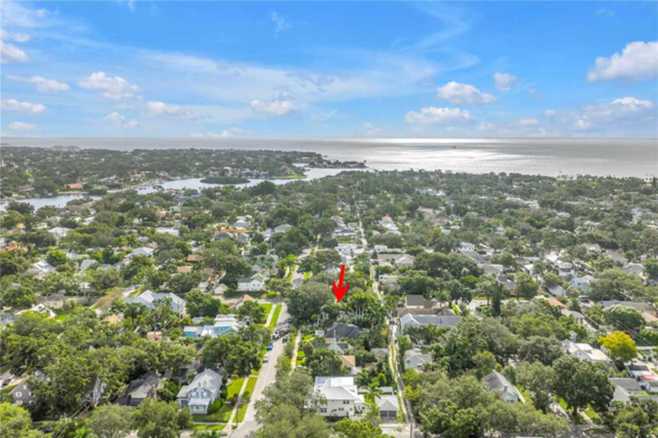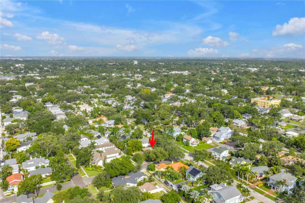 Under contract-accepting backup offers. This Historic Old Northeast treasure balances timeless charm with modern comfort. Nestled on a picturesque, oak-shaded corner lot, this thoughtfully maintained single-story mid-century home offers 1, 519 sq. ft. of stylish living in one of St. Petersburg’s most iconic neighborhoods. Inside, sunlight streams through oversized picture windows, illuminating gleaming oak hardwood floors and a classic wood-burning fireplace, already plumbed for gas. The open layout connects living, dining, and kitchen spaces, creating a seamless flow for both everyday living and effortless entertaining. The updated kitchen is a showpiece, featuring Carrara marble countertops, custom cherry cabinetry, glass tile backsplash, a modern hood, and soft-close drawers. A dining bar and adjacent dining room with French doors open to the back patio, elevating meals from casual coffee to lively dinner parties. Need flexibility? The enclosed sun porch, bathed in natural light, adapts as an office, reading nook, or wellness retreat. The spacious primary suite boasts a sleek ensuite bath with a floating vanity, frameless glass shower, and modern porcelain tile. The hall bath blends vintage 1950s charm with thoughtful updates, while two additional bedrooms provide comfort and privacy for guests or family. Outdoors, a private travertine patio sets the stage for al fresco living, ideal for grilling, gatherings, or unwinding with a glass of wine. Mature landscaping, supported by a deep-well irrigation system, offers beauty with low maintenance, and the oversized lot provides room to add a pool. The rare two-car garage is a standout, with storage, laundry, a workbench, perfect for future poolside access or creative projects . Half bath in garage could be converted into a cabana bath. All of this, just a short walk from the waterfront, Beach Drive, the Pier, and downtown’s vibrant arts and dining scene, while enjoying the peace of mind of a NON-FLOOD ZONE (X).