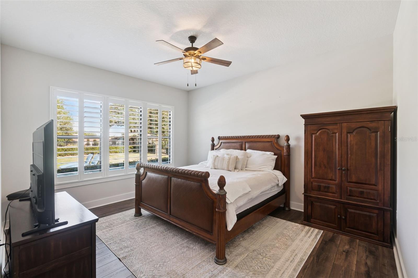 Welcome to 25861 Crossings Bluff, an exceptional estate built in 2019 by Vintage Estate Homes and perfectly positioned on a premier tree-lined street within the coveted gated and golf course community of RedTail. From the moment you arrive, this home sets itself apart with its architectural design, stone-accented elevation, mature oak trees, expansive paver driveway, and an oversized three-car garage. The property sits at over half an acre, fully fenced, and features a custom pool and large deck. The best part is the panoramic golf course views! Step through the front door to a beautifully tiled foyer, where the formal dining room sits to your right and a spacious dedicated office is to your left. Into the great room, floor-to-ceiling windows immediately draw your eye outside, showcasing the pool, the yard, and golf views. The living room features soaring 14-foot ceilings with wood beam accents and a stunning floor-to-ceiling gas fireplace. The fireplace is an impressive focal point, and anchors the entire space. The gourmet kitchen is open to the living area and designed with a large island for entertaining. The kitchen also features a cooktop, double ovens, a coffee bar, a cabinet-finished refrigerator, and a large walk-in pantry. The breakfast nook leads to French doors that open to the covered paver lanai. The homes boasts over 3, 300 square feet of single-story living and features a functional split floorplan. The expansive primary suite is tucked away for privacy and features an oversized walk-in closet and an ensuite with split vanities, quartz countertops, a frameless glass shower, and a freestanding soaking tub. A spacious bonus/media room, two additional bedrooms, two full baths and a dedicated laundry room are located on the opposite wing of the home. The bonus room can be used as a fourth dedicated bedroom. The golf cart is INCLUDED in the sale! Living in RedTail means enjoying estate-style homes, mature landscaping, and a lifestyle centered around recreation and convenience. Community amenities include a golf course, clubhouse, fitness center, pool, and clay tennis courts. Ideally located between Mount Dora and the Orlando/Sanford area, Sorrento provides quick access to Lake Mary, the 429, the Wekiva Parkway, The City of Orlando, Disney, and the Orlando International Airport. This one-of-a-kind home offers high level finishes, space, privacy, and breathtaking views in a location that cannot be beat. Call today to schedule your private tour.