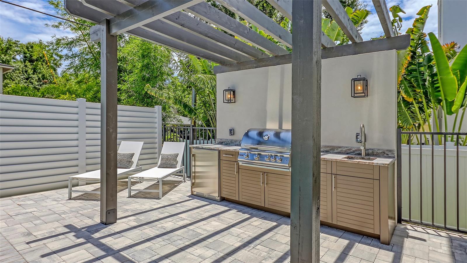 Lighting, Outdoor Grill, Outdoor Kitchen, Rain Gutters, Shade Shutter(s), Sidewalk, Sliding Doors
