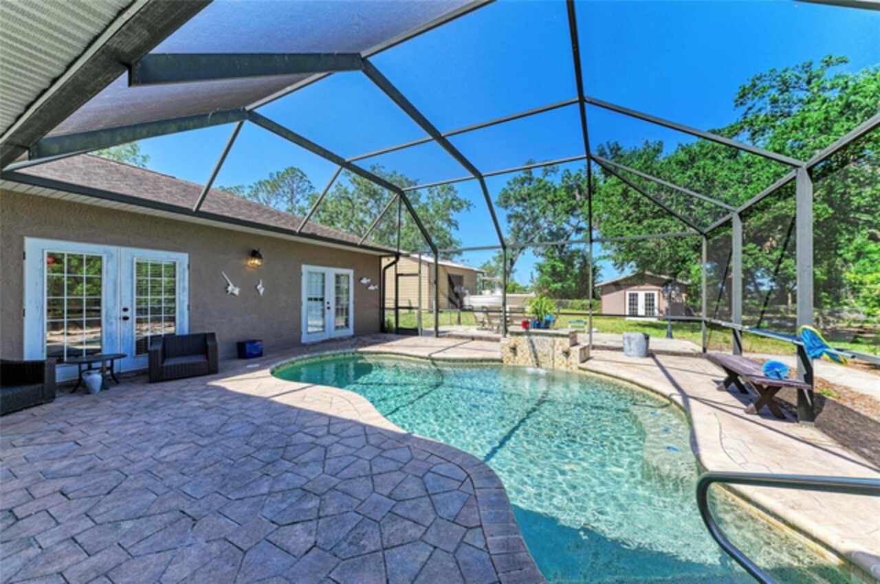 Priced UNDER appraisal value!! This SADDLEHORN ESTATES pool home may be just what you're looking for! With no HOA, no CDD, and no deed restrictions you can raise your chickens in your backyard if you'd like. This house has great bones. It has 3 bedrooms and 2 bathrooms, plus a huge bonus room for entertaining family or friends. Cook all your meals in this kitchen that was recently updated with newer granite countertops and all stainless steel appliances. There's also a breakfast bar and separate formal dining room with a gas fireplace. Then, enjoy a nice dip in the inground caged pool on the back lanai. On the entirely fenced property, you'll find a shed for all your lawn equipment and a separate 36' X 30' metal building that can be used for workshopping or extra storage. It's close enough to town for shopping and restaurants, but far enough in the country for a breath of fresh air. This property had no flooding during/after the hurricanes of 2024. Seller is offering 15k credit towards buyers' closing costs, rate buydown, or towards repairs. Home warranty for the 1st year for added peace of mind.