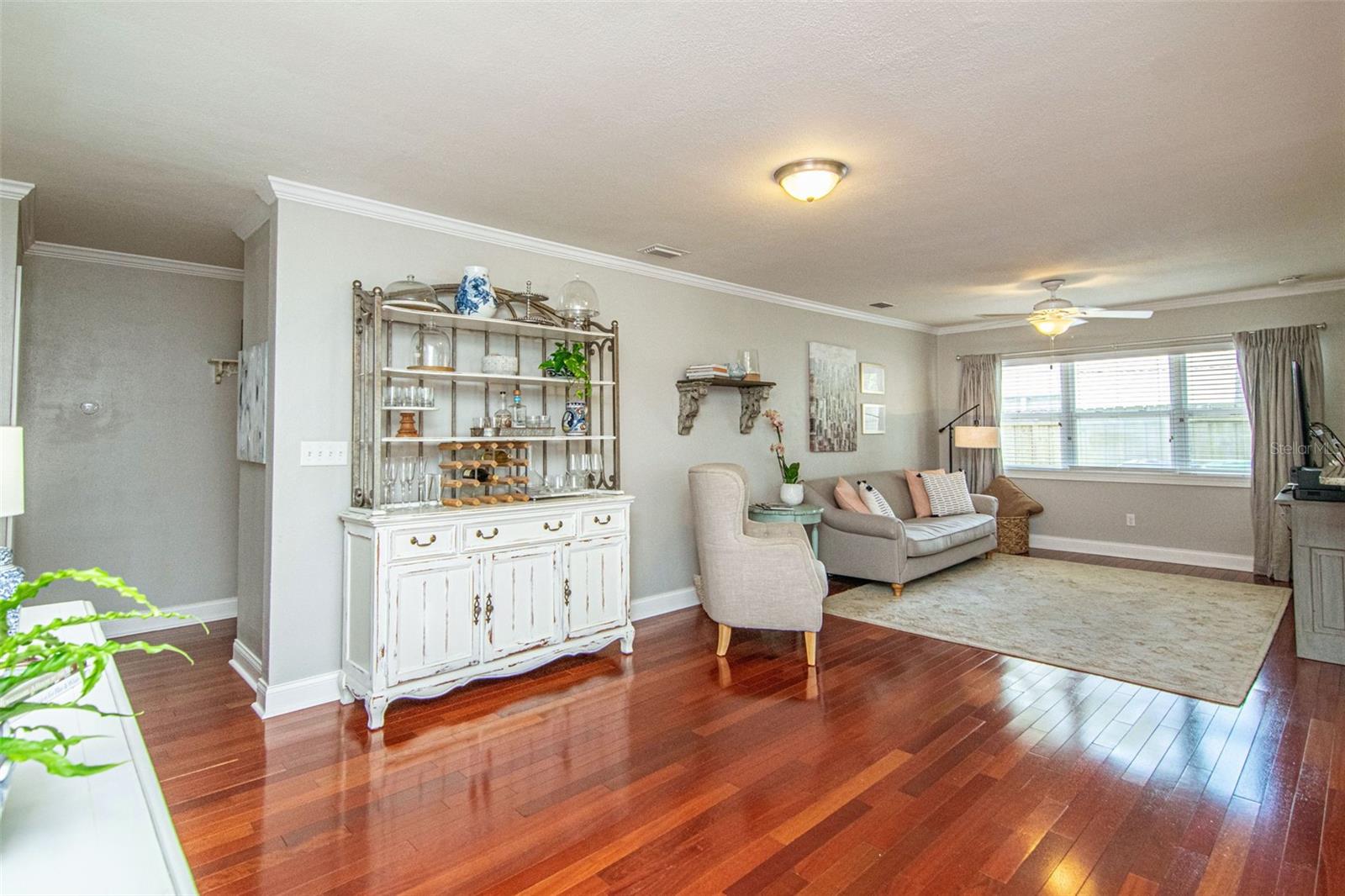 Ceiling Fans(s), Crown Molding, Open Floorplan, Primary Bedroom Main Floor, Solid Wood Cabinets, Thermostat