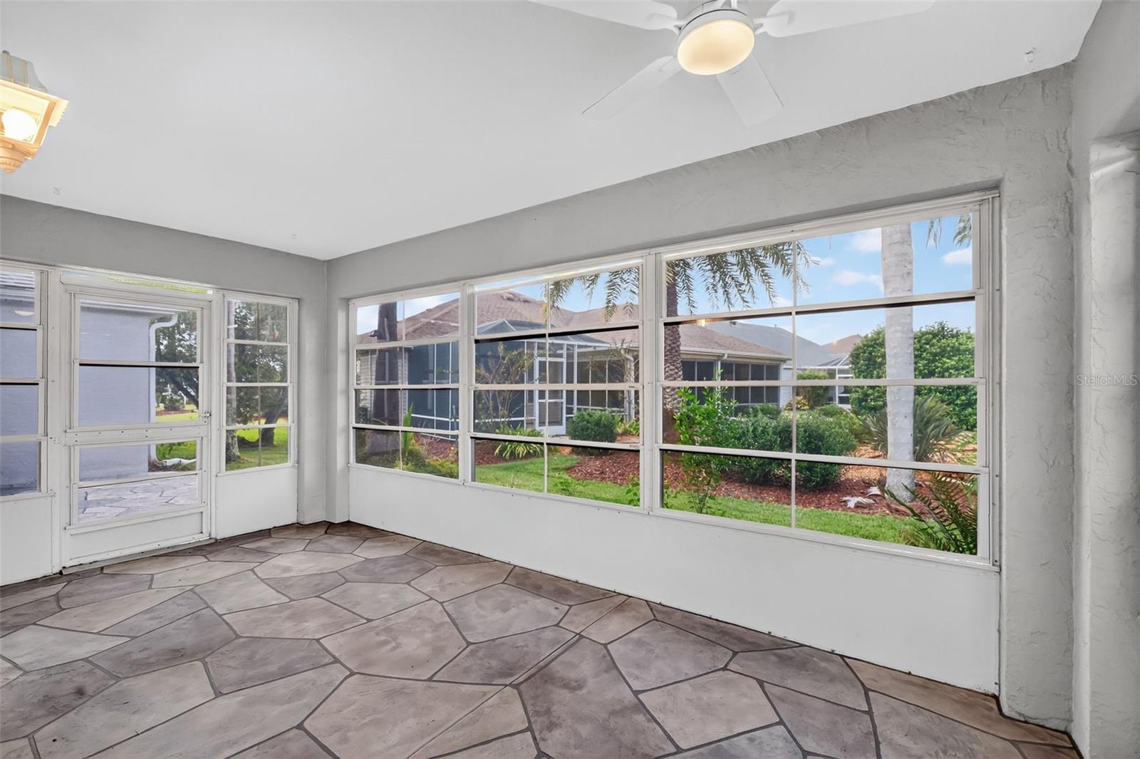 One or more photo(s) has been virtually staged. FANTASTIC 3/2 Cancun (Oleander) with ENCLOSED LANAI and REAR PATIO nestled in the highly desirable Village of Santiago! BOND PAID! CUSTOM PAINTED drive and walk ways; LUSH, TROPICAL landscaping; and an ARCHED front entry with DOUBLE side lites and half-round TRANSOM window welcome you in to the well-lit, GENEROUS foyer of this AMAZING home boasting a CONVENIENT ENTRY CLOSET! From the foyer, step into the IMPRESSIVE living room with its soaring VAULTED ceilings and FABULOUS Palladian window that floods the space with NATURAL LIGHT while serving as an architectural focal point. Adding to the beauty of the home is LUXURY VINYL PLANK flooring that can be found THROUGHOUT, offering both elegance and easy maintenance. Just off of the living room, you will find the FORMAL dining room boasting OPULENT columns, TRAY ceiling, pass-thru window to the kitchen, and a GORGEOUS antique crystal chandelier. There are also, DOUBLE French doors that lead to an ENCLOSED LANAI with an adjoining REAR PATIO. Both of theses areas showcase beautifully painted decorative floors and create the IDEAL SPACE for hosting gatherings or simply relaxing with friends and family! Back inside, the inviting kitchen boasts RICH WOOD cabinetry with PULLOUTS, TILED backsplash, STAINLESS appliances, GAS cooking, PANTRY closet, a LARGE CENTER ISLAND, and an adjacent DINETTE for casual dining. Two additional bedrooms and a second bathroom are CONVENIENTLY LOCATED near the front of the home, creating a PRIVATE guest wing and/or QUIET home office. Both bedrooms offer DOUBLE windows and built-in closets. Bathroom two features a STRIKING Bombay vanity, TILED tub and shower combination, and a hallway LINEN closet. The INTERIOR laundry room has additional shelving and leads to the 2-Car Garage with EPOXIED floors, sliding GARAGE SCREEN, attic access with stairs, shelving, extra refrigerator, and PLENTY of room for parking and STORAGE! DON'T MISS YOUR OPPORTUNITY to make this INCREDIBLE HOME in a GREAT LOCATION YOUR OWN! The Village of Santiago is CONVENIENTLY LOCATED between Lake Sumter Landing and Spanish Springs; close to El Santiago and Savannah Recreation Centers; The Scarlett O’Hara Theatre; Glenview Country Club; El Diablo Golf Course; The Villages Polo Club; additional recreation centers, golf, pickle ball, and swimming pools; the Villages Regional Hospital; and CR 446 and US HWY 27/441 with abundant shopping, restaurants, banks, and medical. PLEASE WATCH OUR WALKTHROUGH VIDEO of this WONDERFUL HOME, and CALL TODAY to schedule your Private Showing or Virtual Tour!