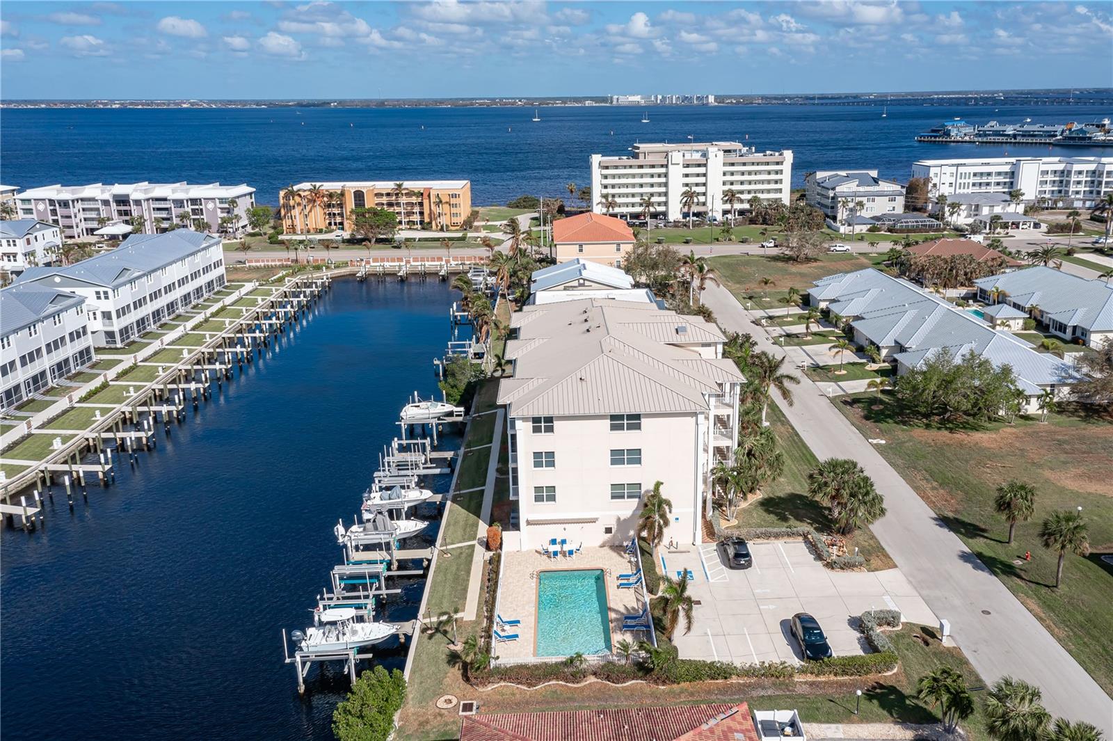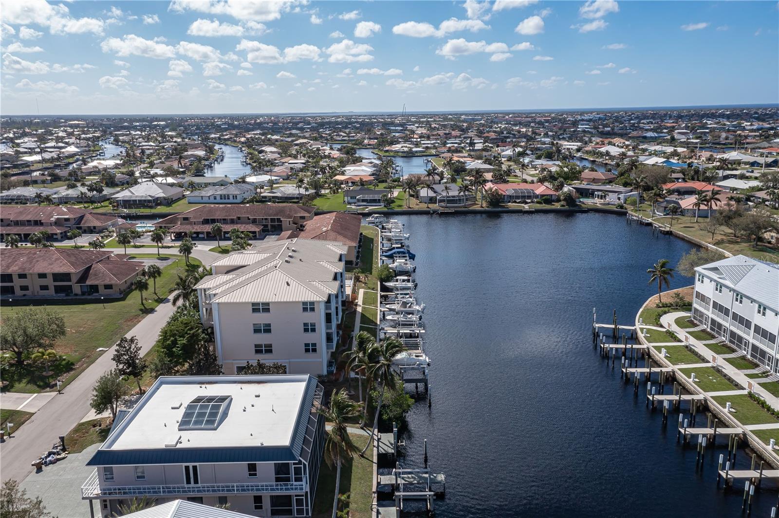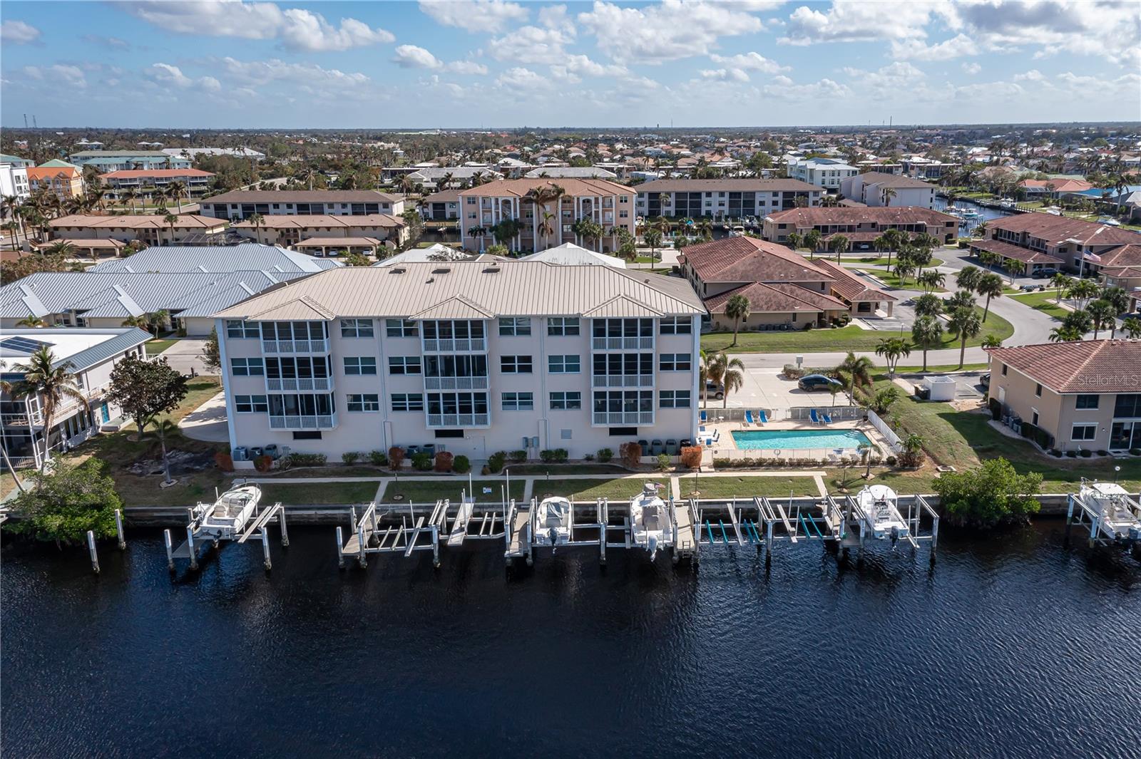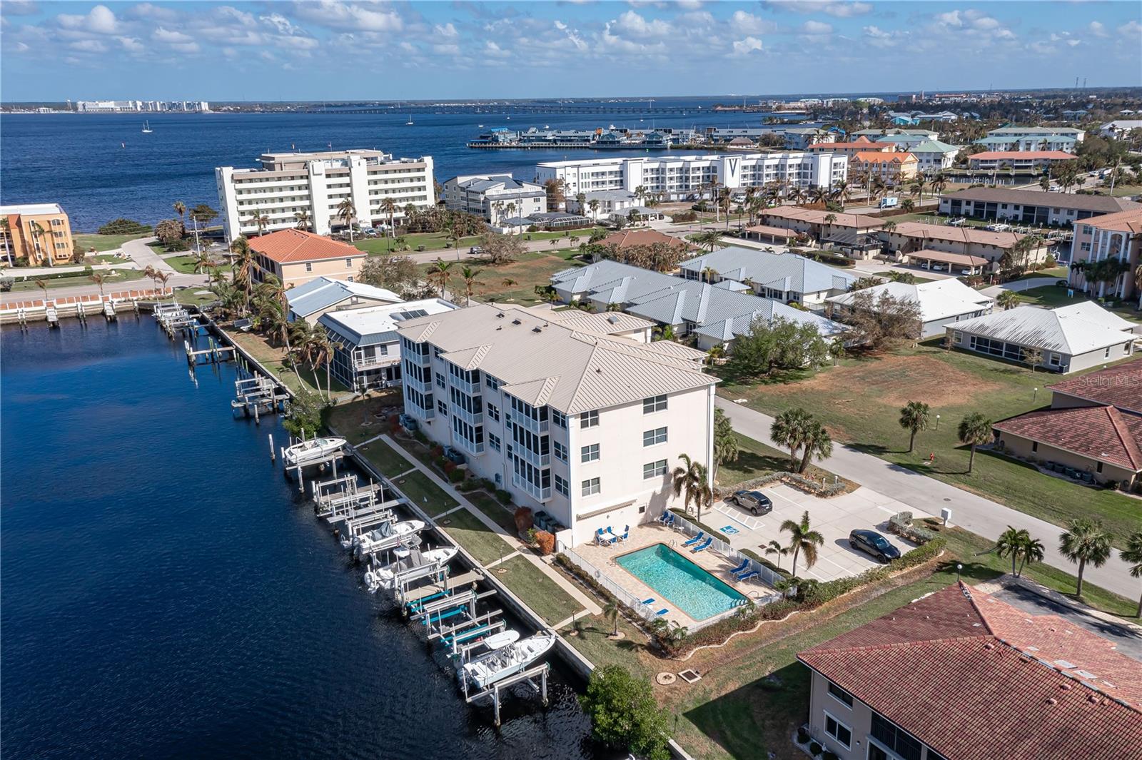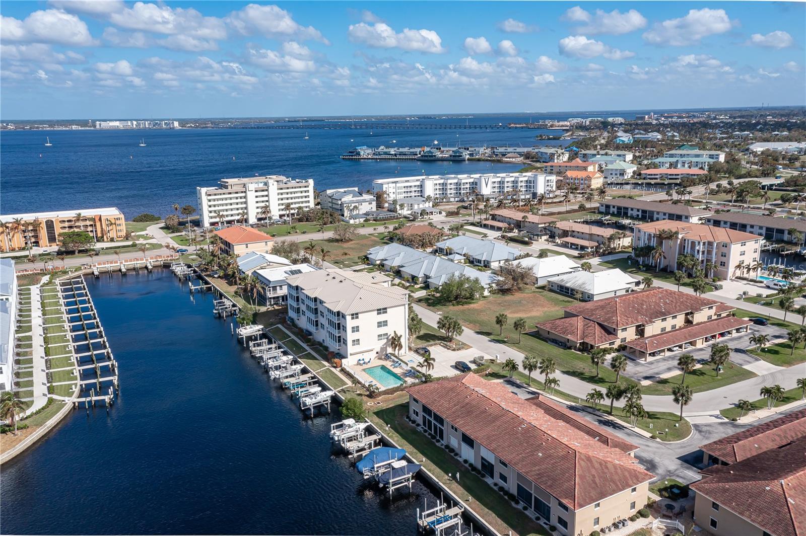 SPACIOUS WATERFRONT CONDO IN PGI W/DEEDED DOCK & QUICK BOATING ACCESS TO CHARLOTTE HARBOR! This condo at Captain's Landing in Punta Gorda Isles has it all: a great location, deeded dock, canal basin view & quick boating access to Charlotte Harbor. The unit boasts a great room layout w/over 2, 000 sq ft of living space, two large bedrooms, den w/French doors, beautiful wood floors, high ceilings, eat-in kitchen & adjacent formal dining area. Large windows & a wall of sliding glass doors provide lots of natural light. Great room opens to the screened lanai extending the living space outside. Lanai has tile flooring & built-in bar w/beverage fridge all overlooking the canal basin & docks below. Grab your favorite beverage & enjoy fabulous sunsets over the canal every night thanks to the western rear exposure. The kitchen has solid surface counters, raised-panel cabinetry + decorative display shelves at end of cabinets. The master suite has a large, picture window overlooking the canal, an oversized, walk-in closet & large master bath. Master bath has dual sinks, seated vanity & glass-block shower. The guest room also features an oversized, walk-in closet. The unit has lots of storage space in addition to the large walk-in closets, there is a linen closet in the guest bath, a coat closet in the foyer & a large storage area off the laundry room plus an assigned storage room in garage. 3rd bedroom features double French doors & can easily be converted to an office/den, if desired. Unit comes w/deeded dock #5. Dock has 10, 000 lb boat lift + water & electric hook-ups available dockside. Enjoy some of the best fishing & boating directly from your backyard. Other amenities include a heated pool & covered, under building parking. Deeded parking space #5 & storage space #5 come w/the unit. Take advantage of the fabulous location - miles of sidewalk connect you to Fishermen's Village, Isles Yacht Club, Gilchrist Park, Hounds on Henry dog park & historic downtown. Come discover why Punta Gorda is considered a hidden gem in SW Florida.