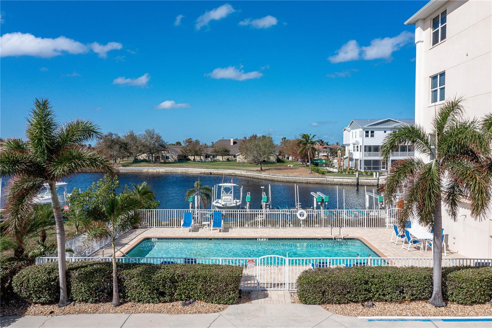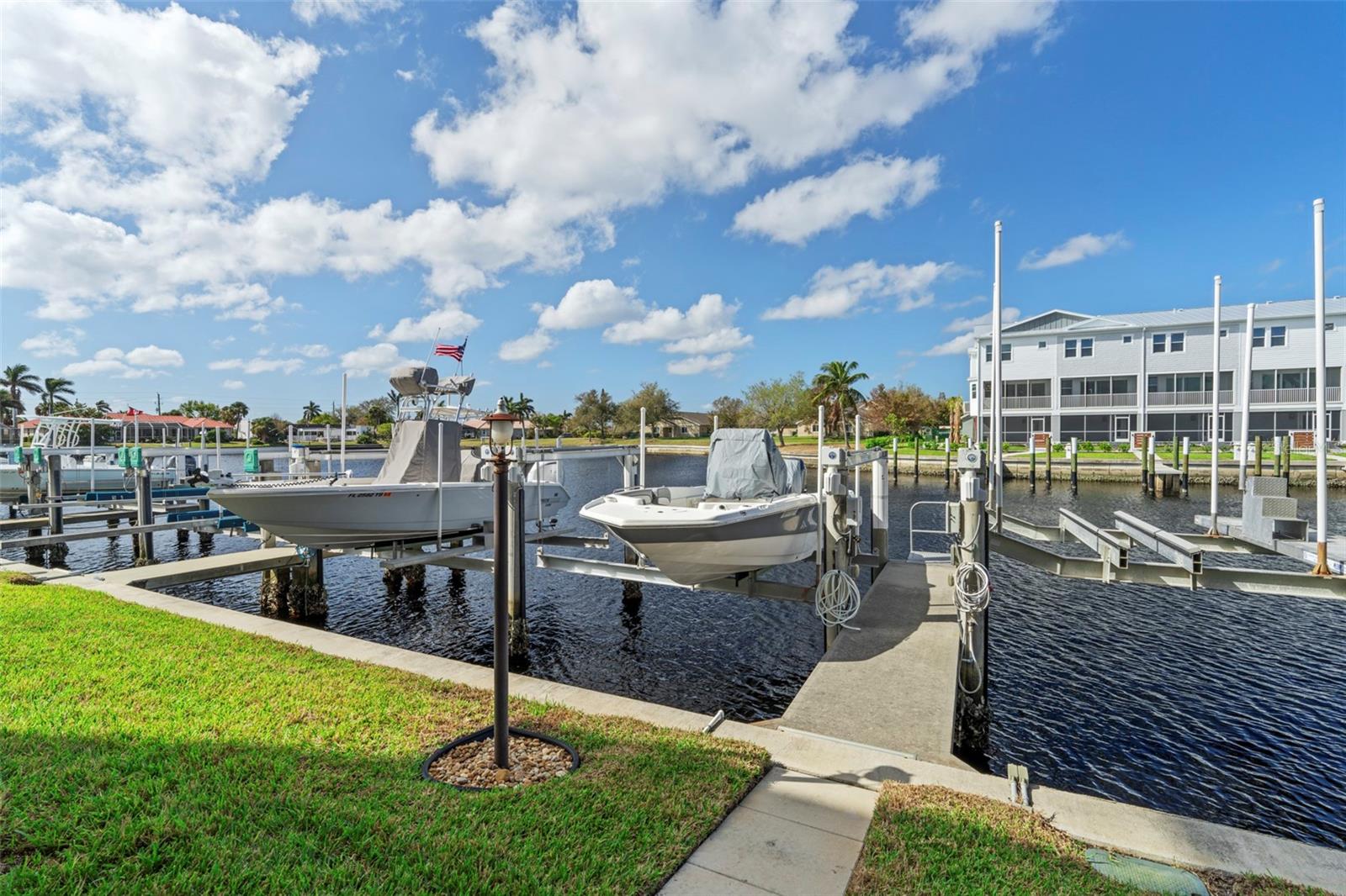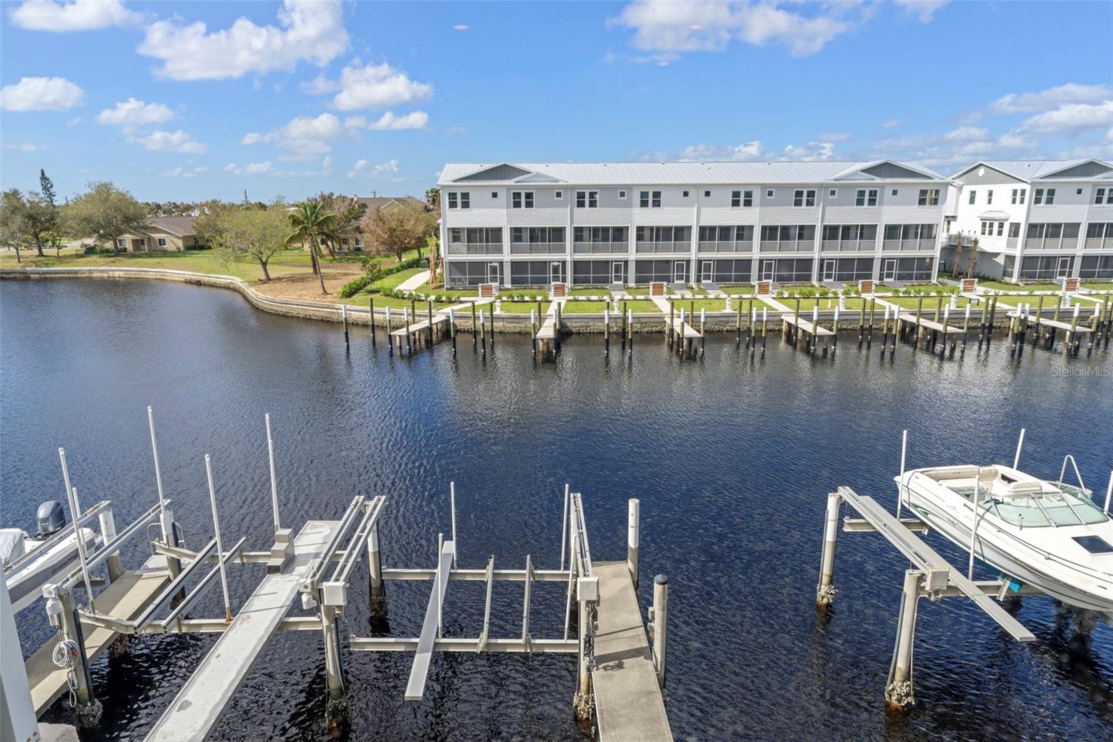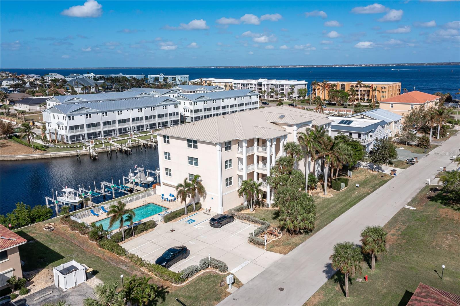 SPACIOUS WATERFRONT CONDO IN PGI W/DEEDED DOCK & QUICK BOATING ACCESS TO CHARLOTTE HARBOR! This condo at Captain's Landing in Punta Gorda Isles has it all: a great location, deeded dock, canal basin view & quick boating access to Charlotte Harbor. The unit boasts a great room layout w/over 2, 000 sq ft of living space, two large bedrooms, den w/French doors, beautiful wood floors, high ceilings, eat-in kitchen & adjacent formal dining area. Large windows & a wall of sliding glass doors provide lots of natural light. Great room opens to the screened lanai extending the living space outside. Lanai has tile flooring & built-in bar w/beverage fridge all overlooking the canal basin & docks below. Grab your favorite beverage & enjoy fabulous sunsets over the canal every night thanks to the western rear exposure. The kitchen has solid surface counters, raised-panel cabinetry + decorative display shelves at end of cabinets. The master suite has a large, picture window overlooking the canal, an oversized, walk-in closet & large master bath. Master bath has dual sinks, seated vanity & glass-block shower. The guest room also features an oversized, walk-in closet. The unit has lots of storage space in addition to the large walk-in closets, there is a linen closet in the guest bath, a coat closet in the foyer & a large storage area off the laundry room plus an assigned storage room in garage. 3rd bedroom features double French doors & can easily be converted to an office/den, if desired. Unit comes w/deeded dock #5. Dock has 10, 000 lb boat lift + water & electric hook-ups available dockside. Enjoy some of the best fishing & boating directly from your backyard. Other amenities include a heated pool & covered, under building parking. Deeded parking space #5 & storage space #5 come w/the unit. Take advantage of the fabulous location - miles of sidewalk connect you to Fishermen's Village, Isles Yacht Club, Gilchrist Park, Hounds on Henry dog park & historic downtown. Come discover why Punta Gorda is considered a hidden gem in SW Florida.