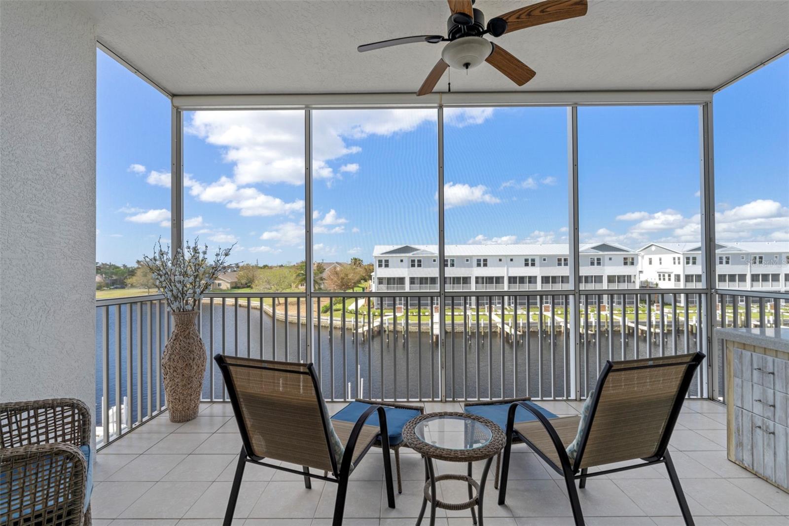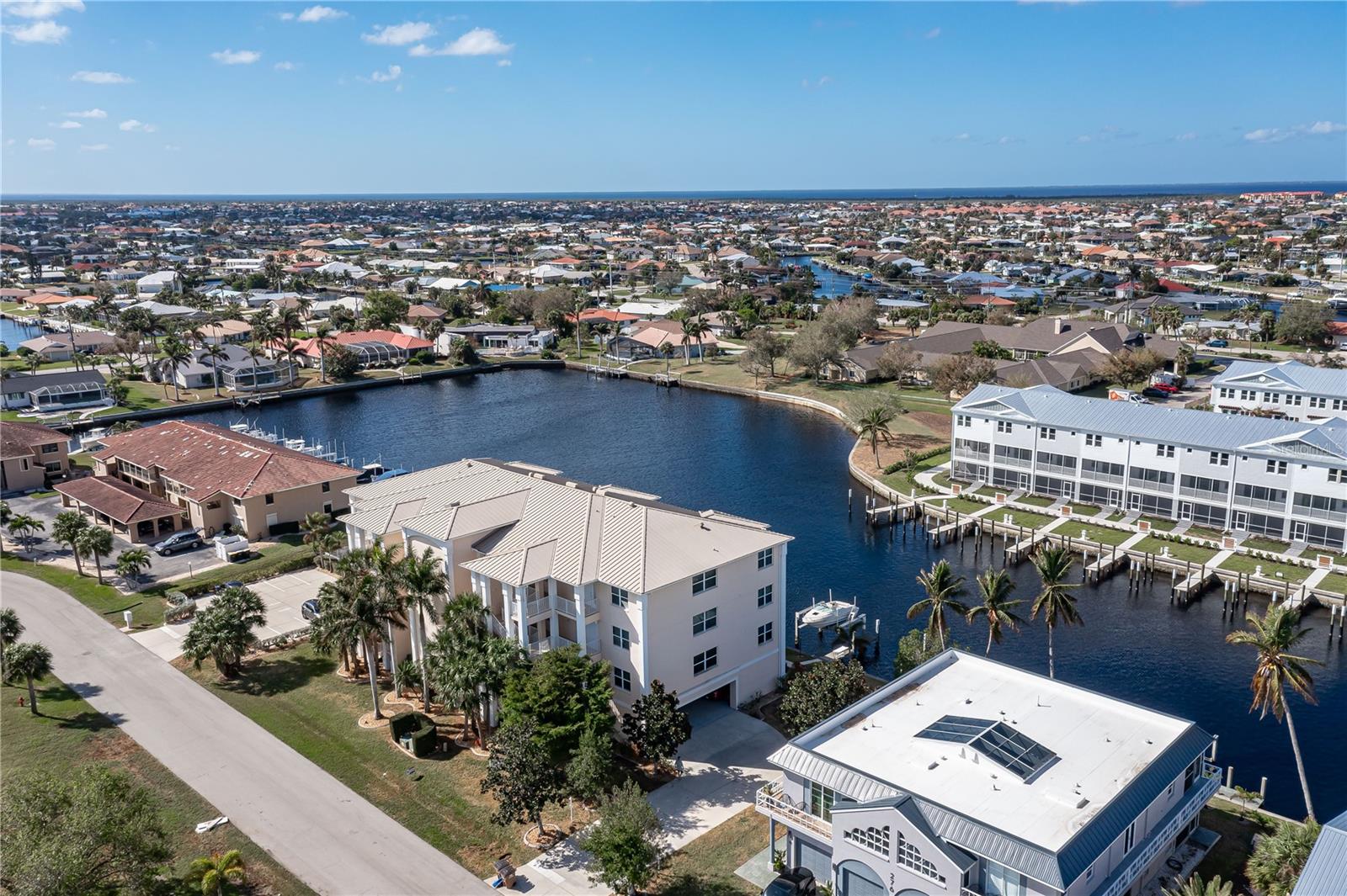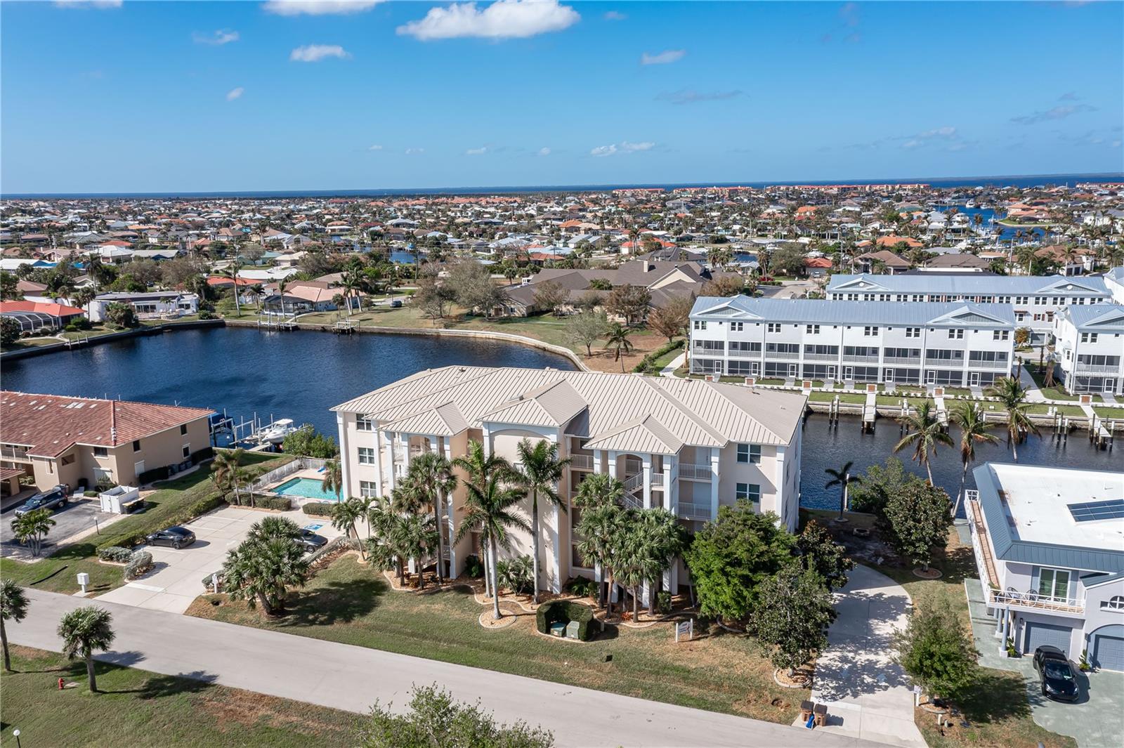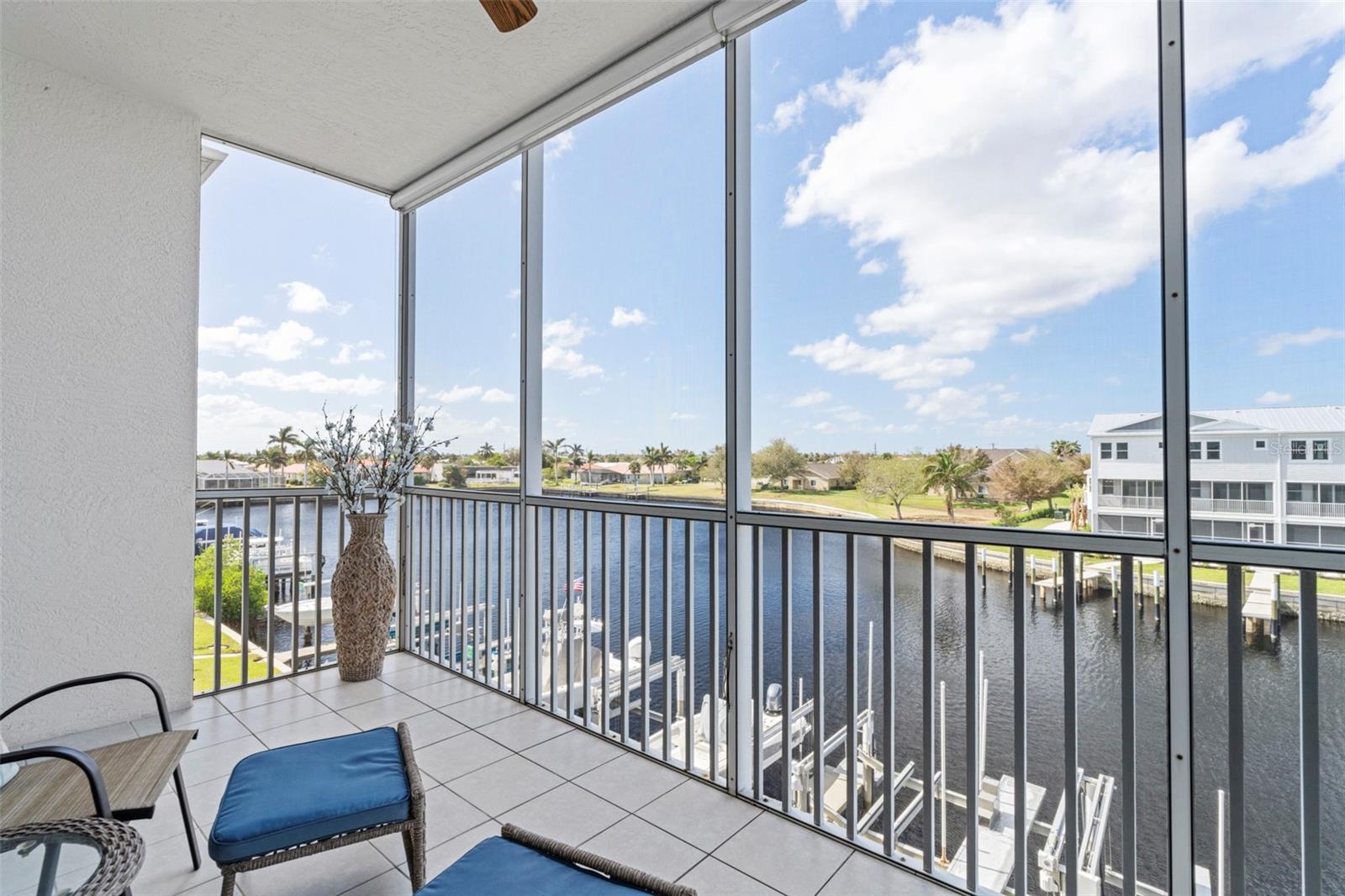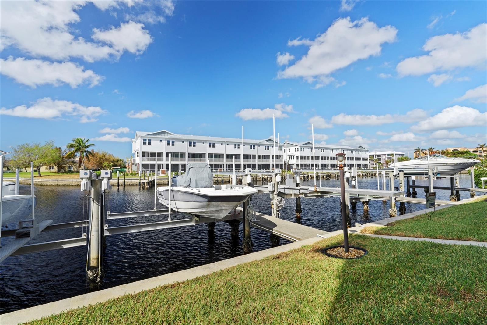 SPACIOUS WATERFRONT CONDO IN PGI W/DEEDED DOCK & QUICK BOATING ACCESS TO CHARLOTTE HARBOR! This condo at Captain's Landing in Punta Gorda Isles has it all: a great location, deeded dock, canal basin view & quick boating access to Charlotte Harbor. The unit boasts a great room layout w/over 2, 000 sq ft of living space, two large bedrooms, den w/French doors, beautiful wood floors, high ceilings, eat-in kitchen & adjacent formal dining area. Large windows & a wall of sliding glass doors provide lots of natural light. Great room opens to the screened lanai extending the living space outside. Lanai has tile flooring & built-in bar w/beverage fridge all overlooking the canal basin & docks below. Grab your favorite beverage & enjoy fabulous sunsets over the canal every night thanks to the western rear exposure. The kitchen has solid surface counters, raised-panel cabinetry + decorative display shelves at end of cabinets. The master suite has a large, picture window overlooking the canal, an oversized, walk-in closet & large master bath. Master bath has dual sinks, seated vanity & glass-block shower. The guest room also features an oversized, walk-in closet. The unit has lots of storage space in addition to the large walk-in closets, there is a linen closet in the guest bath, a coat closet in the foyer & a large storage area off the laundry room plus an assigned storage room in garage. 3rd bedroom features double French doors & can easily be converted to an office/den, if desired. Unit comes w/deeded dock #5. Dock has 10, 000 lb boat lift + water & electric hook-ups available dockside. Enjoy some of the best fishing & boating directly from your backyard. Other amenities include a heated pool & covered, under building parking. Deeded parking space #5 & storage space #5 come w/the unit. Take advantage of the fabulous location - miles of sidewalk connect you to Fishermen's Village, Isles Yacht Club, Gilchrist Park, Hounds on Henry dog park & historic downtown. Come discover why Punta Gorda is considered a hidden gem in SW Florida.