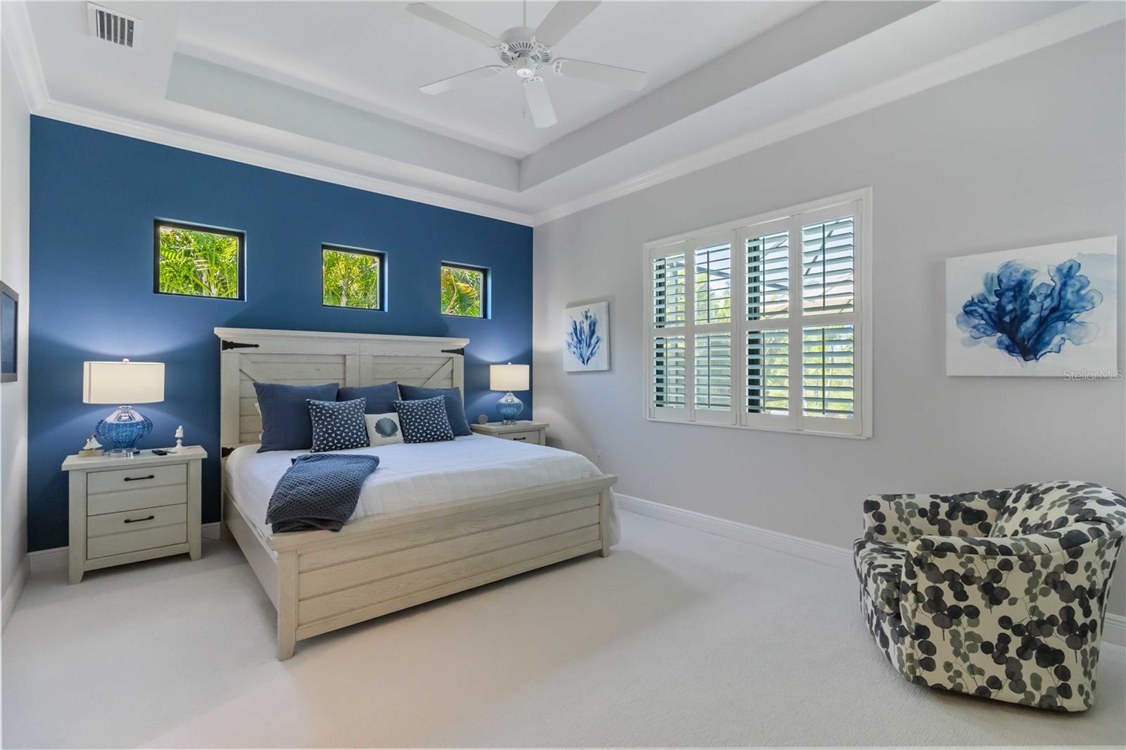 Ceiling Fans(s), Coffered Ceiling(s), Eat-in Kitchen, High Ceilings, Open Floorplan, Primary Bedroom Main Floor, Solid Surface Counters, Walk-In Closet(s), Window Treatments