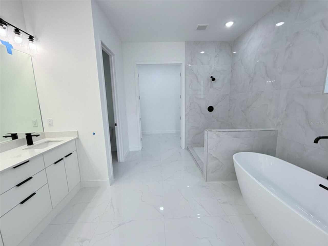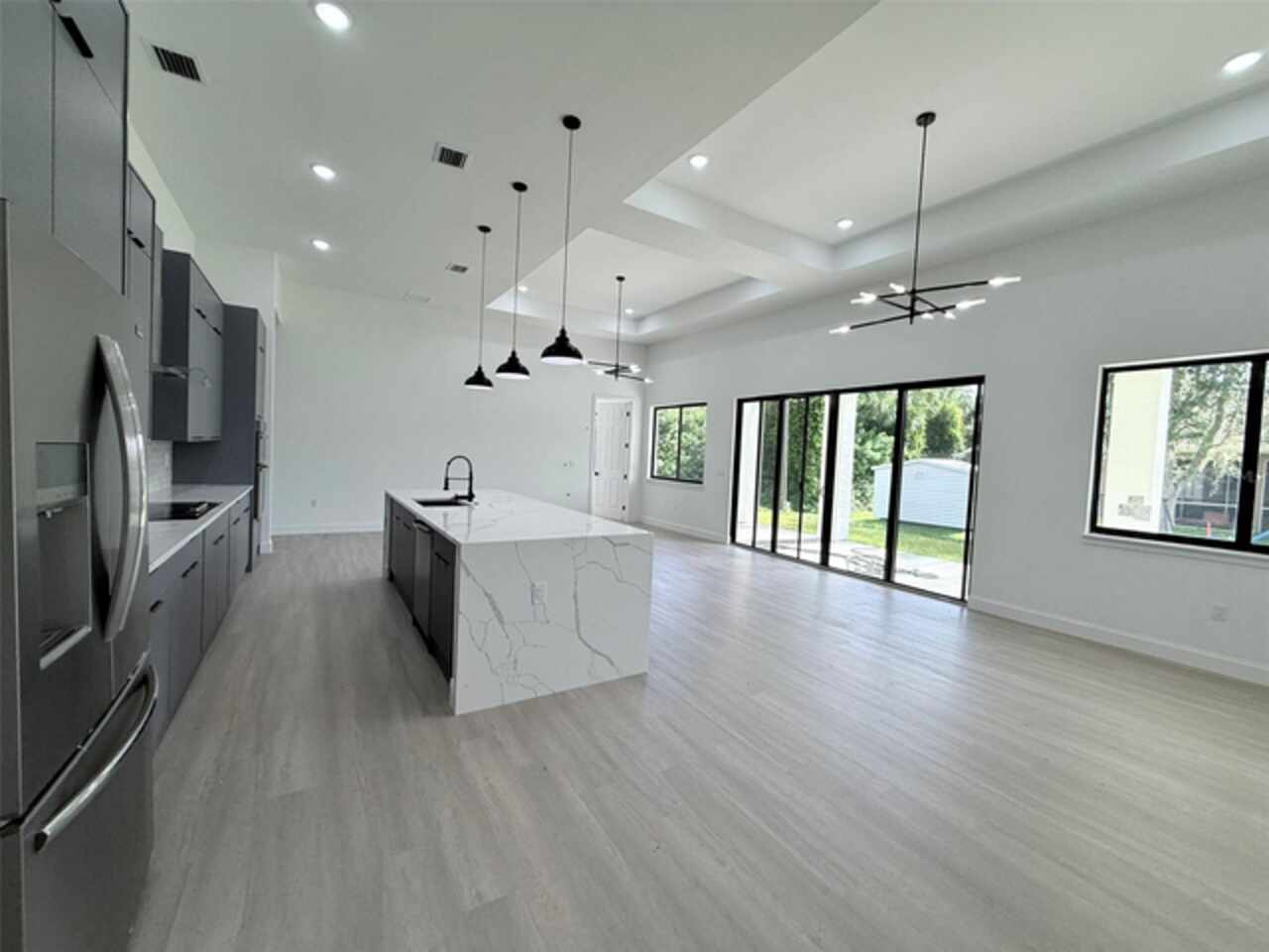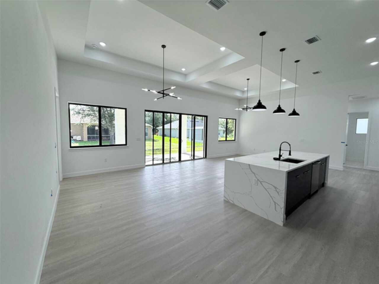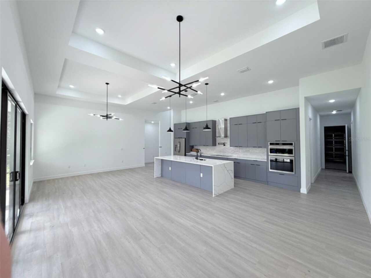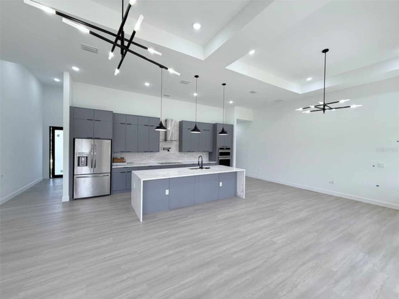 Introducing a newly constructed four-bedroom, three-bath residence in the heart of Port Charlotte. Spanning 2, 153 square feet of living space and totaling 3, 099 square feet, this home combines modern architecture with function and refined detail. The open-concept floor plan seamlessly integrates the living and dining areas, creating an inviting space for daily living and entertaining. A gourmet kitchen anchors the interior, featuring state-of-the-art stainless steel appliances and luxury finishes. High-quality vinyl flooring runs throughout, complementing soaring 10-, 12- and 13-foot ceilings that enhance the home's scale and light. The primary suite is a private retreat with a spa-style bath including a soaking tub, walk-in shower, double vanity and an oversized walk-in closet. Additional features include a laundry room with sink and pre-designed layout for future home enhancements. Thoughtful exterior design includes modern elevation details, sliding windows, a metal and glass front door, soffit lighting in the rear area and strategically placed gutters. The home sits on a site ready for a pool and has summer kitchen connections ready and water softener installed. Built in 2025 with an emphasis on craftsmanship and contemporary design, this property presents a rare opportunity to own a new-construction home in an established area of Port Charlotte.