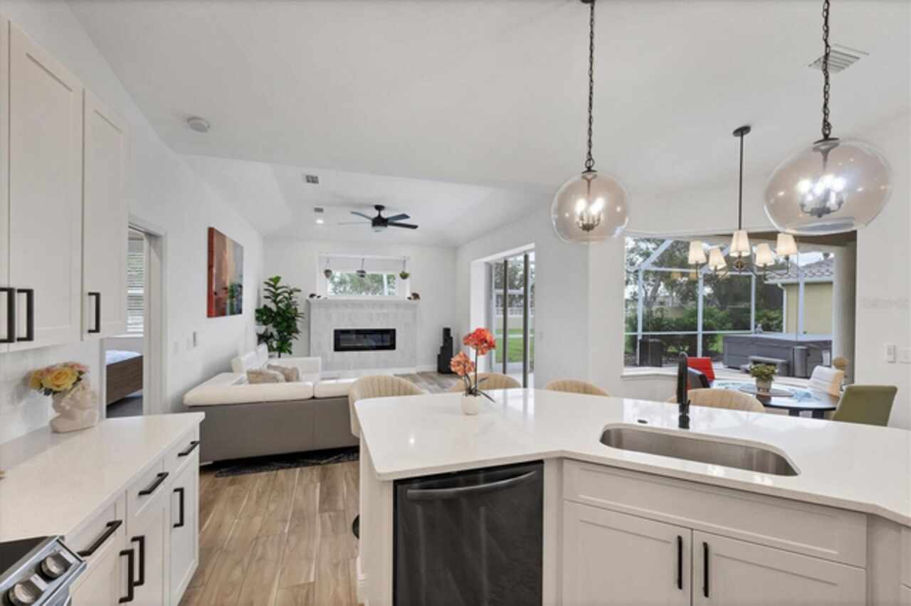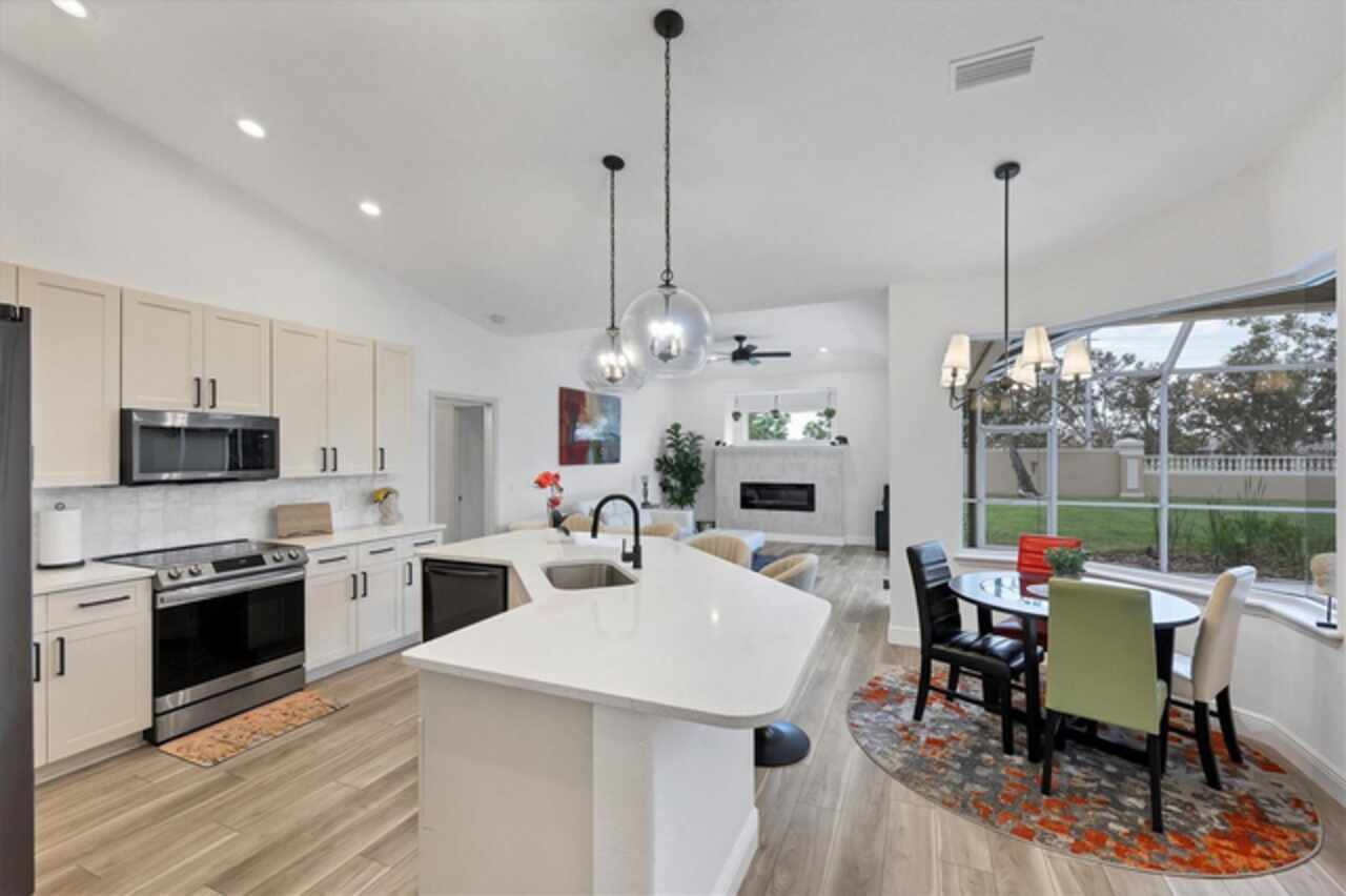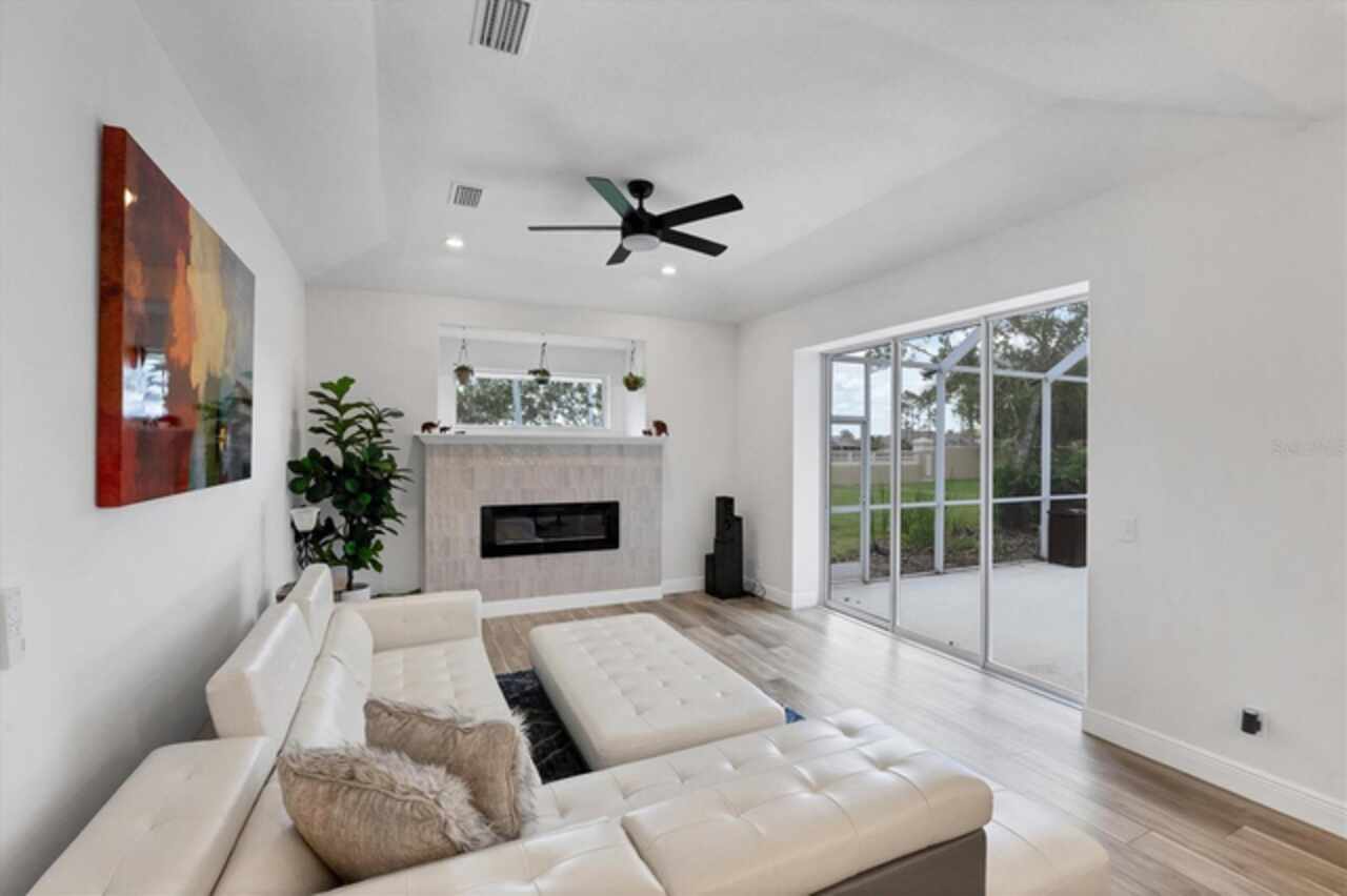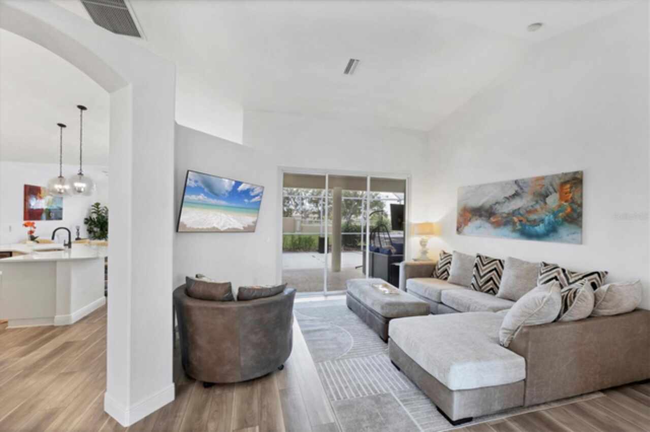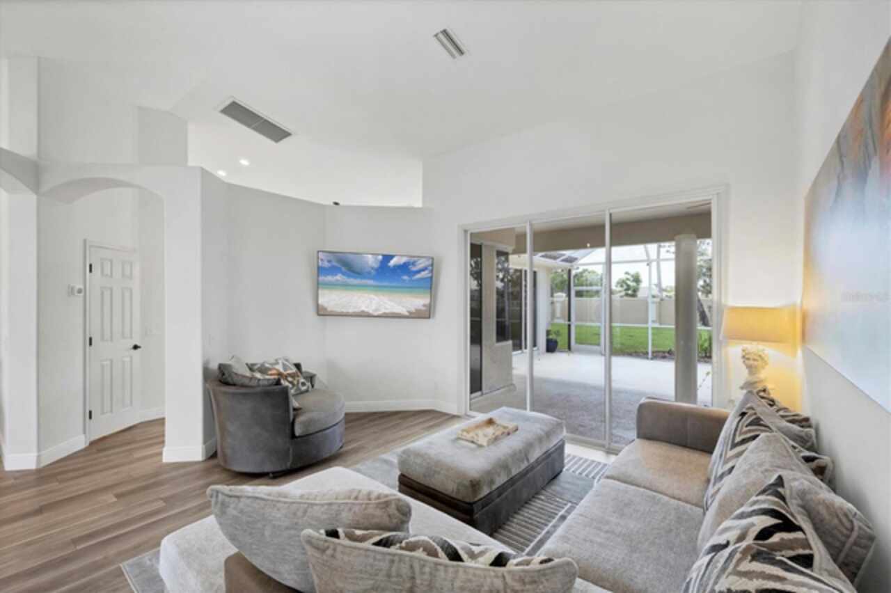 Stunning 4-Bedroom, 2-Bath Home with 2-Car Garage – New Tile Roof & A/C (2024)! This Beautifully Updated Split floor plan offers both a Spacious Living room and a Cozy Family room with a Sleek Electric Fireplace. Indoor Utility room with a Deep sink & Storage closet. Enjoy Outdoor Living on the Large Extended Screened Lanai, featuring Pocket Sliding Glass Doors from both the Family room & the Primary suite. Interior upgrades include Luxury Vinyl flooring, Stylish Modern Fixtures, 42” upper kitchen cabinets, Stainless steel appliances, Quartz countertops & Mosaic tile backsplash. The kitchen also features a Closet pantry, Breakfast bar, and a Charming Breakfast nook. The private primary suite boasts a Walk-in Closet and a Spa-like en-suite Bath with Porcelain Tile floors, a Double-Sink vanity, Soaking tub, and Seamless glass shower. Additional highlights include an Outdoor shower, New Water softener system, and an Irrigation system that uses Reclaimed water. Set on a 12, 155 sq ft lot in a Desirable Gated Community offering a Clubhouse, Fitness Center, Pickleball, Tennis, Heated Pool and Spa. All Conveniently located near Publix, Shopping, Dining, Rothenbach Park (a community park with about five miles of paved recreational trails & Two playground areas with the latest in safe playground equipment and more), and the Celery Fields (an ideal location for wildlife watching and passive recreational use). Bonus: Spa on the lanai and all furnishings available separately!
