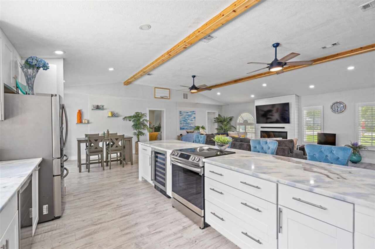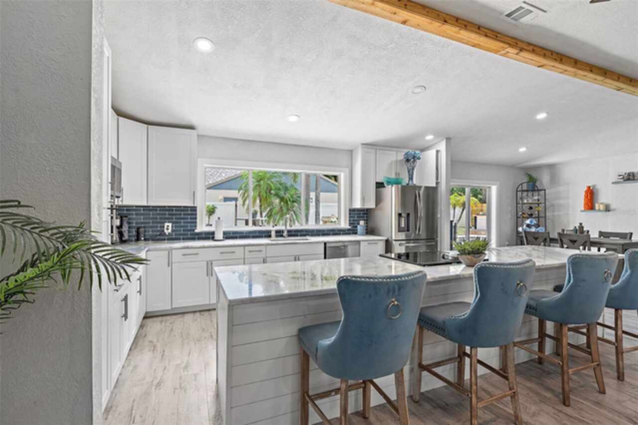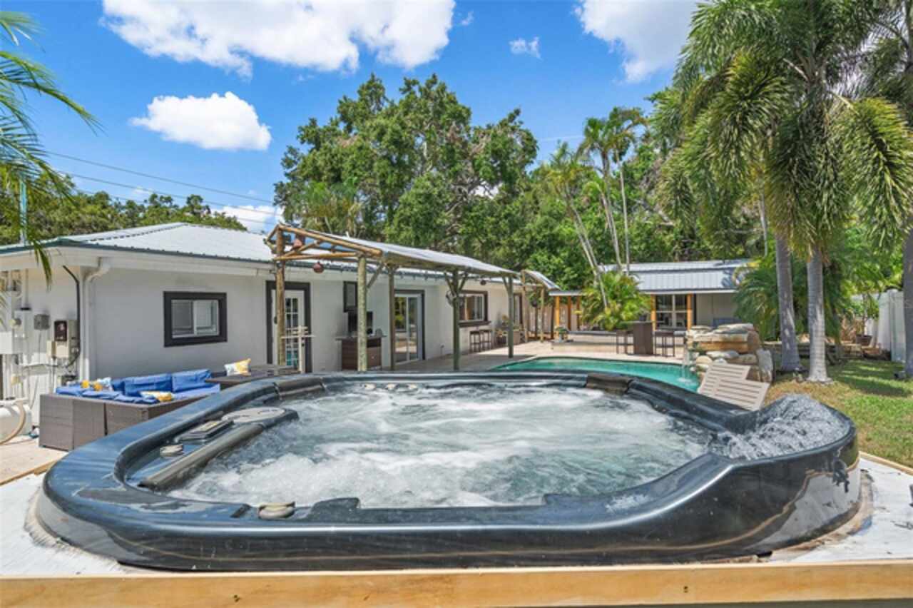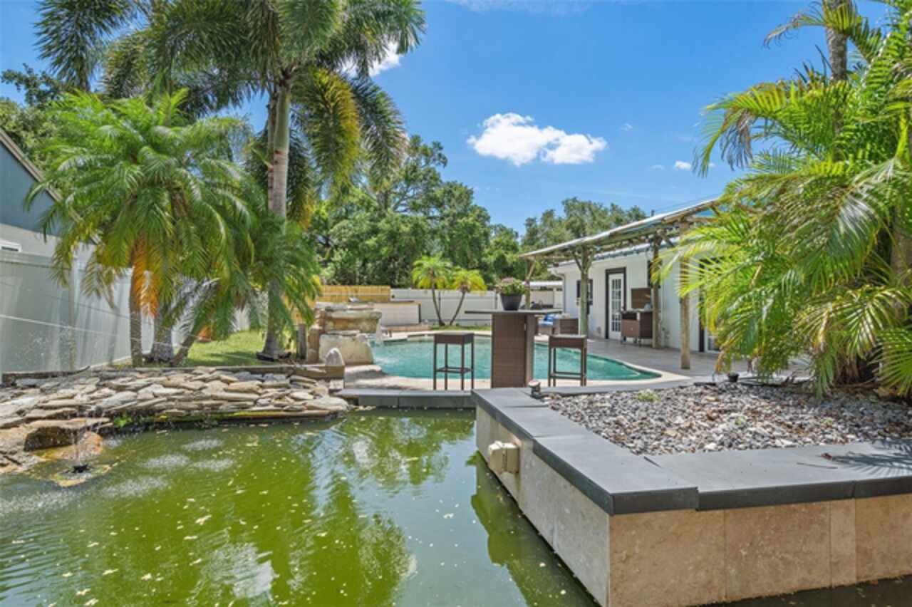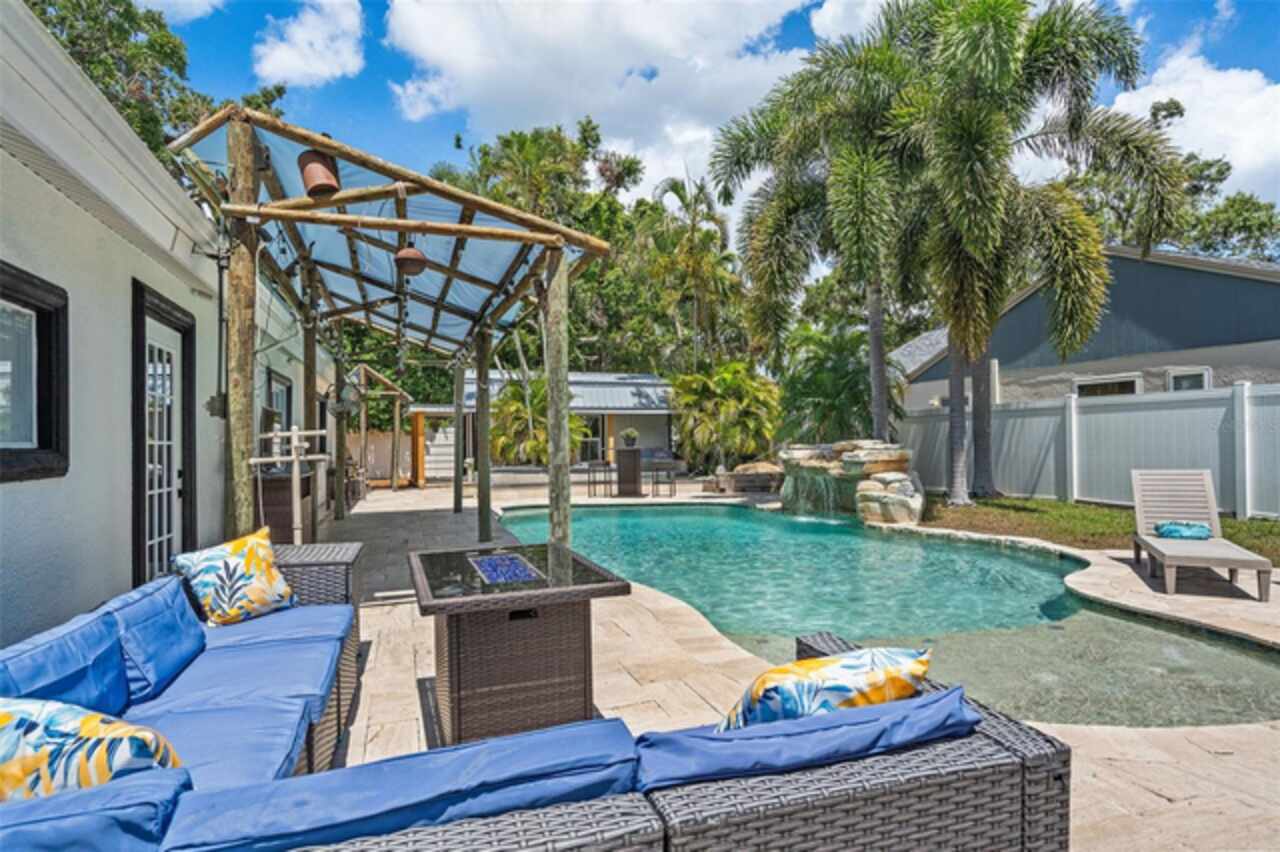 This recently remodeled home is the epitome of an open concept living space with 900sf of the center of the home dedicated to the combo Living Room, Dining area and massive Kitchen with raised ceilings highlighted by natural wood beams. The kitchen island measures nearly 13 feet and is topped with high grade granite. The large picture window in the kitchen provides not only a picturesque view of the backyard but also acts as a passthrough and provides an abundance of natural light. The kitchen has recently been updated with new tall kitchen cabinets and newer appliances including a large wine cooler and range that includes air frying. The LR features a large electric fireplace with smart electronics in recessed lighting and ceiling fans. The primary bedroom suite consists of a bathroom ensuite (10 x 10) featuring a soaker tub, double vanity, and two rainfall shower heads and wands with a floor to ceiling large format tiled feature wall. Also included in the primary bedroom is a large walk in closet (10 x 10) which is also donned by natural light. The floorplan provides split bedrooms which flank another full bath that features a separate stand up shower and Jacuzzi whirlpool bathtub. An additional bedroom/bonus room/office is located as a stand alone building just outside the main house. This room measures 200sf but also has an additional 72sf of loft space and runs on its own cooling system. It has double windows that provide a view of the fabulous backyard. The building is wrapped by a covered porch on two sides. The backyard - what doesn't it have? It provides you with a large 20 x 30 pool featuring a faux rock waterfall with grotto. This pool was a salt water pool and can be easily converted back. There is a large pond that currently houses koi as well as a standalone hot tub which overlooks the pool. There is an outdoor (partially covered) kitchen which has running water, electric, small refrigerator, smoker and grill capabilities. Included with this home is a golf/batting net with ball feeder making this a backyard playground unlike most others. This home is located in unincorporated Pinellas County which allows short term rentals and parking of larger vehicles (RV/boat) on your own property. The driveway is extra long and double wide with an additional parking pad. The home sits on just over 1/4 acre with open land/pond on the west side that can't be developed which provides additional seclusion. Property is in a non-flood zone and was not affected by the hurricanes and yet it is only 1 mile to the edge of Tampa bay; 2 miles to a marina with a boat ramp; 3 miles to a public golf course; 15 minutes to the sands of Clearwater beach. AC 2022; Metal Roof 2005 (50 year life expectancy) Tankless water heater 2022; pool pump about 2020