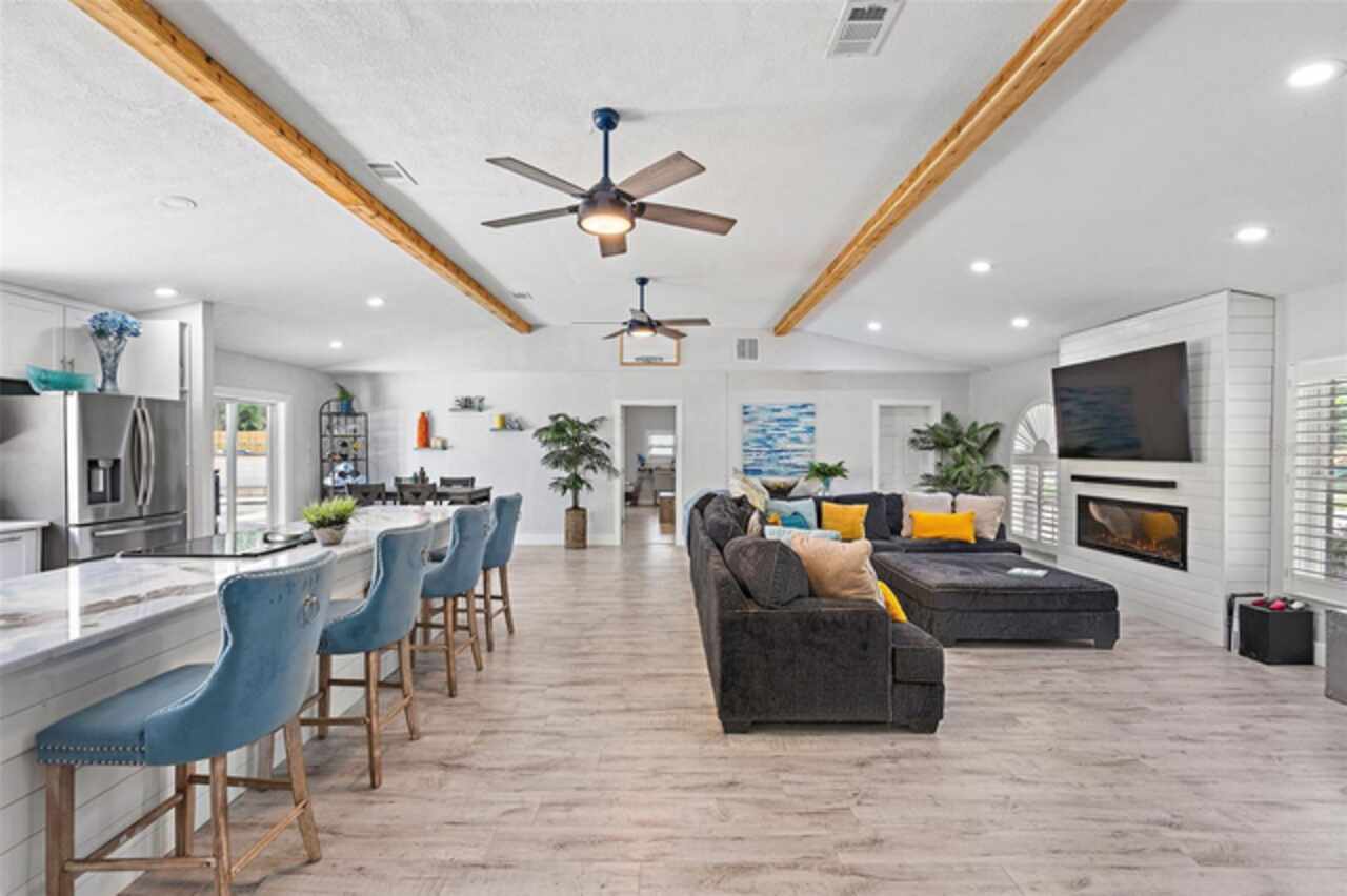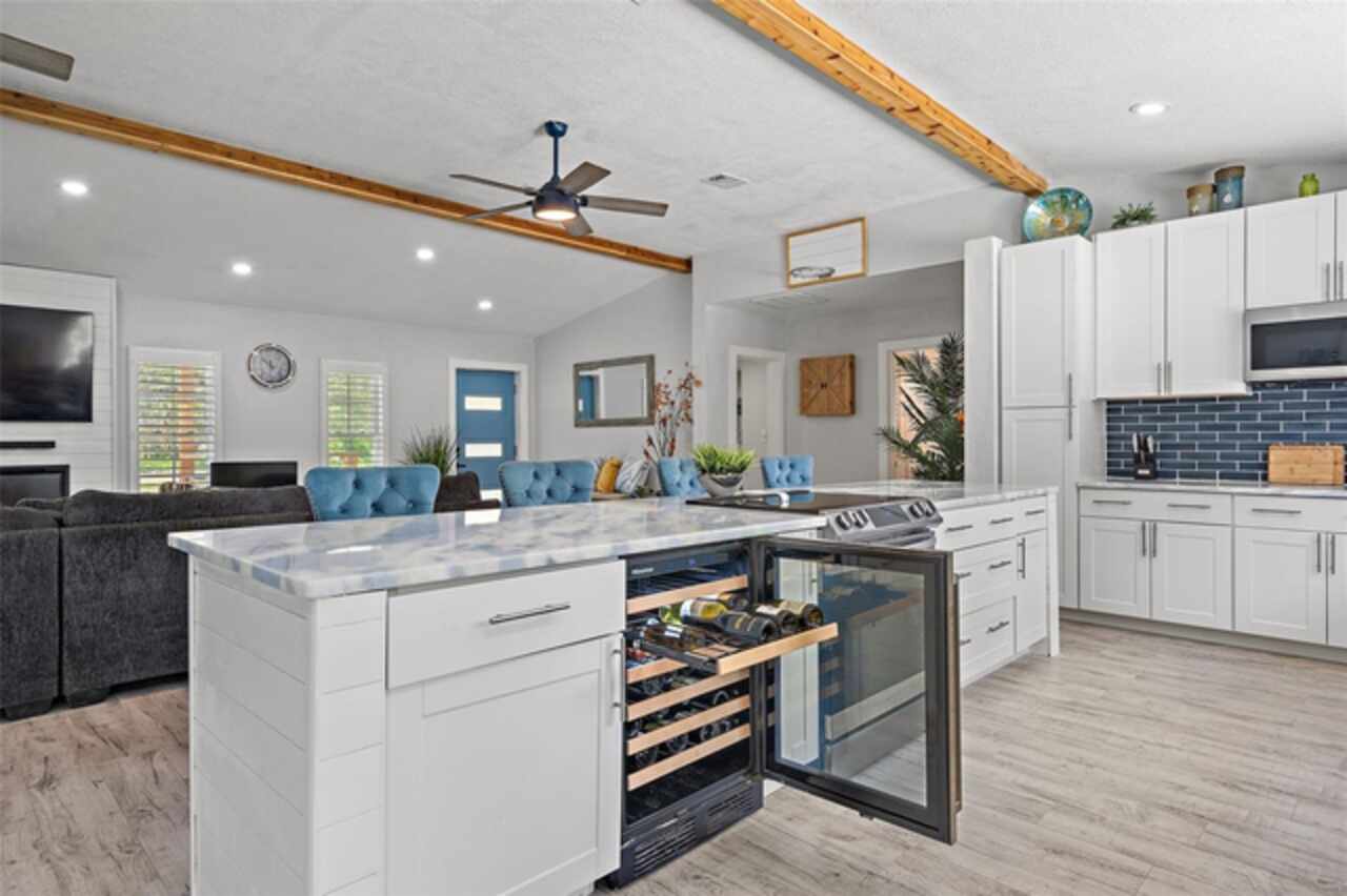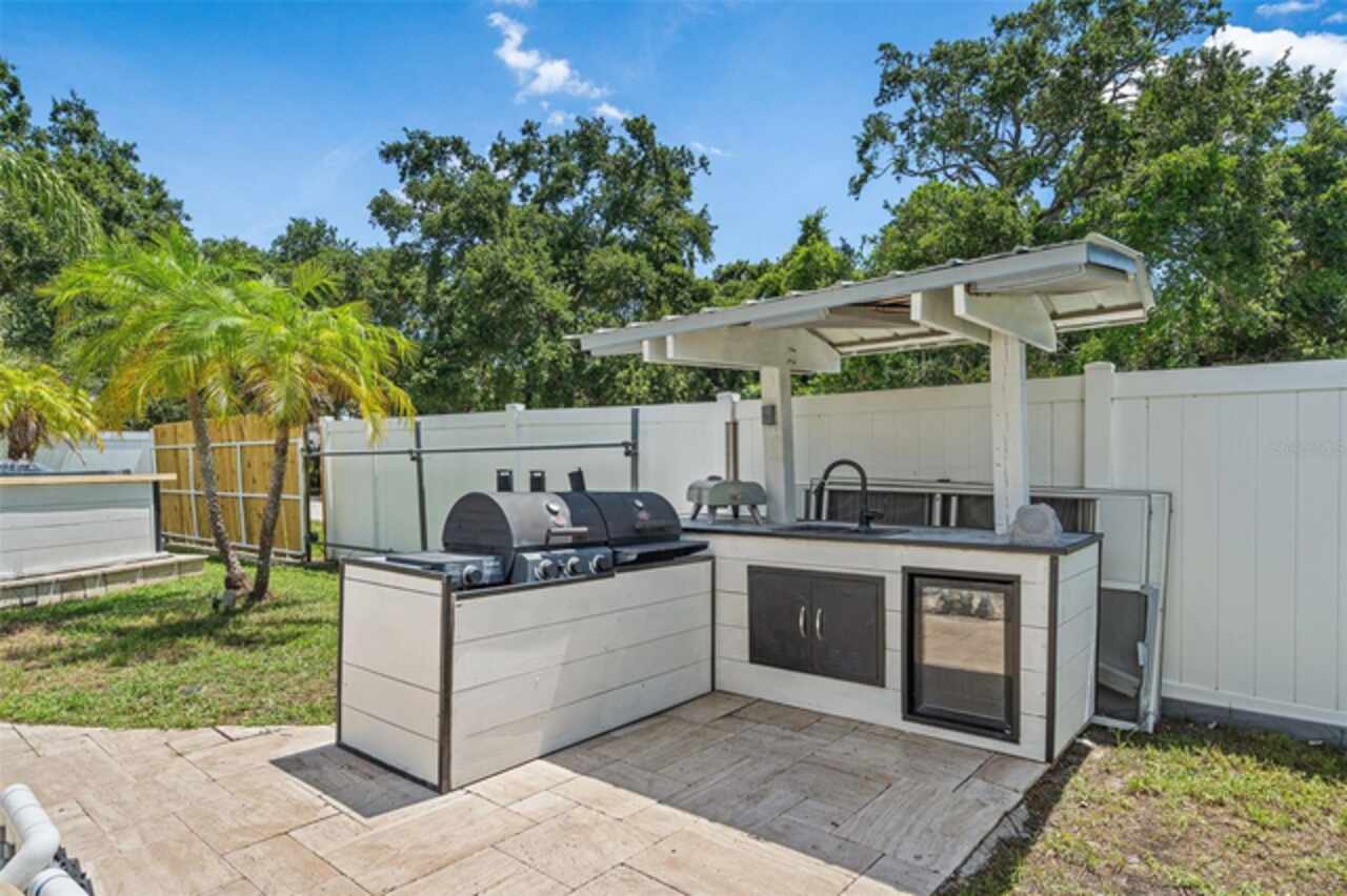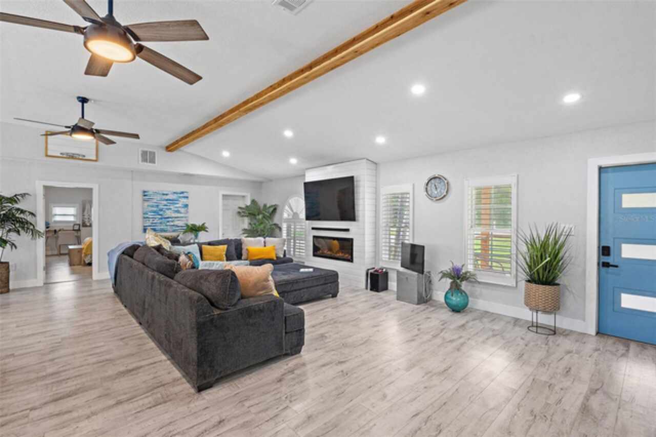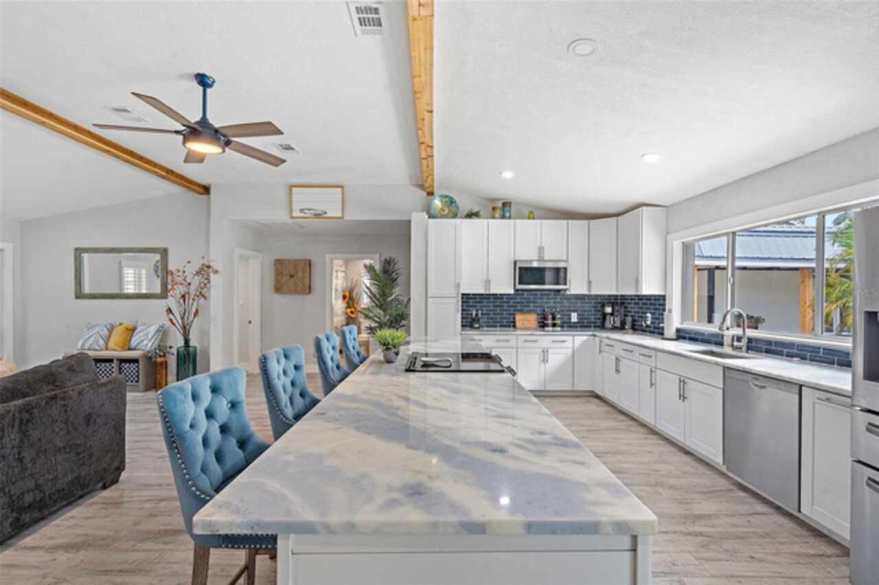 This recently remodeled home is the epitome of an open concept living space with 900sf of the center of the home dedicated to the combo Living Room, Dining area and massive Kitchen with raised ceilings highlighted by natural wood beams. The kitchen island measures nearly 13 feet and is topped with high grade granite. The large picture window in the kitchen provides not only a picturesque view of the backyard but also acts as a passthrough and provides an abundance of natural light. The kitchen has recently been updated with new tall kitchen cabinets and newer appliances including a large wine cooler and range that includes air frying. The LR features a large electric fireplace with smart electronics in recessed lighting and ceiling fans. The primary bedroom suite consists of a bathroom ensuite (10 x 10) featuring a soaker tub, double vanity, and two rainfall shower heads and wands with a floor to ceiling large format tiled feature wall. Also included in the primary bedroom is a large walk in closet (10 x 10) which is also donned by natural light. The floorplan provides split bedrooms which flank another full bath that features a separate stand up shower and Jacuzzi whirlpool bathtub. An additional bedroom/bonus room/office is located as a stand alone building just outside the main house. This room measures 200sf but also has an additional 72sf of loft space and runs on its own cooling system. It has double windows that provide a view of the fabulous backyard. The building is wrapped by a covered porch on two sides. The backyard - what doesn't it have? It provides you with a large 20 x 30 pool featuring a faux rock waterfall with grotto. This pool was a salt water pool and can be easily converted back. There is a large pond that currently houses koi as well as a standalone hot tub which overlooks the pool. There is an outdoor (partially covered) kitchen which has running water, electric, small refrigerator, smoker and grill capabilities. Included with this home is a golf/batting net with ball feeder making this a backyard playground unlike most others. This home is located in unincorporated Pinellas County which allows short term rentals and parking of larger vehicles (RV/boat) on your own property. The driveway is extra long and double wide with an additional parking pad. The home sits on just over 1/4 acre with open land/pond on the west side that can't be developed which provides additional seclusion. Property is in a non-flood zone and was not affected by the hurricanes and yet it is only 1 mile to the edge of Tampa bay; 2 miles to a marina with a boat ramp; 3 miles to a public golf course; 15 minutes to the sands of Clearwater beach. AC 2022; Metal Roof 2005 (50 year life expectancy) Tankless water heater 2022; pool pump about 2020