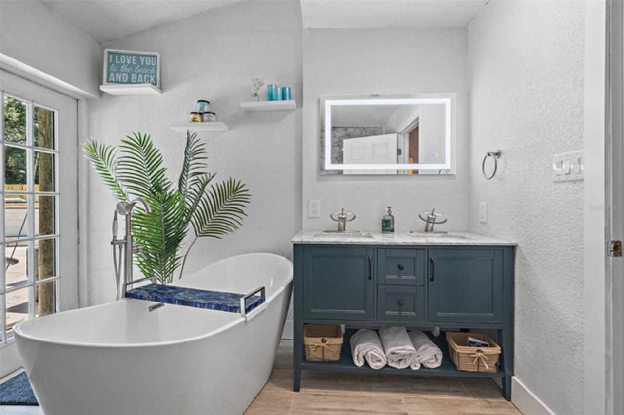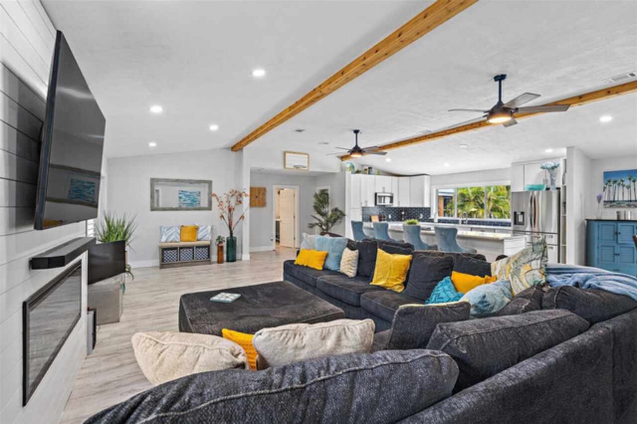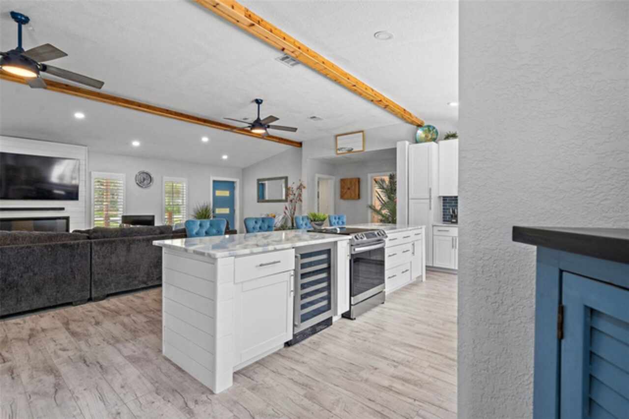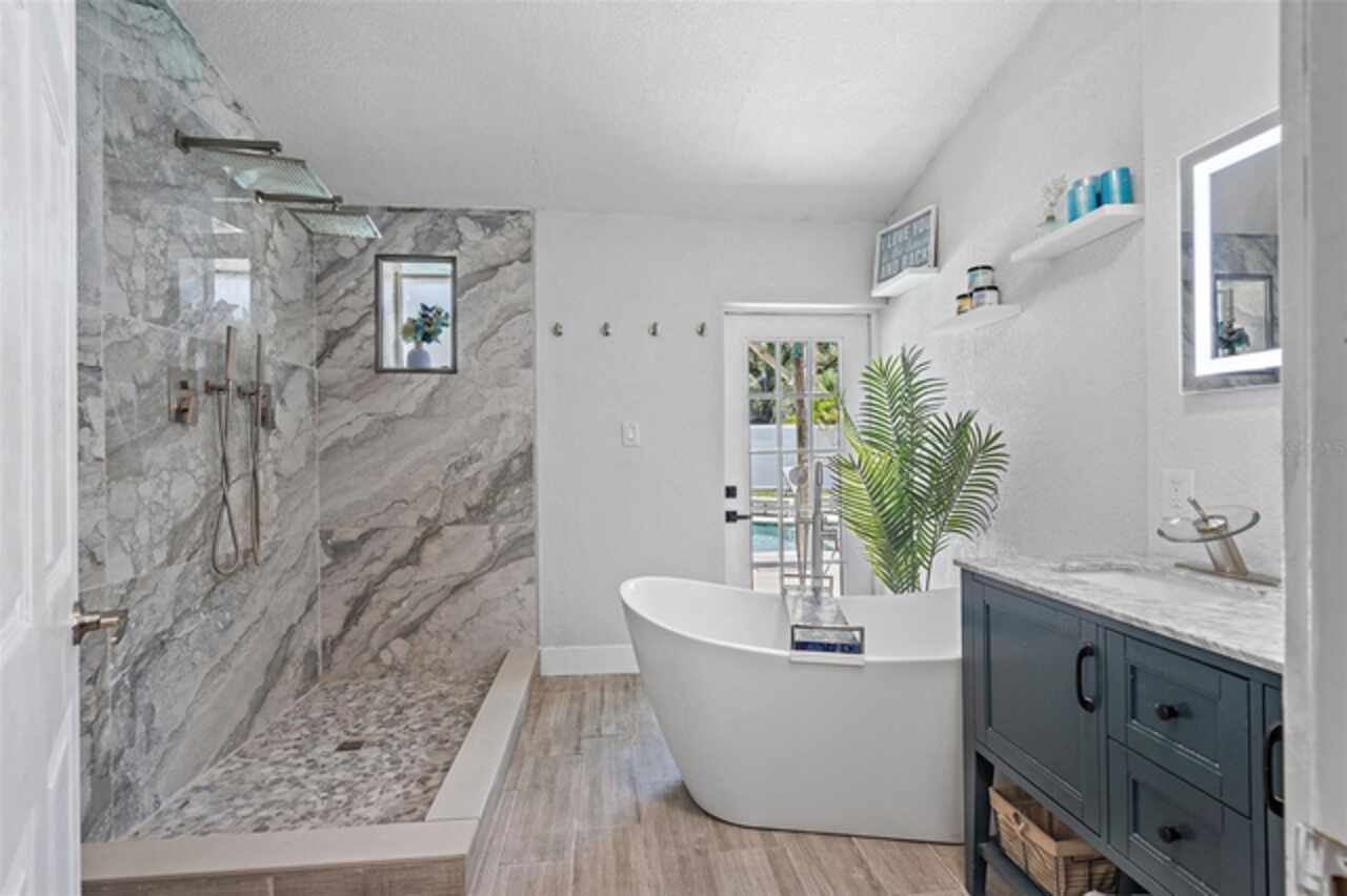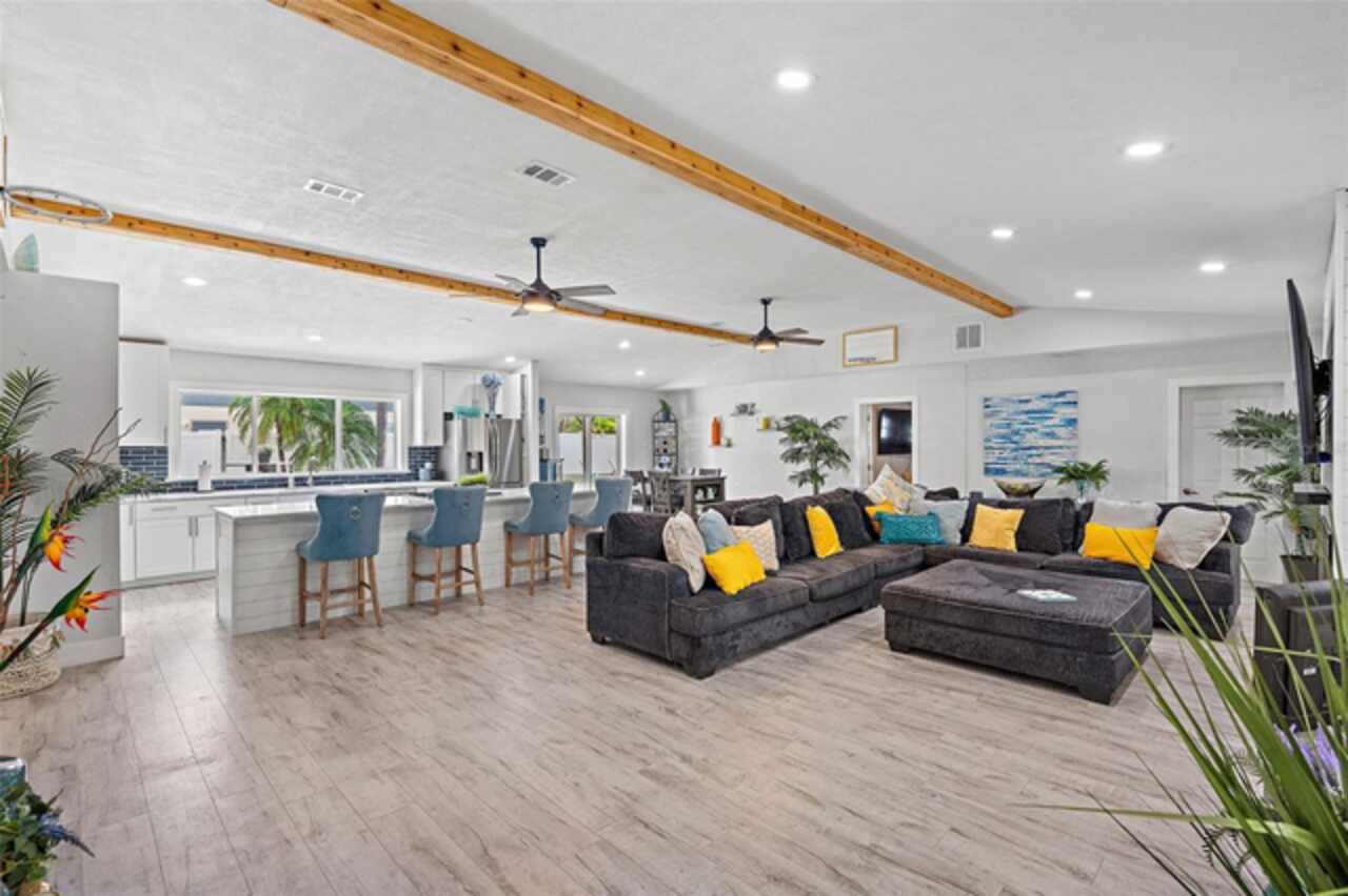 This recently remodeled home is the epitome of an open concept living space with 900sf of the center of the home dedicated to the combo Living Room, Dining area and massive Kitchen with raised ceilings highlighted by natural wood beams. The kitchen island measures nearly 13 feet and is topped with high grade granite. The large picture window in the kitchen provides not only a picturesque view of the backyard but also acts as a passthrough and provides an abundance of natural light. The kitchen has recently been updated with new tall kitchen cabinets and newer appliances including a large wine cooler and range that includes air frying. The LR features a large electric fireplace with smart electronics in recessed lighting and ceiling fans. The primary bedroom suite consists of a bathroom ensuite (10 x 10) featuring a soaker tub, double vanity, and two rainfall shower heads and wands with a floor to ceiling large format tiled feature wall. Also included in the primary bedroom is a large walk in closet (10 x 10) which is also donned by natural light. The floorplan provides split bedrooms which flank another full bath that features a separate stand up shower and Jacuzzi whirlpool bathtub. An additional bedroom/bonus room/office is located as a stand alone building just outside the main house. This room measures 200sf but also has an additional 72sf of loft space and runs on its own cooling system. It has double windows that provide a view of the fabulous backyard. The building is wrapped by a covered porch on two sides. The backyard - what doesn't it have? It provides you with a large 20 x 30 pool featuring a faux rock waterfall with grotto. This pool was a salt water pool and can be easily converted back. There is a large pond that currently houses koi as well as a standalone hot tub which overlooks the pool. There is an outdoor (partially covered) kitchen which has running water, electric, small refrigerator, smoker and grill capabilities. Included with this home is a golf/batting net with ball feeder making this a backyard playground unlike most others. This home is located in unincorporated Pinellas County which allows short term rentals and parking of larger vehicles (RV/boat) on your own property. The driveway is extra long and double wide with an additional parking pad. The home sits on just over 1/4 acre with open land/pond on the west side that can't be developed which provides additional seclusion. Property is in a non-flood zone and was not affected by the hurricanes and yet it is only 1 mile to the edge of Tampa bay; 2 miles to a marina with a boat ramp; 3 miles to a public golf course; 15 minutes to the sands of Clearwater beach. AC 2022; Metal Roof 2005 (50 year life expectancy) Tankless water heater 2022; pool pump about 2020