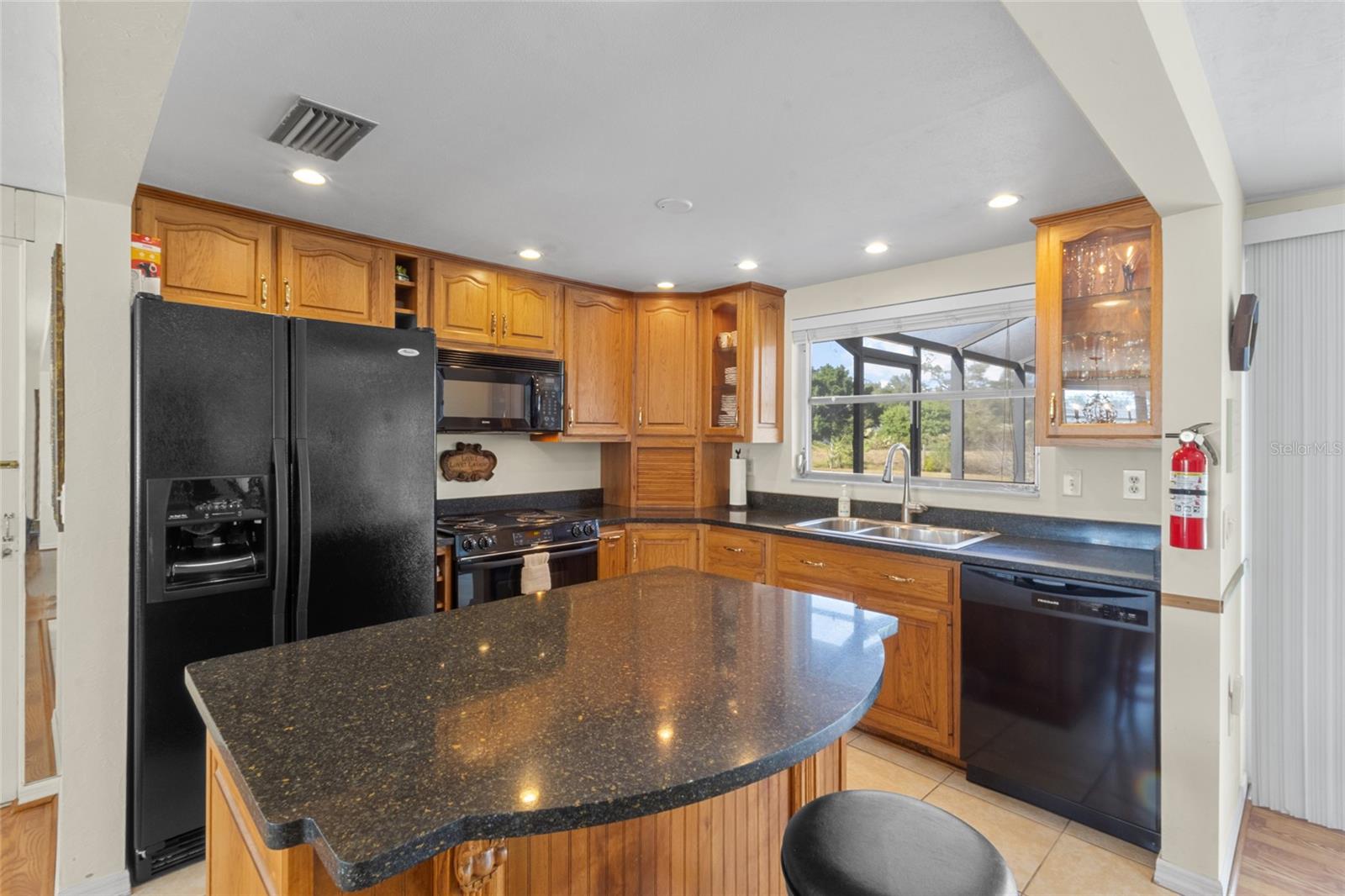 Kitchen/Family Room Combo, Open Floorplan, Primary Bedroom Main Floor, Solid Surface Counters, Solid Wood Cabinets, Stone Counters, Thermostat, Window Treatments