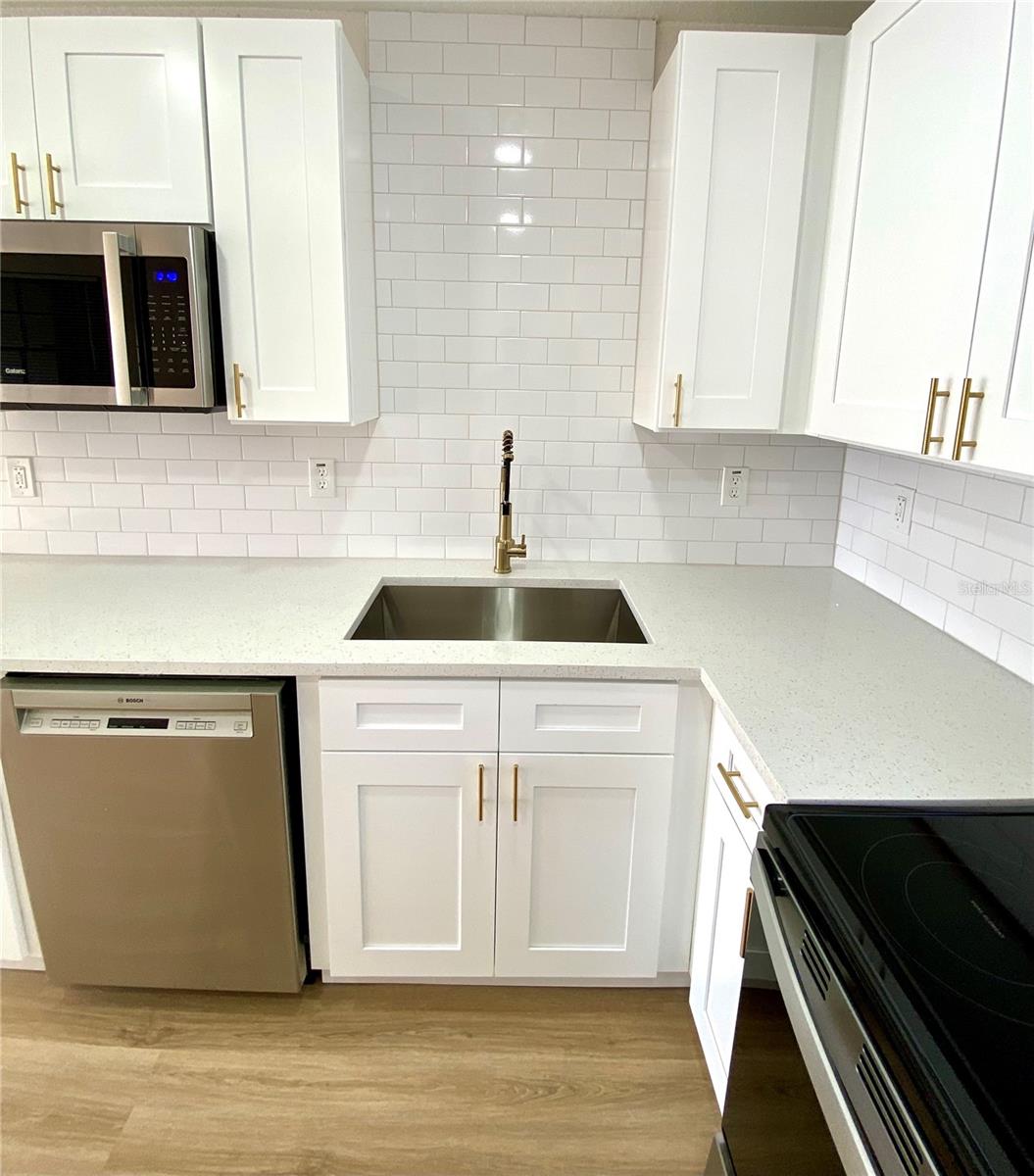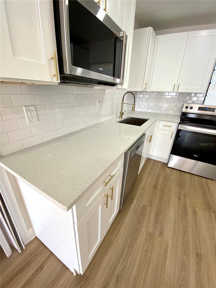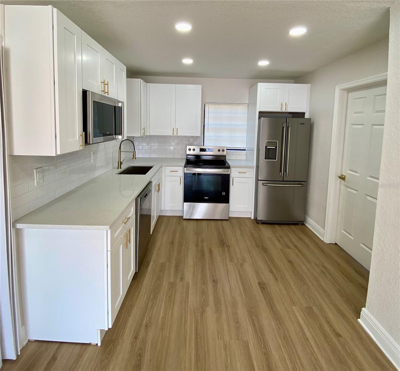 Welcome to this charming 3/2 1, 075 sqft. block home situated on a spacious double lot in a quiet Tampa neighborhood. Featuring an attached garage and an inviting covered front porch, this home offers both comfort and curb appeal. Step inside to an open layout filled with natural light, showcasing quartz countertops throughout, shaker cabinets in the kitchen and both bathrooms, and tasteful finishes that make the home feel fresh and modern. The en suite master bathroom features elegant floor-to-ceiling tile, and the guest bath includes a bathtub with matching floor-to-ceiling tile and quartz vanity. Your buyers will have peace of mind with the brand new 2025 roof, plus newer AC and water heater. A large indoor laundry room adds extra convenience and storage space. Outside, enjoy a very large backyard with endless possibilities, perfect for gatherings, pets, gardening, or future expansion. Located on a quiet street just minutes from local schools, this property offers both comfort and convenience. Don’t miss this beautifully updated home with modern finishes and a rare oversized lot!