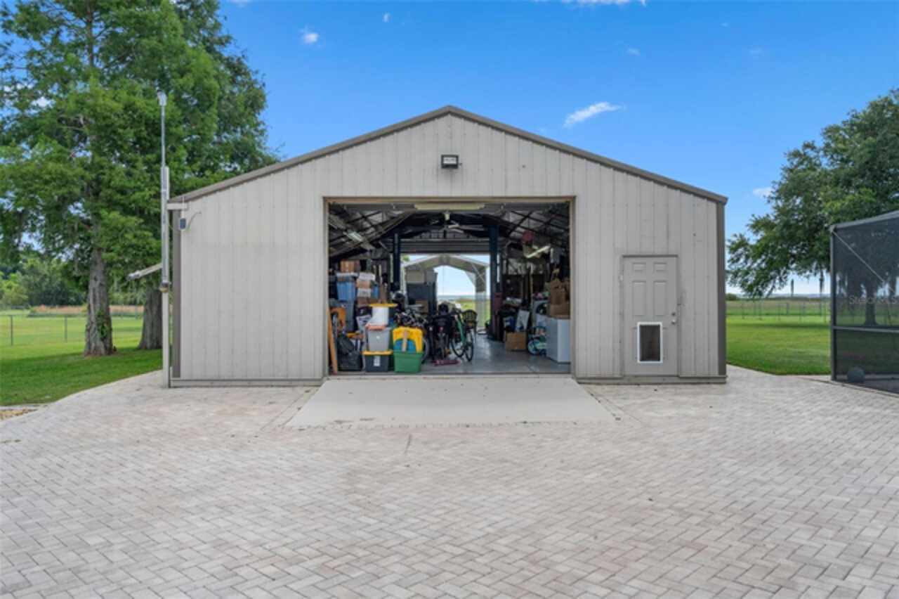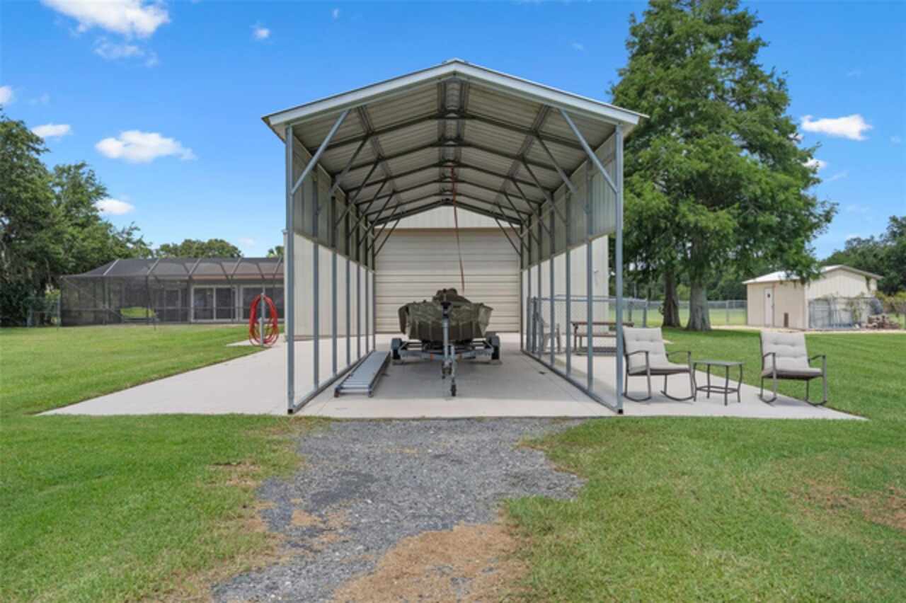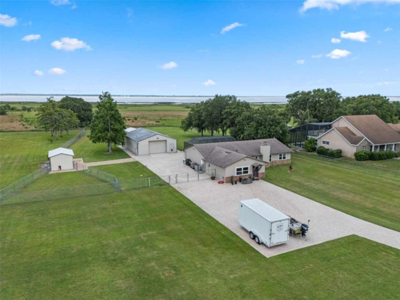 Have you ever wanted to live on your very own property with an acre of land, Maybe 2 plus acres? How about a dock and a lake and let's throw in a screen enclosed covered inground pool! Want more? 1500 square foot Hurricane ready metal workshop with a hydraulic lift and its own Air Conditioner! Let's explore all this in more detail. Interior features a centerpiece kitchen with a tremendous " L" shaped granite island, an abundance of 42" Maple cabinets with undermount lighting, backsplash and stainless steel appliances plus a bonus buffet and counter of additional lower cabinets for extra storage. Spacious family room with brick fireplace, huge bonus room with custom built personal bar. Split floor plan provides a master bedroom with 2 walk in closets, jetted tub and shower, secondary bedroom offers great flexibility to an office with built in Murphy bed and closet. There is also a Florida Room with triple sliding glass doors leading out to the aforementioned pool. Double pane windows and doors. Additional exterior features include a gorgeous Oak Tree providing the perfect amount of shade to sit under and enjoy an afternoon book and or beverage. The 50 x 30 workshop has a drive through capability with commercial lift gates at each end making it a piece of cake to drive multiple motor vehicles including but not limited to a boat and trailer, RV and even has a boatport to keep it cool in the shade. This home also features one of the very few homes with its own private dock on Lake Toho spanning 22, 700 acres and 42 miles in circumference. It's a popular destination for fishing, especially for largemouth bass. The home also has the best of utilities having connection to City water for intake and septic for drainage keeping those bills at a bare minimum. 4 zone HVAC each with its own thermostat, propane tank for the tankless hot water heater. Electric gated entry. Additional parcel next door available to combine for a total of 2.32 acres.
