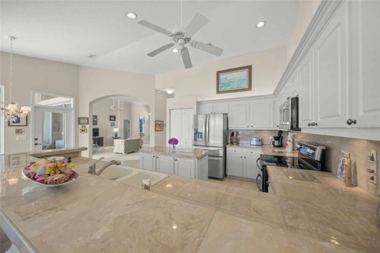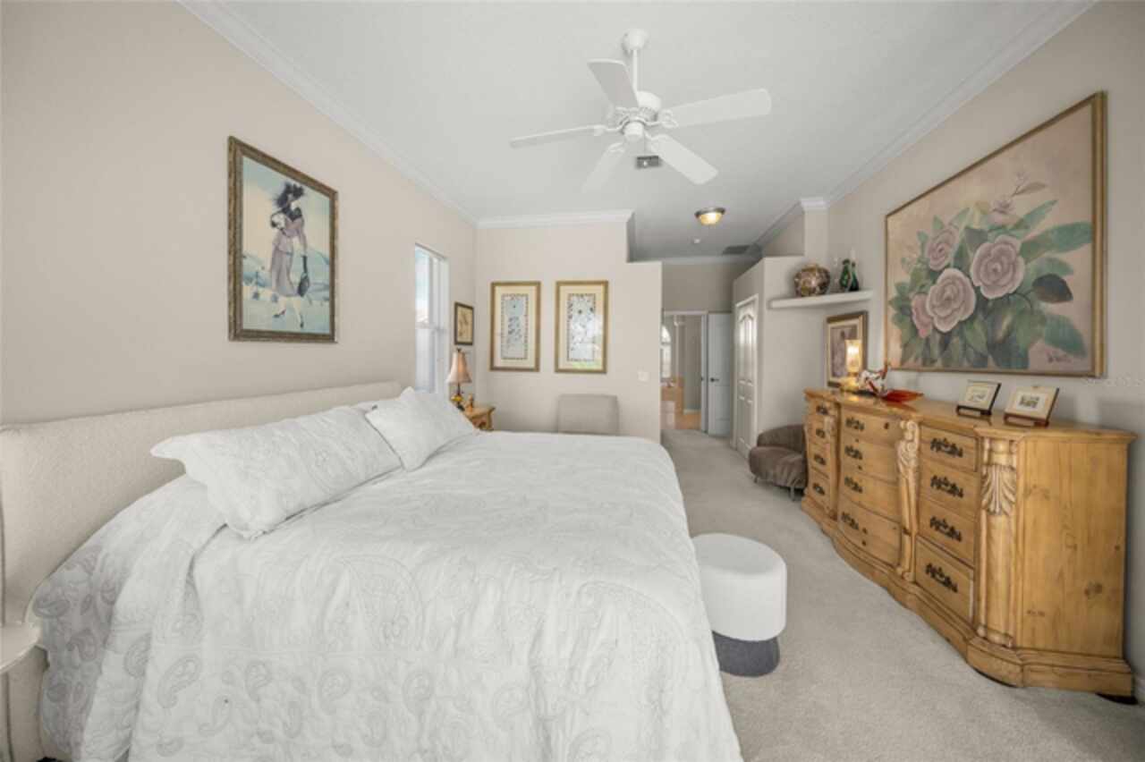 Built-in Features, Ceiling Fans(s), Crown Molding, Eat-in Kitchen, High Ceilings, Open Floorplan, Solid Surface Counters, Solid Wood Cabinets, Split Bedroom, Walk-In Closet(s)