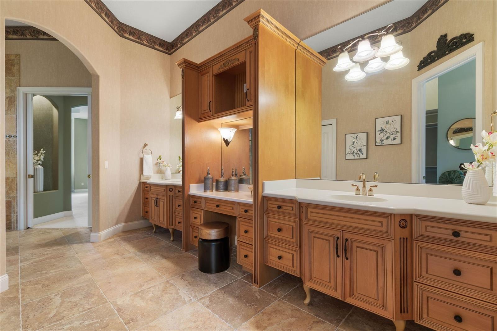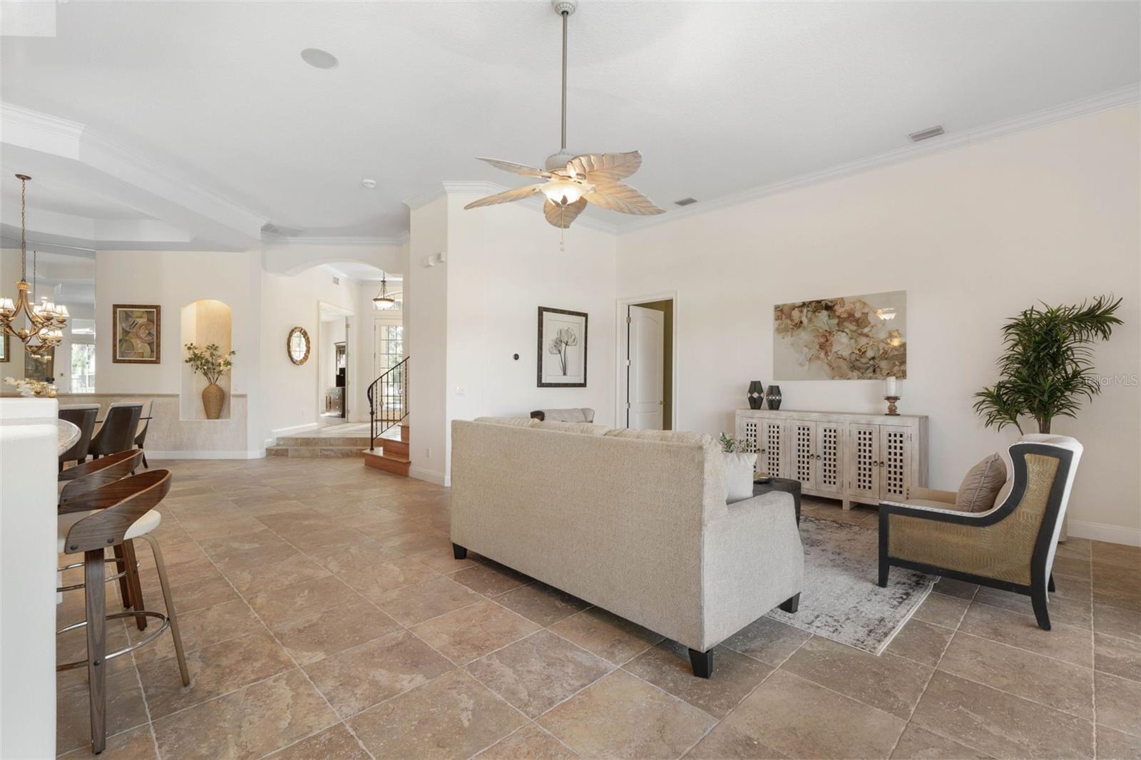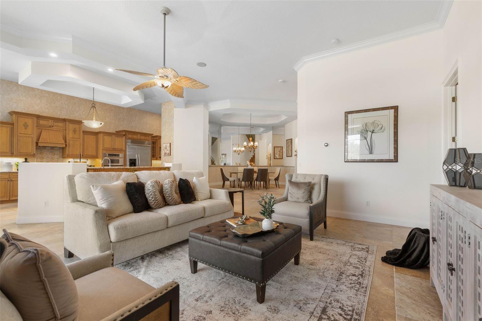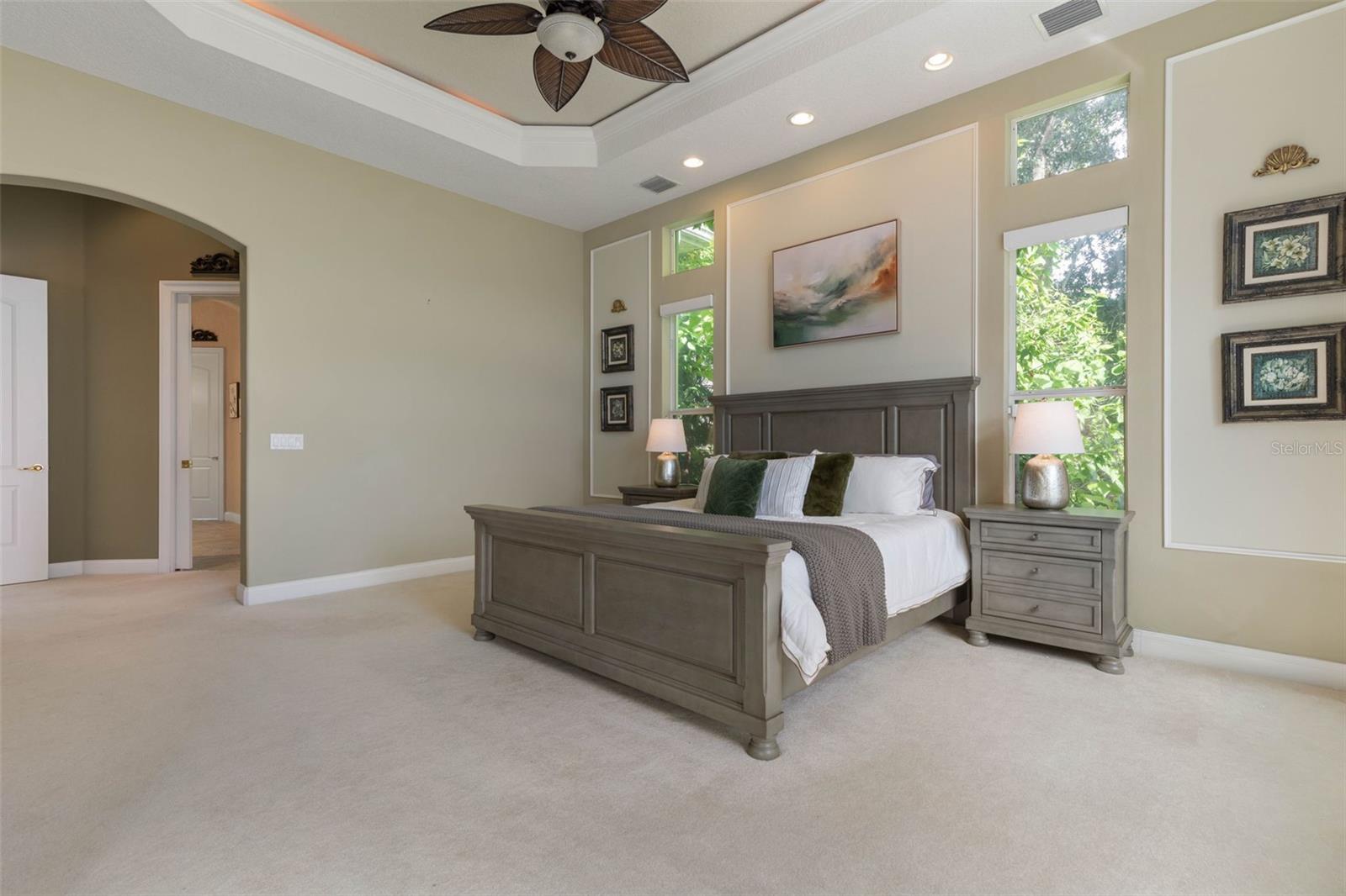 Built-in Features, Ceiling Fans(s), Chair Rail, Crown Molding, Eat-in Kitchen, High Ceilings, Open Floorplan, Primary Bedroom Main Floor, Solid Wood Cabinets, Split Bedroom, Stone Counters, Tray Ceiling(s), Walk-In Closet(s), Window Treatments