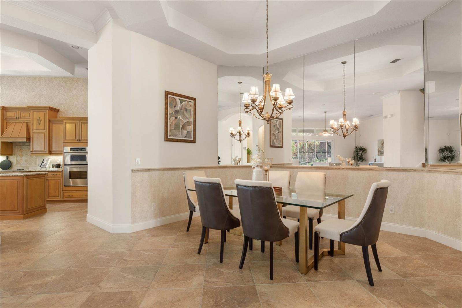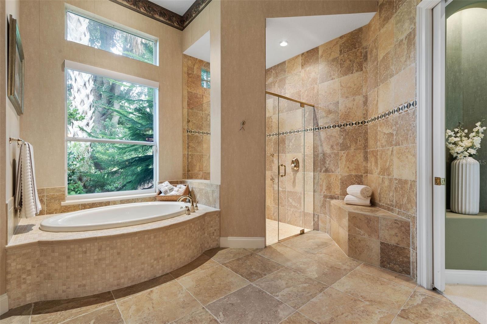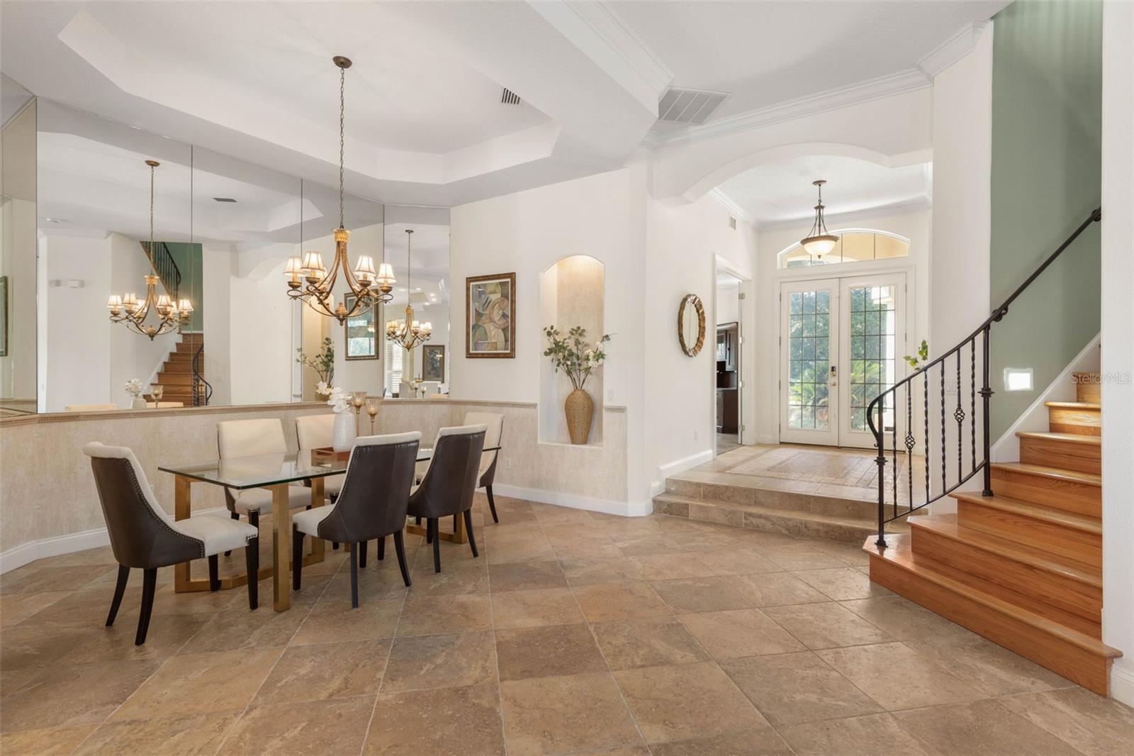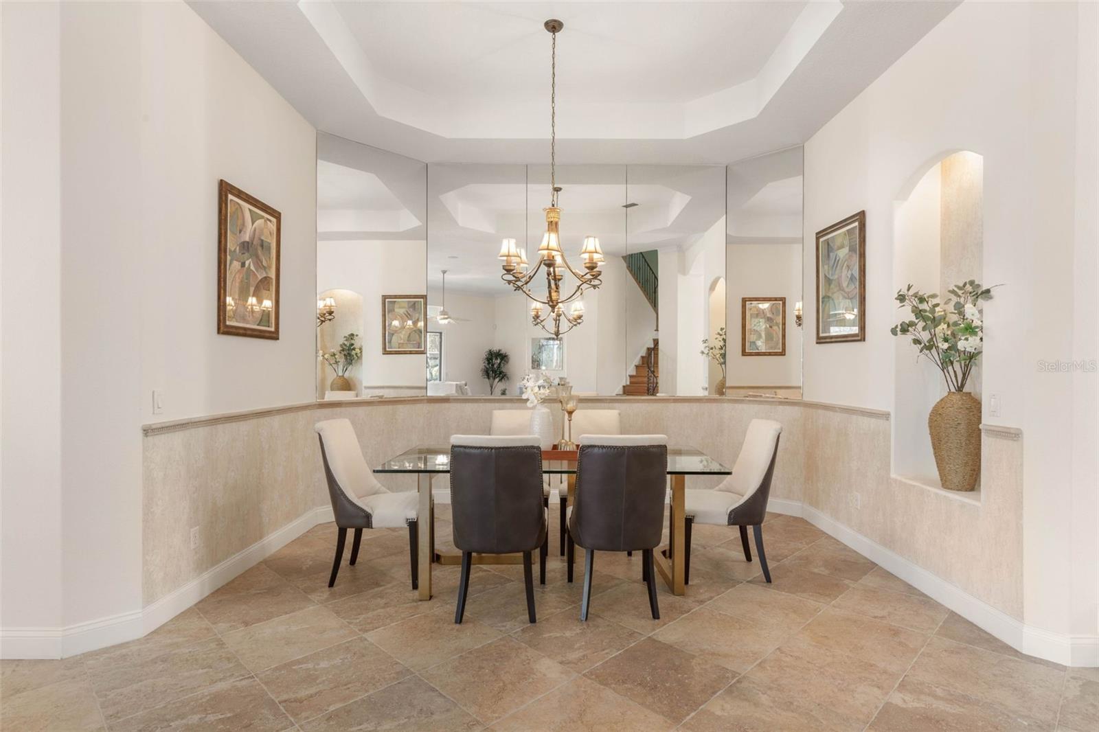 Built-in Features, Ceiling Fans(s), Chair Rail, Crown Molding, Eat-in Kitchen, High Ceilings, Open Floorplan, Primary Bedroom Main Floor, Solid Wood Cabinets, Split Bedroom, Stone Counters, Tray Ceiling(s), Walk-In Closet(s), Window Treatments