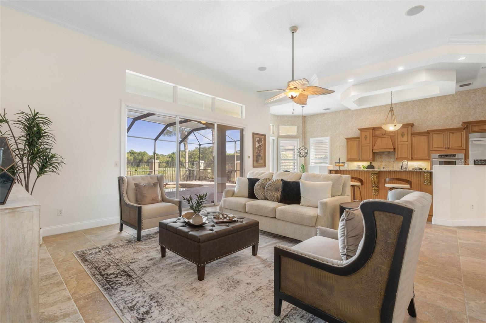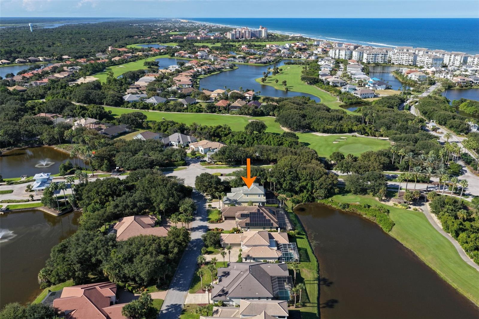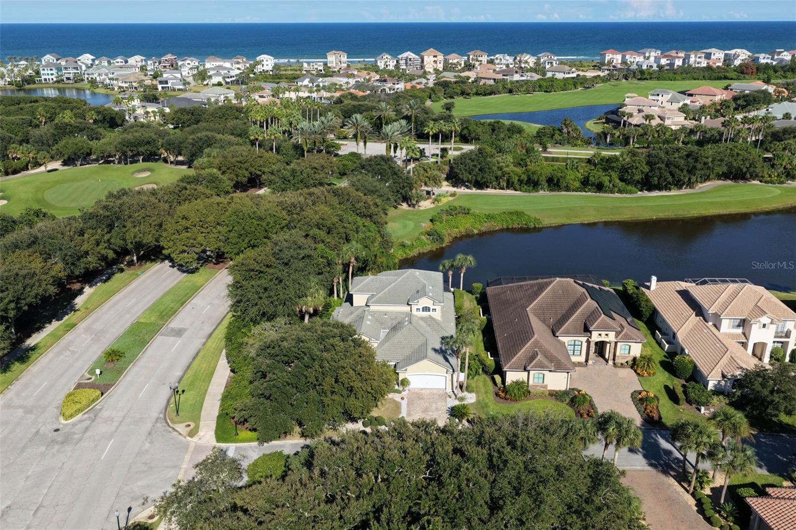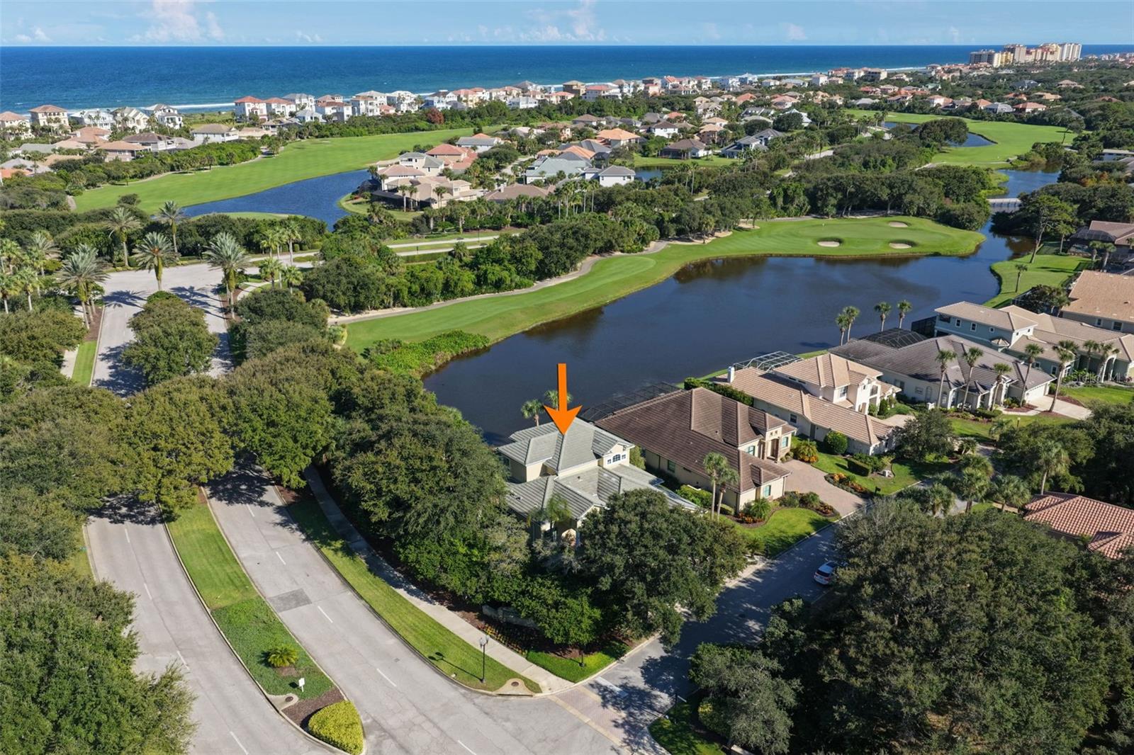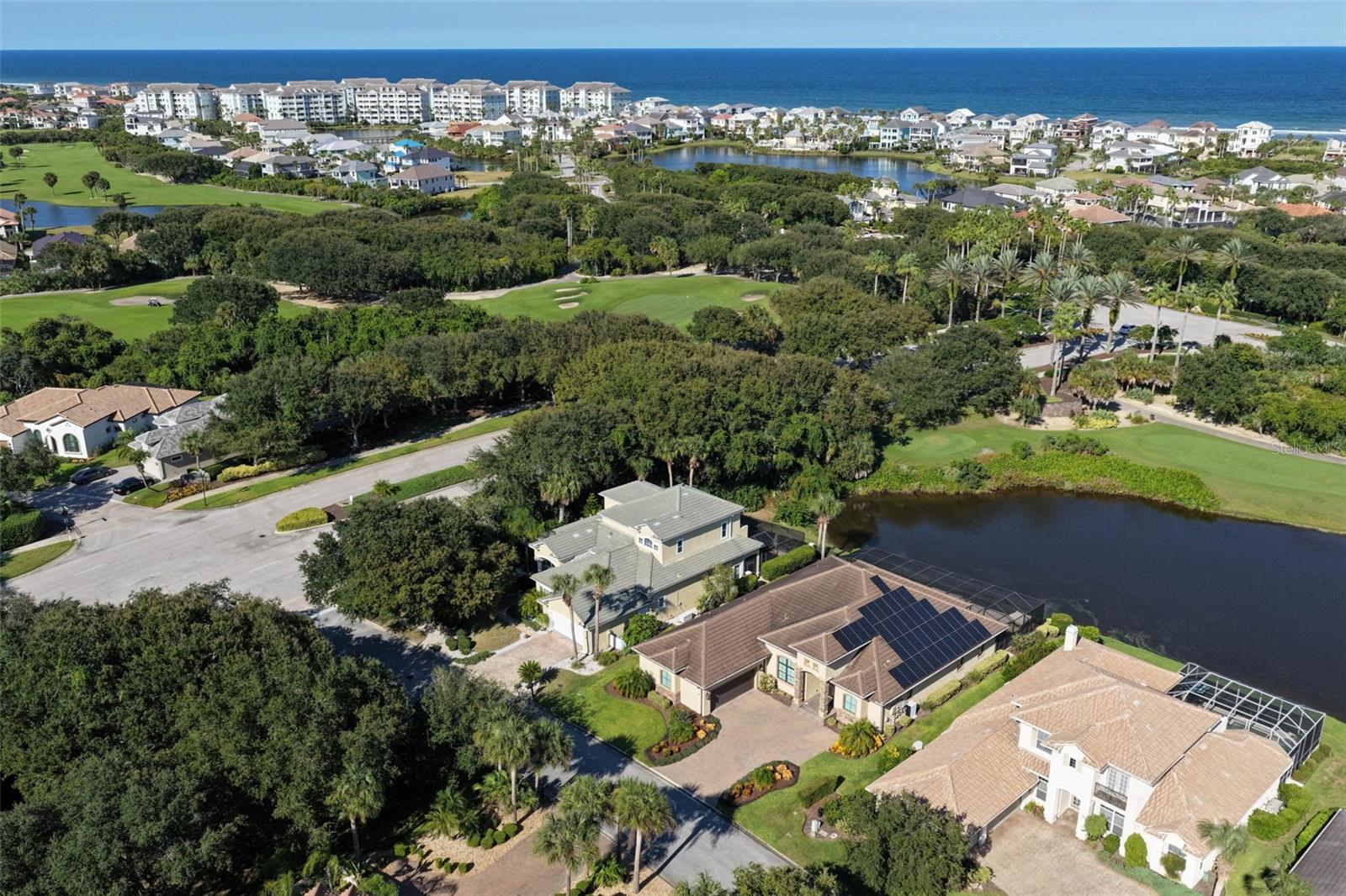 Experience the ultimate in golf, lakefront, and coastal living at 3 Flagship Drive. Perfectly positioned on the 4th fairway and lake of the Jack Nicklaus Signature Ocean Course, this exceptional residence offers over 3, 600 sq. ft. of luxurious living space with 3 bedrooms, 2.5 bathrooms, a versatile office (or potential 4th bedroom), and timeless architectural detail. As you arrive, you’ll be greeted by a classic tile roof, paver driveway, and elegant French doors leading into a foyer with inlay tile accents. The private study with hardwood floors sits just off the entry, while the open-concept living area unfolds in front of you — bathed in natural light from expansive windows and sliding glass doors. Soaring tray ceilings with crown molding and a seamless flow to the gourmet kitchen set the tone for refined living. The kitchen is a chef’s delight, featuring a large island, granite countertops, tile backsplash, stainless steel appliances, wine refrigerator, built-in oven, and custom cabinetry. A breakfast nook with plantation shutters and a separate workspace add both charm and functionality. The main-floor primary suite is a serene retreat, complete with plush carpet, patio access, and a spa-like bath offering a soaking tub, floor-to-ceiling tiled walk-in shower, dual vanities, and a spacious walk-in closet. Upstairs, hardwood stairs lead to a bright loft-style living area with a dry bar, two additional exceptionally large bedrooms, a full bath with dual vanities, and a private balcony with sweeping views of the lake, fairway, and ocean breezes. Outdoor living shines with a screened-in pool and spa, surrounded by ample patio space for entertaining or relaxation, all set against a backdrop of lush golf course greens and tranquil water views. This home also features a 2025 pool heater, a buried propane tank, and a whole-house generator, ensuring year-round comfort, efficiency, and peace of mind. Located within Ocean Hammock, a popular gated community just moments from the pristine coastline, this property offers the perfect balance of comfort, privacy, and resort-style living. Whether you’re an avid golfer, a beach lover, or simply seeking a peaceful retreat, this home delivers it all.