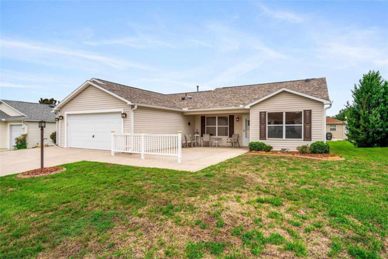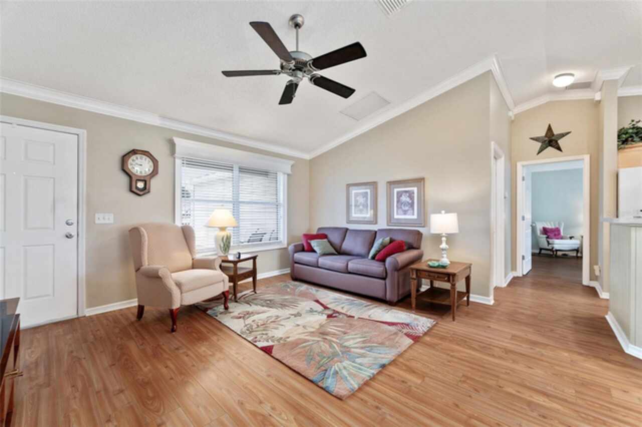 *** ROOF 2023*** TURNKEY meaning all furniture is included!! Welcome to this stunning AMARILLO model located in the highly sought-after Village of Caroline, just minutes from the vibrant Sumter Landing Square. This beautifully maintained home exudes charm from the moment you arrive, featuring a welcoming front patio perfect for relaxing or entertaining. Inside, you’ll find gorgeous luxury vinyl plank flooring throughout the main living areas, crown molding that adds an elegant touch, and a bright, open floor plan designed for comfortable living with 2 solar tubes. HVAC 2018. The kitchen boasts a gas stove, ideal for the home chef, and the home offers ample space with a two-car garage plus a dedicated golf cart garage and a very LOW BOND. Whether you're looking to enjoy the active Villages lifestyle or simply unwind in comfort, this home has it all. Conveniently located near CR 466, you're just moments away from top-notch dining, shopping, and entertainment options making this home truly a Villager's dream!