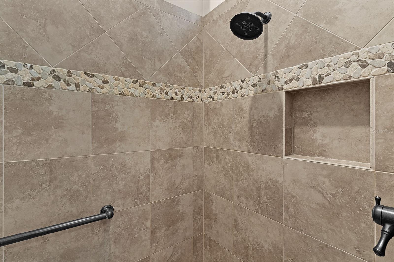 One or more photo(s) has been virtually staged. Welcome to this beautifully expanded Laurel Oak model in the desirable Fenney Village of The Villages, Florida. Offering 3 bedrooms, 2 bathrooms, and 2, 309 sq ft, this meticulously maintained home blends thoughtful upgrades with elegant design. This home has ROOM FOR A POOL and also has a POND VIEW. The exterior features Landmark Designer premium shingles, full-house gutters, and enhanced, weather-tolerant landscaping accented with burgundy Seminole chip rock. A painted driveway, charming sitting porch, and screened entry create a warm welcome. The oversized 28' x 23' garage accommodates two large vehicles plus a golf cart, with additional storage, attic access with pull-down stairs, thermal attic insulation, attic fan, and vented garage door for improved comfort. The house faces Northwest, so there is no direct sun on either the garage or the lanai. Inside, enjoy high ceilings, wood-look tile flooring, carpeted bedrooms, and tray ceilings in both the front guest room and the luxurious primary suite. The home is equipped with a Pegasus whole-house filtration system, new matching contemporary quartz countertops, pull-outs throughout the kitchen and primary closet, crown molding, built-in entertainment center with bookcases, and plantation shutters on every window. Four solar tubes—two with night lights—brighten the living spaces. The laundry room offers an additional office area and built-in cabinetry. The kitchen showcases light-colored cabinetry, stainless steel appliances, a working island, porcelain sink, and ample storage. The primary suite includes a spacious roll-in Roman shower, while the guest bath features a tiled walk-in shower. A tankless water heater enhances efficiency. Relax and unwind in the expansive 52' x 14' lanai, complete with A pond view and pull-down shades for comfort. The four wall-mounted TVs convey with the home. Existing furniture is available separately. This exceptional home offers premium features, abundant storage, and serene water views—an ideal retreat in the heart of Fenney Village.